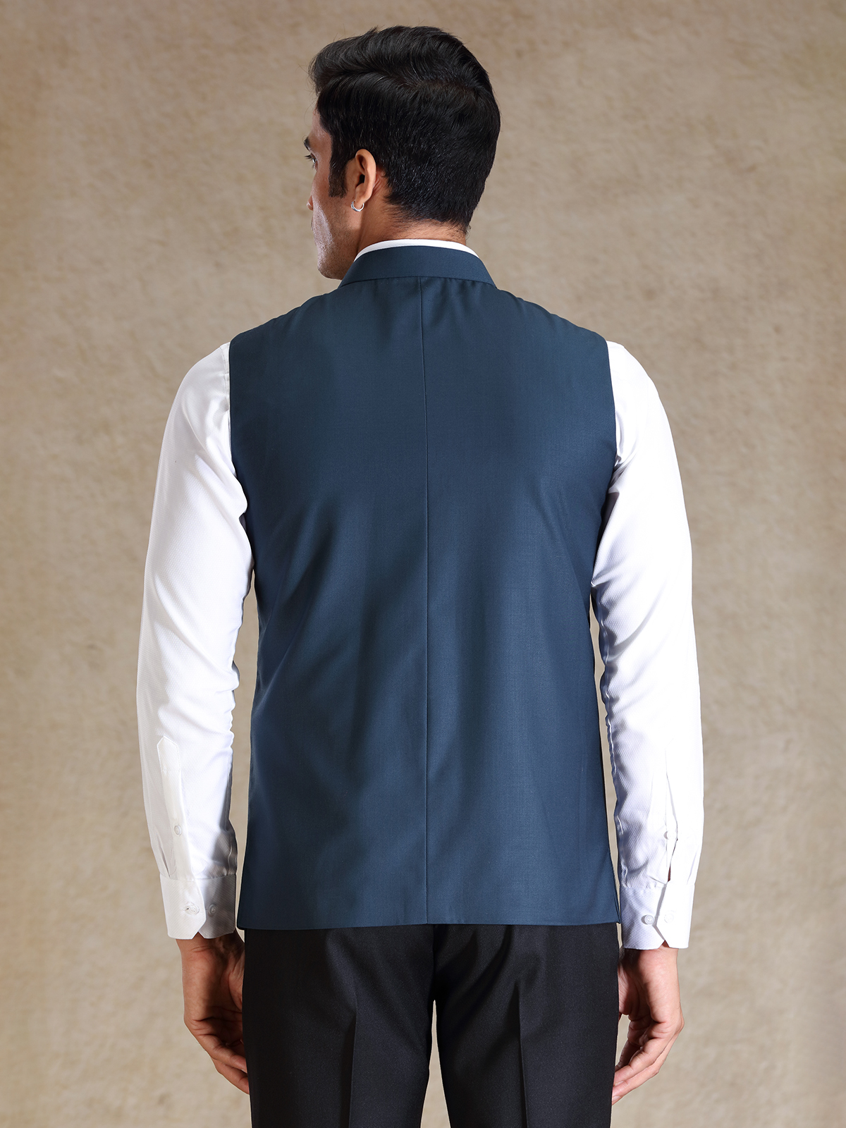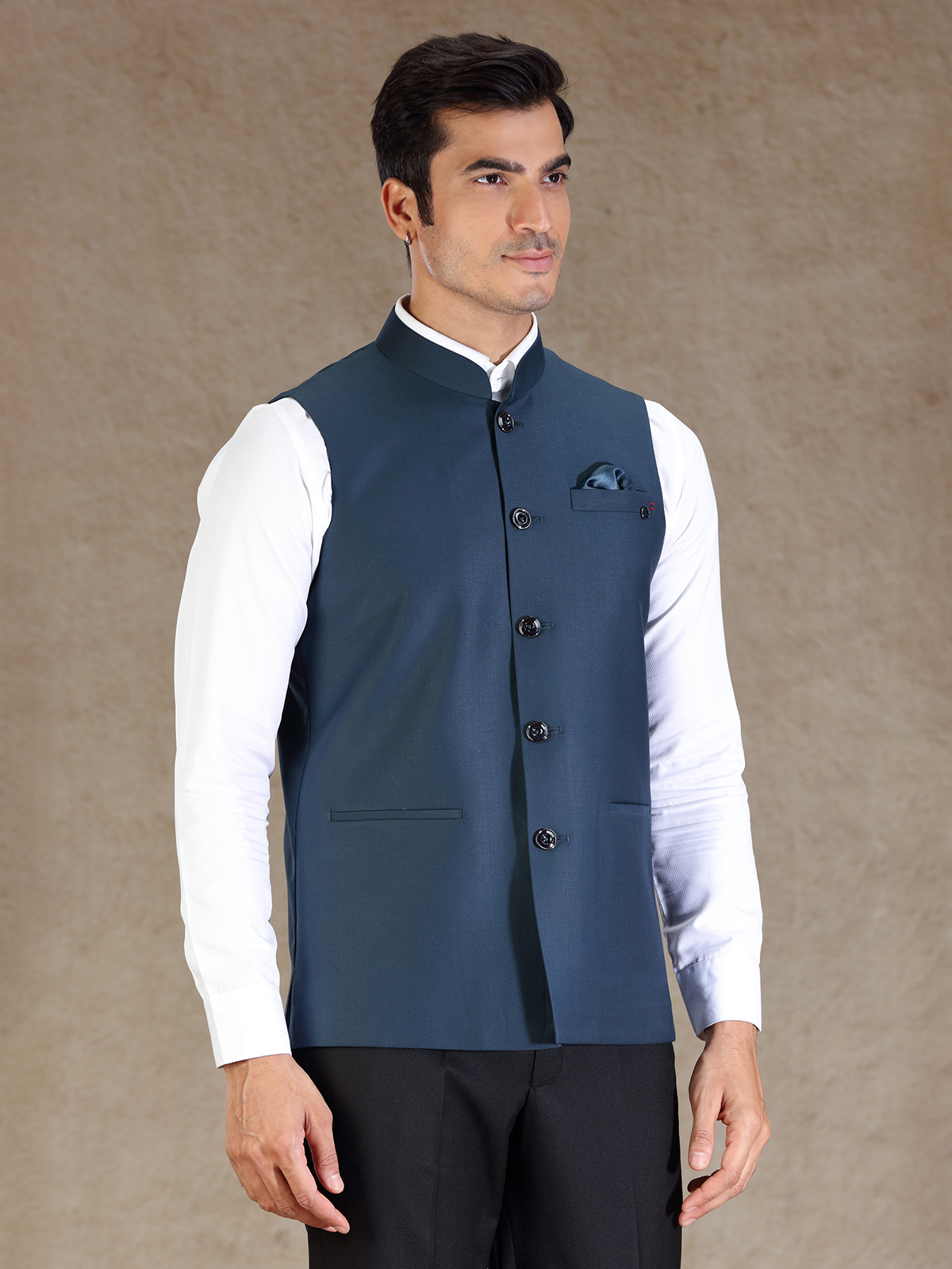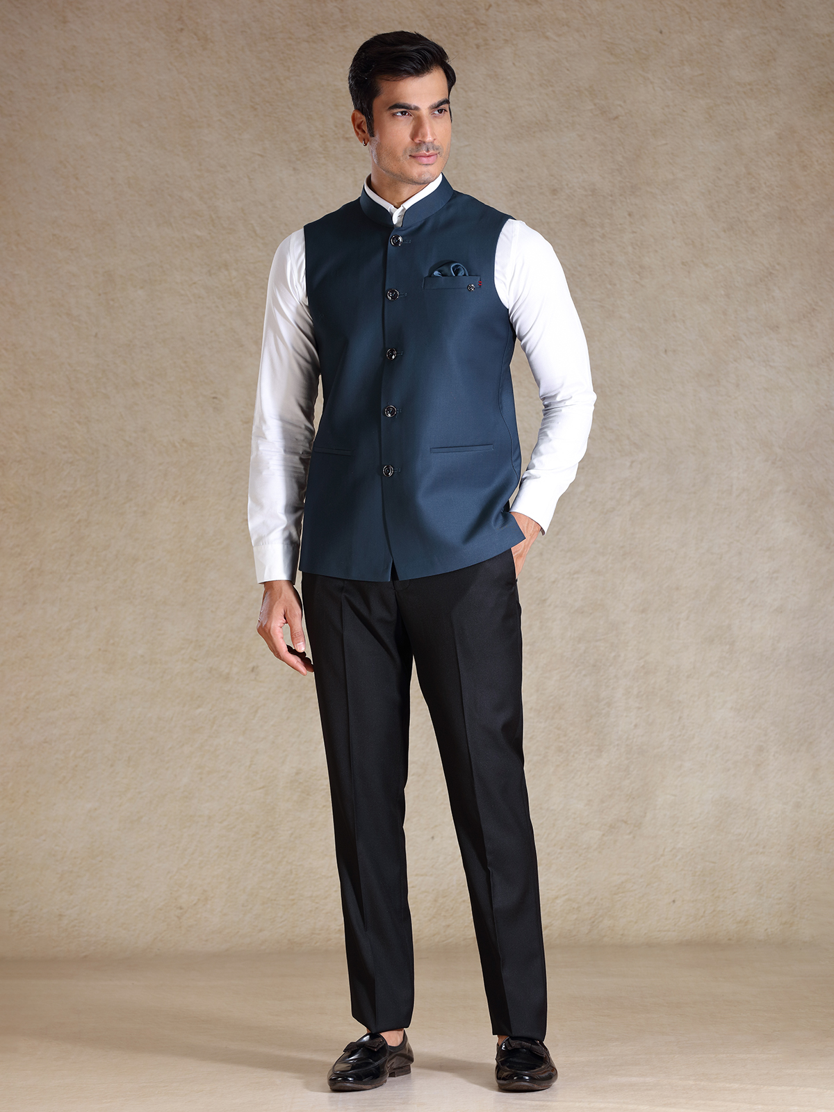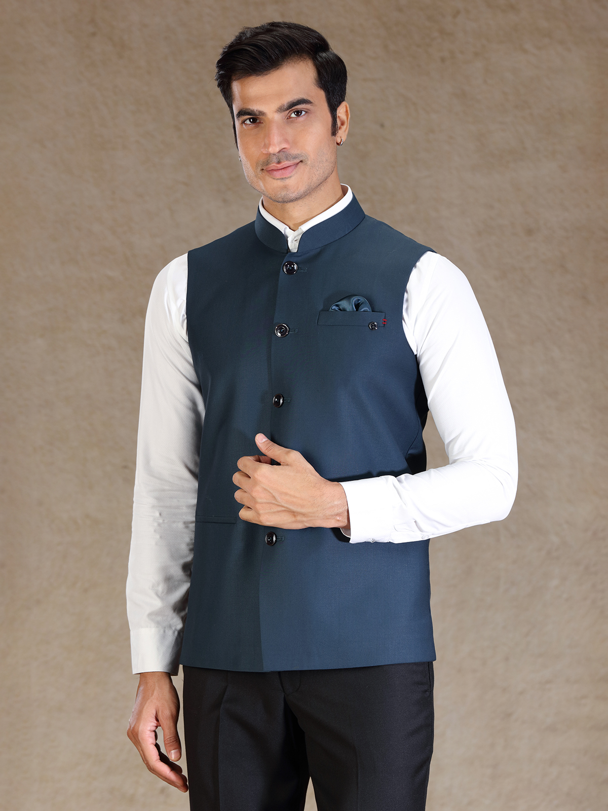 Achieve refined sophistication with this peacock blue waistcoat crafted from soft silk fabric. The elegant Bandhgala or Nehru jacket cut adds a luxurious touch, perfect for weddings and special festive events. Please note, product includes waistcoat only, shirt and pants are for styling reference.