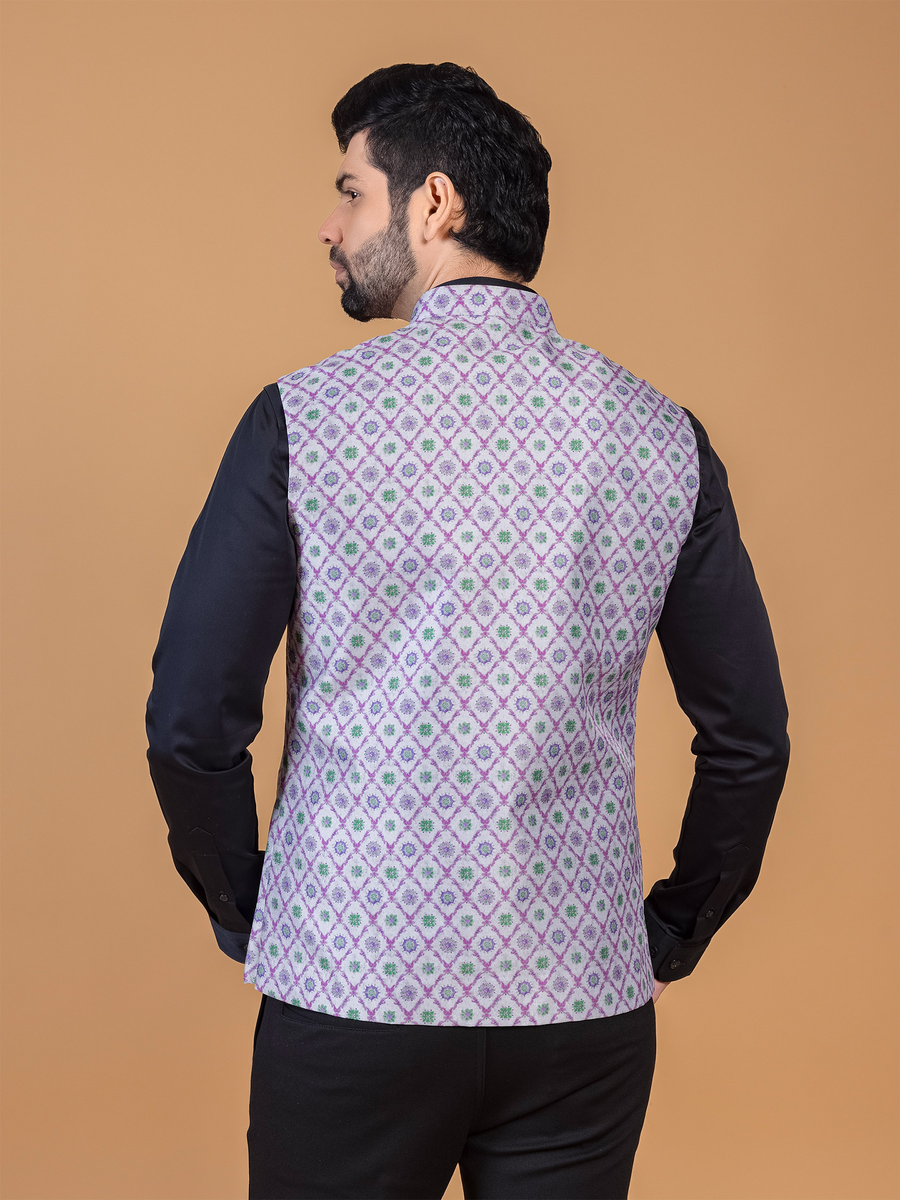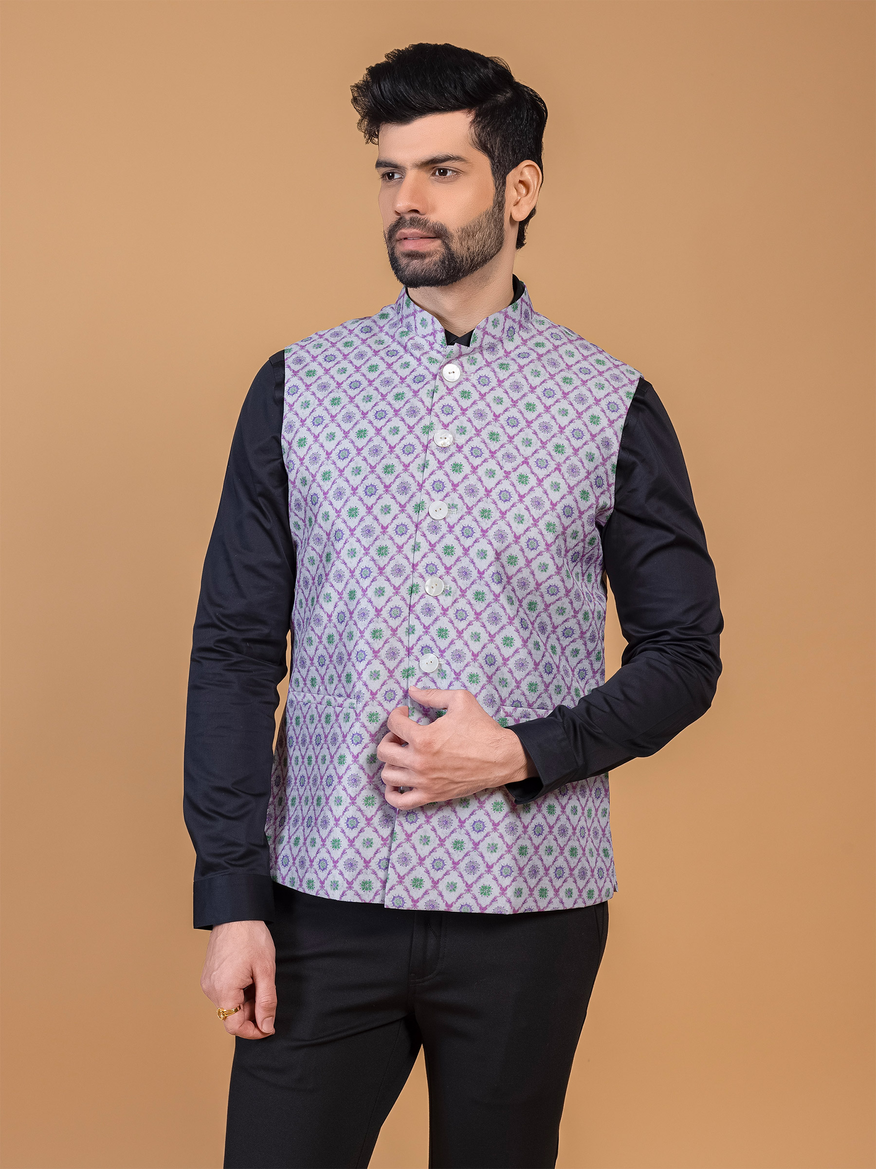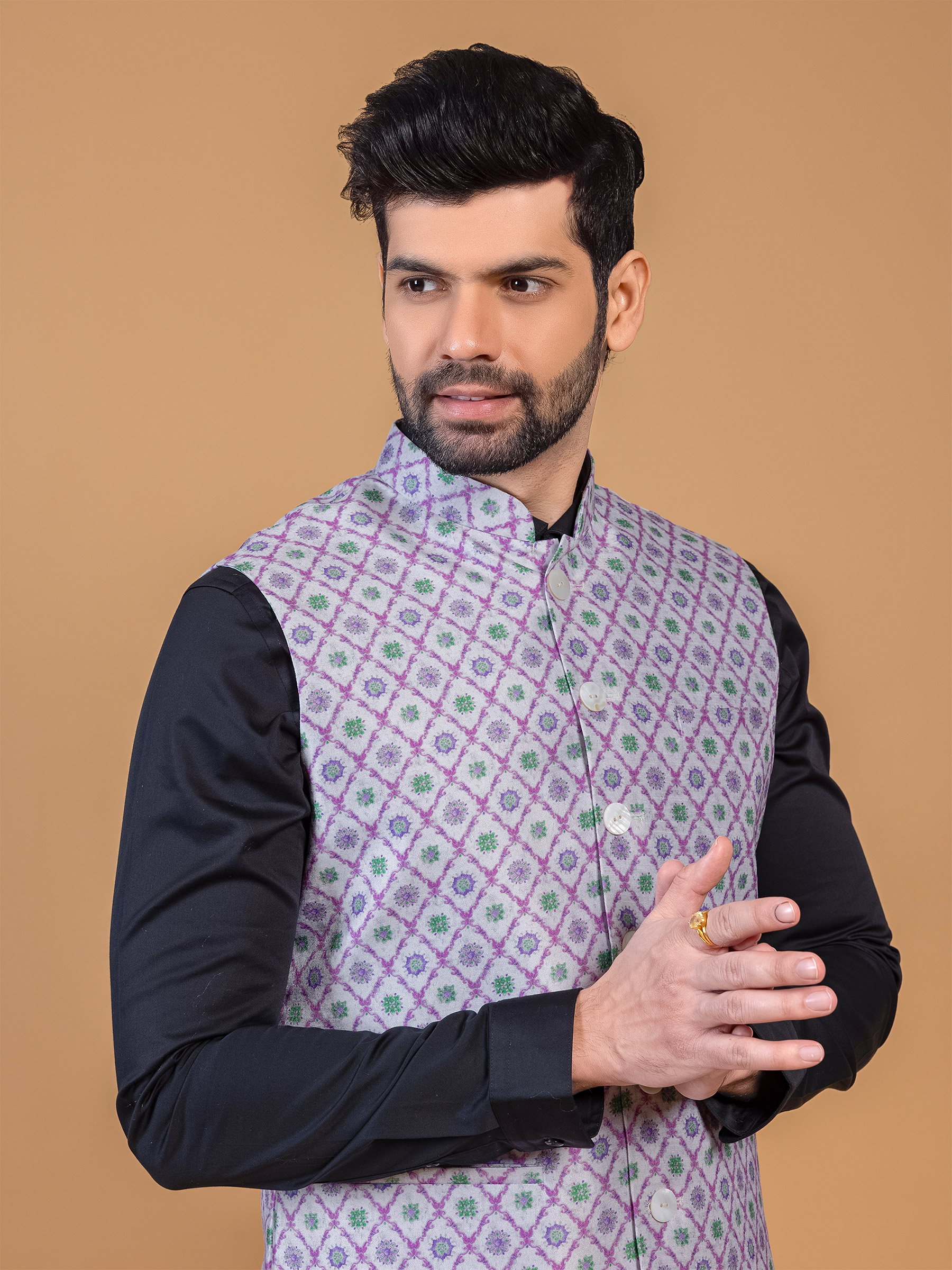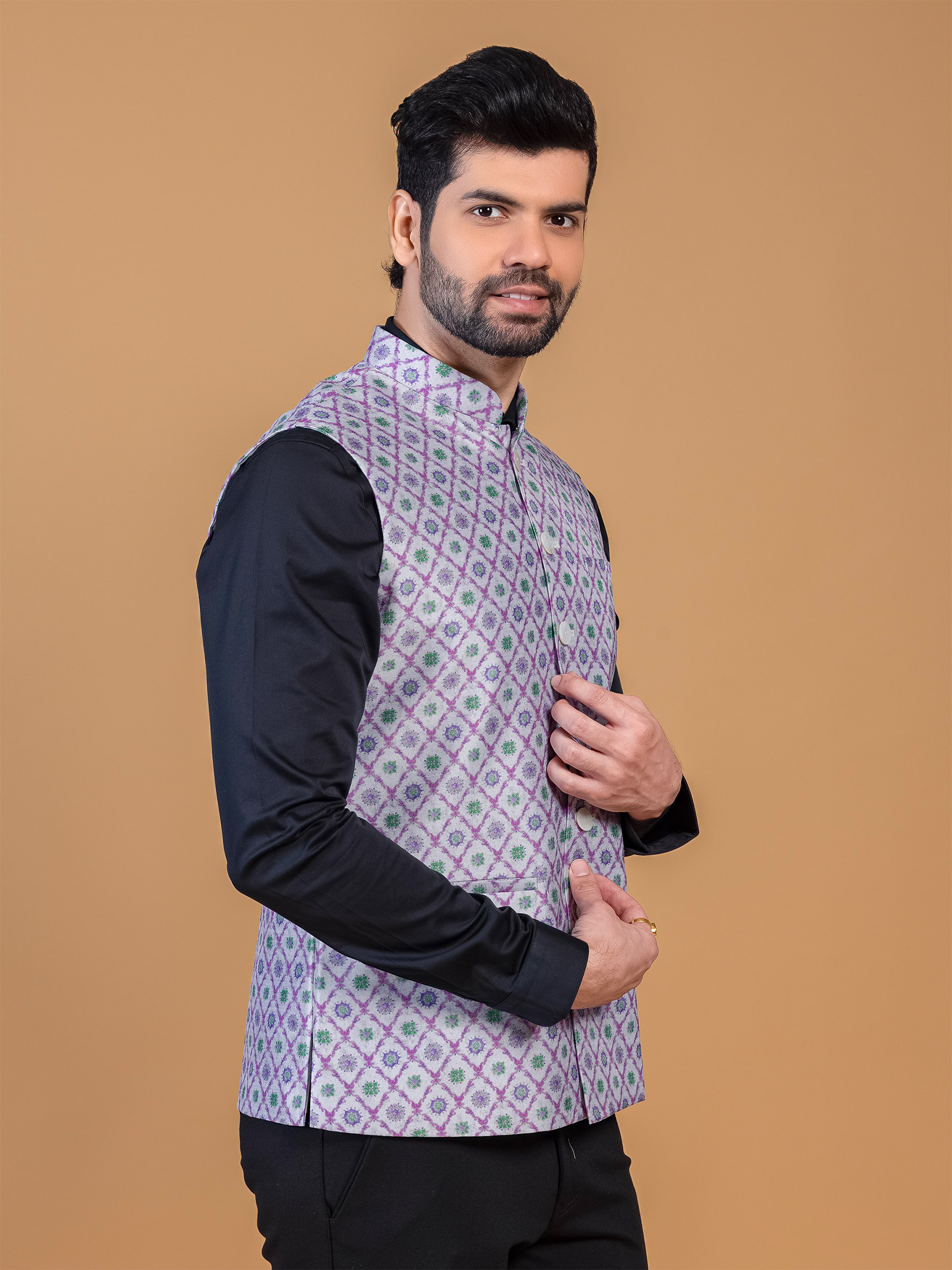 Step into tradition with this purple silk waistcoat adorned with printed designs, making it a perfect choice for traditional functions. The mandarin collar, sleeveless pattern, and fancy buttons at the front complete the look.
