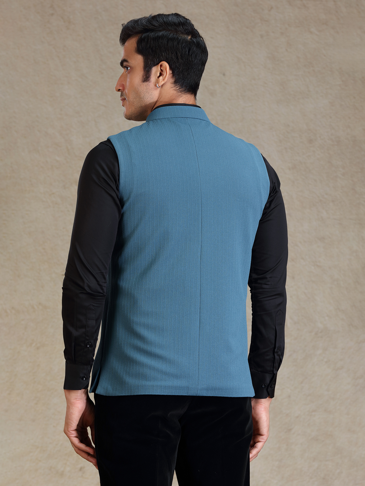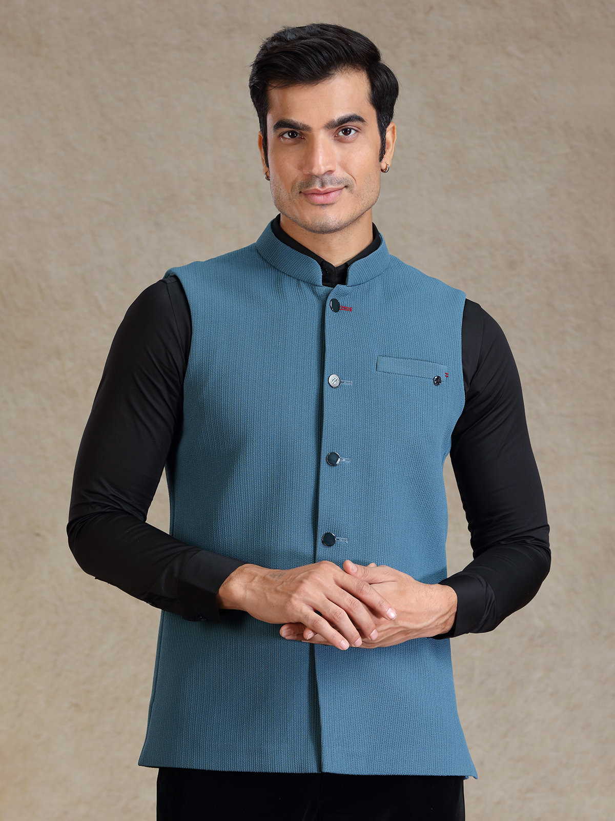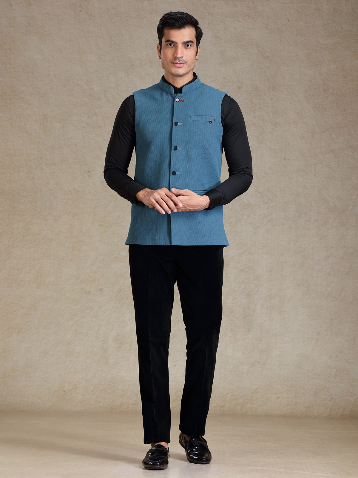 Stand out confidently with this rama blue waistcoat made from luxurious terry rayon textured fabric. The Bandhgala or Nehru jacket style adds a contemporary edge to a classic look, perfect for weddings and festive events. Please note, only the waistcoat is included; shirt and pants are for styling reference.