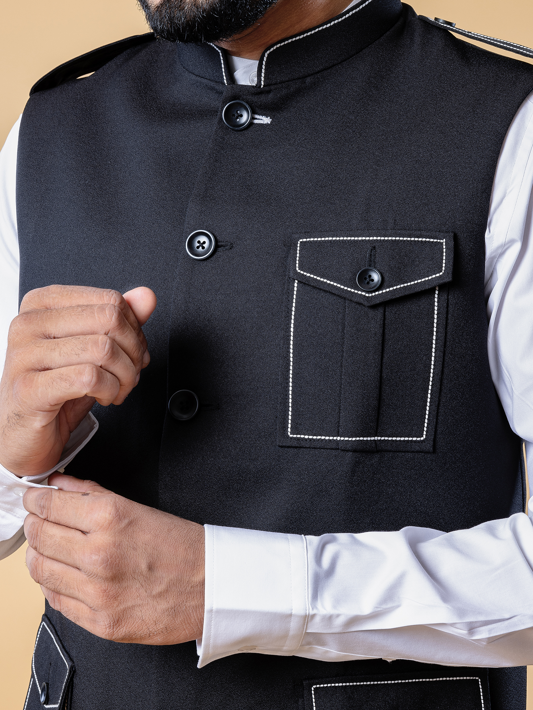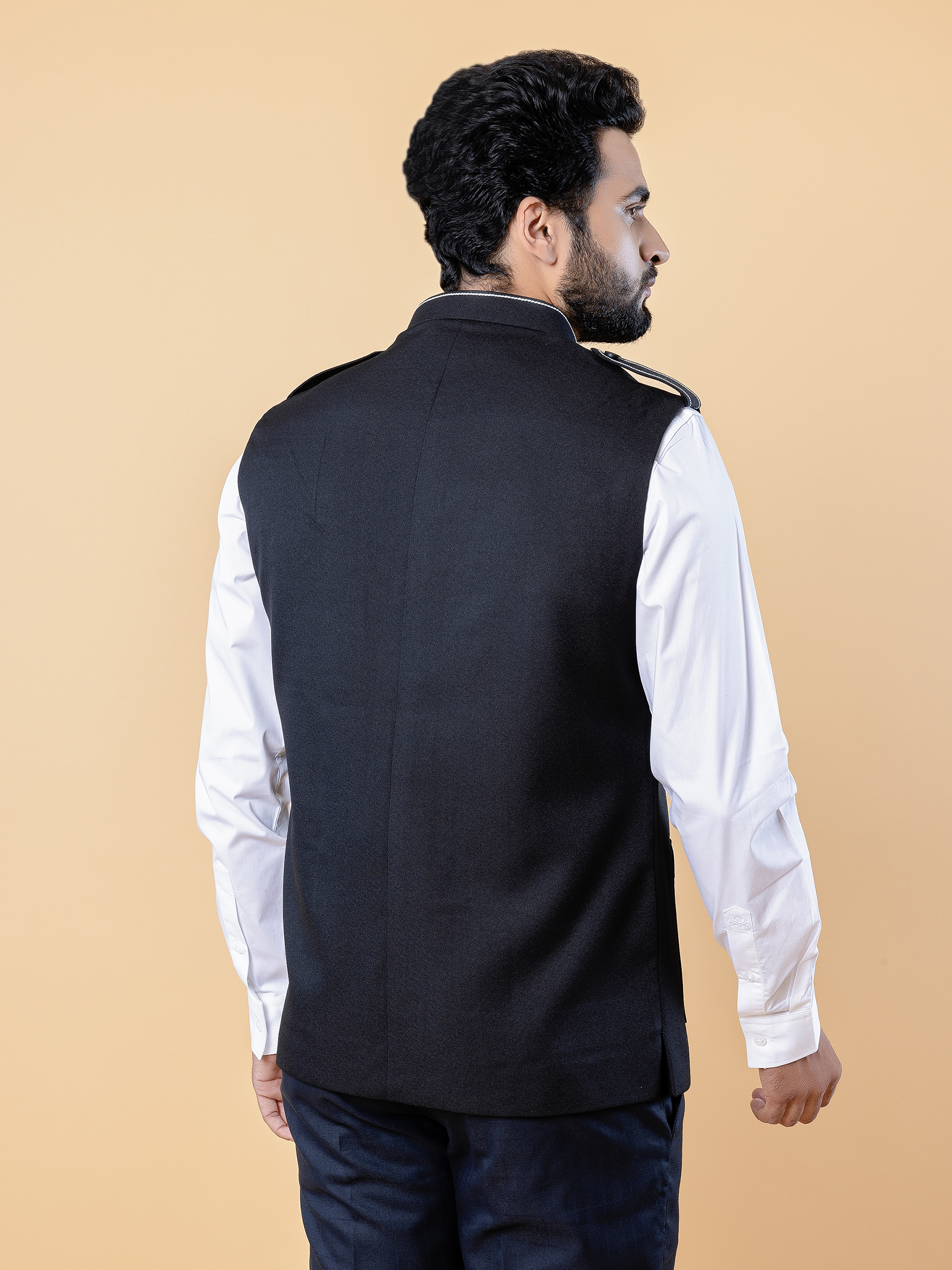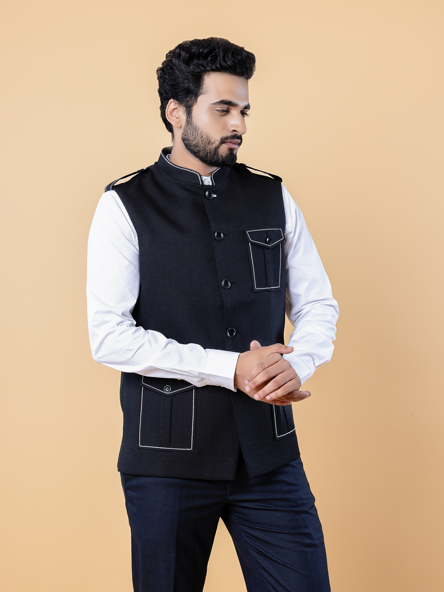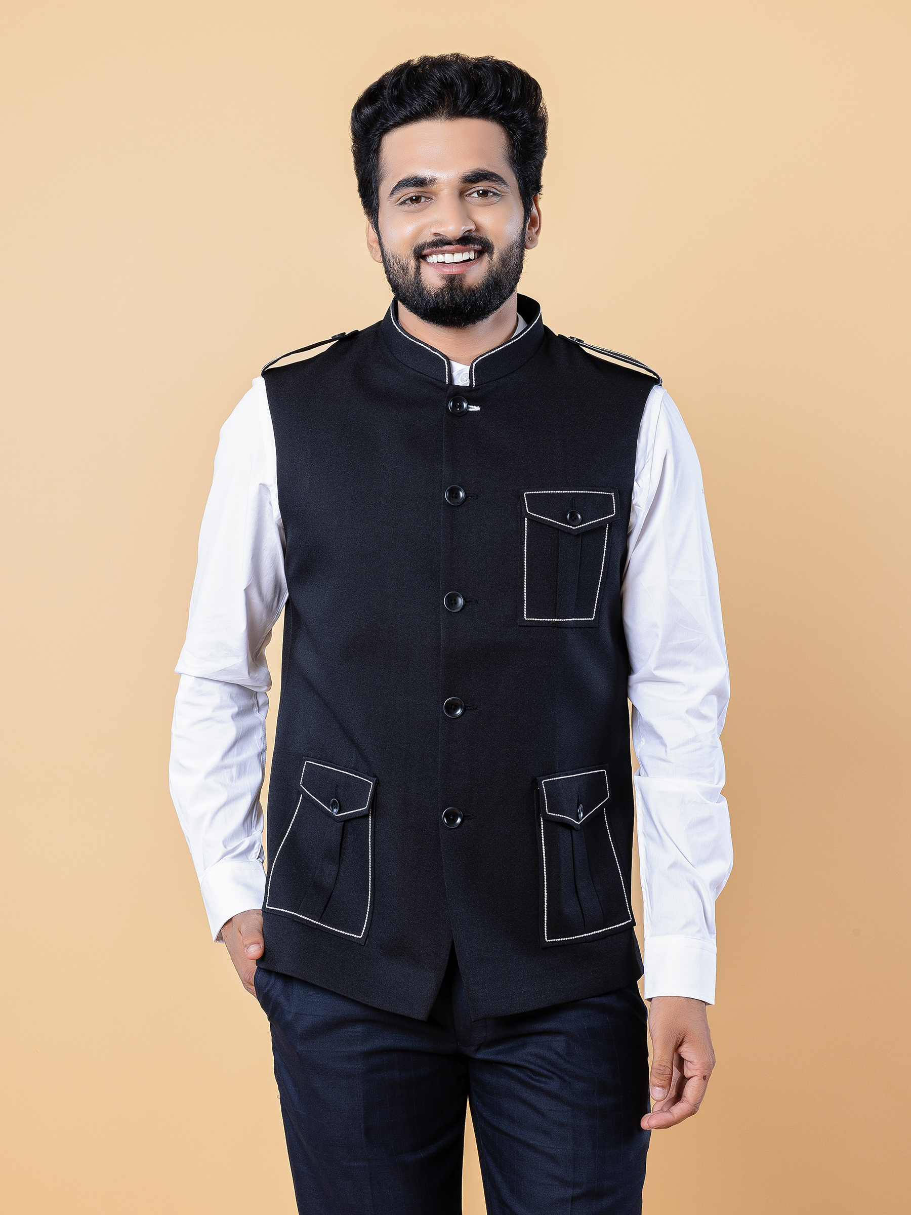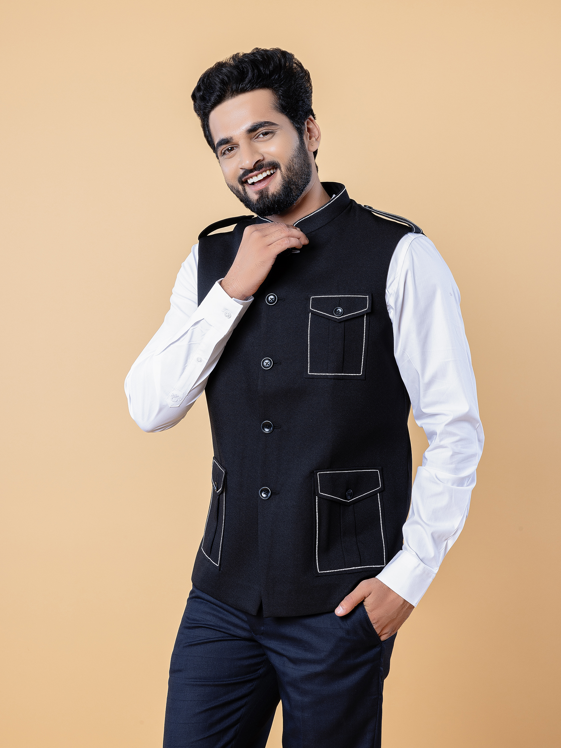 Make your presence known with this black waistcoat. Crafted with the terry rayon material. Adorned with plain pattern. Features with a mandarin collar, full buttoned placket, three patch pockets with flap and sleeveless pattern.