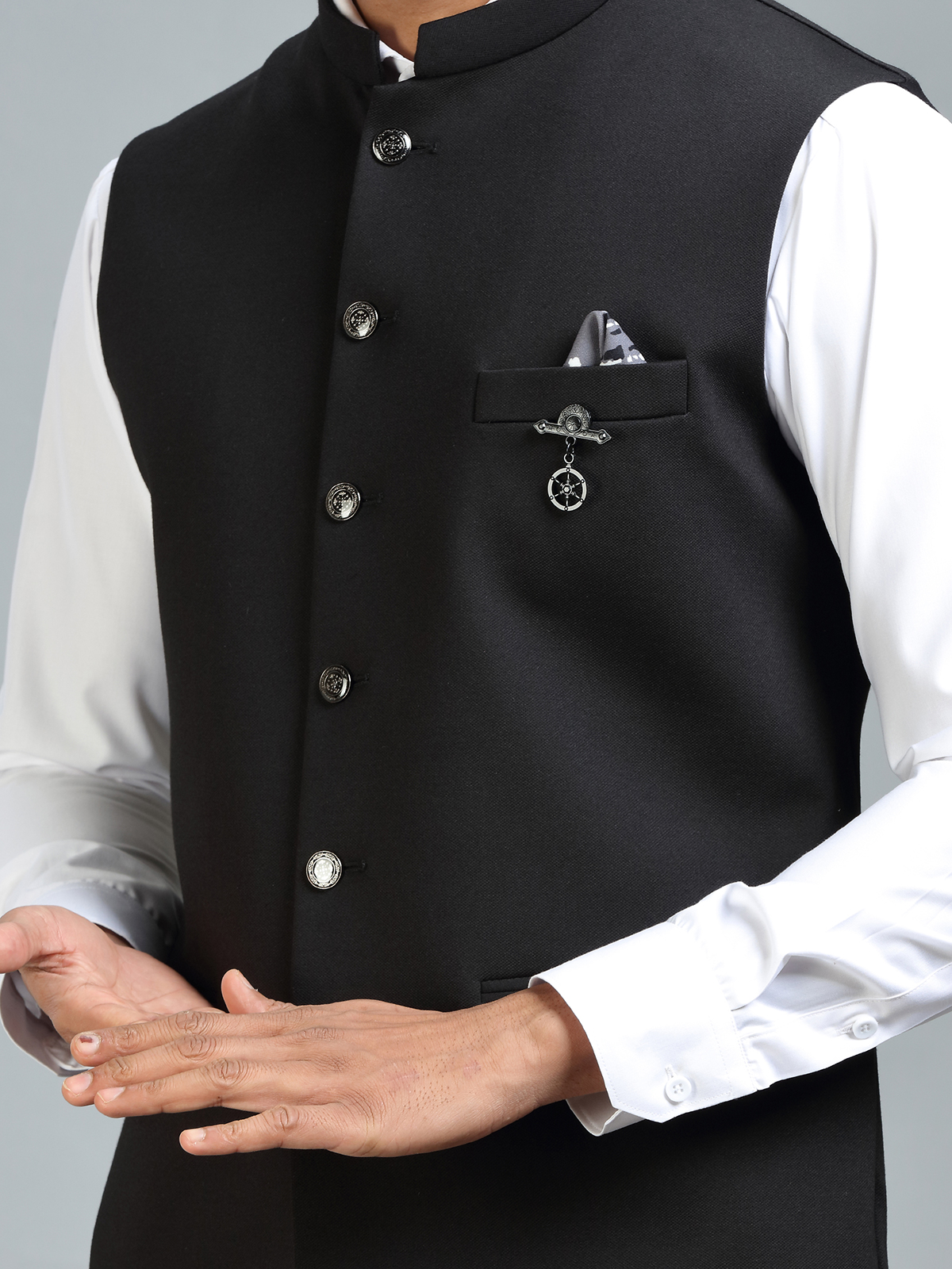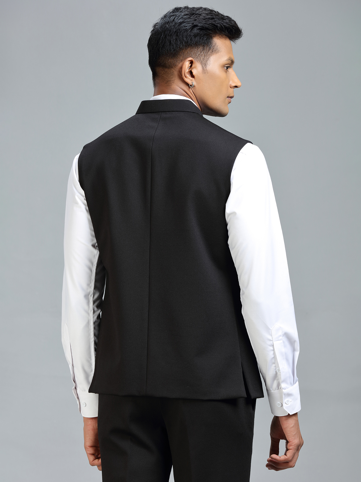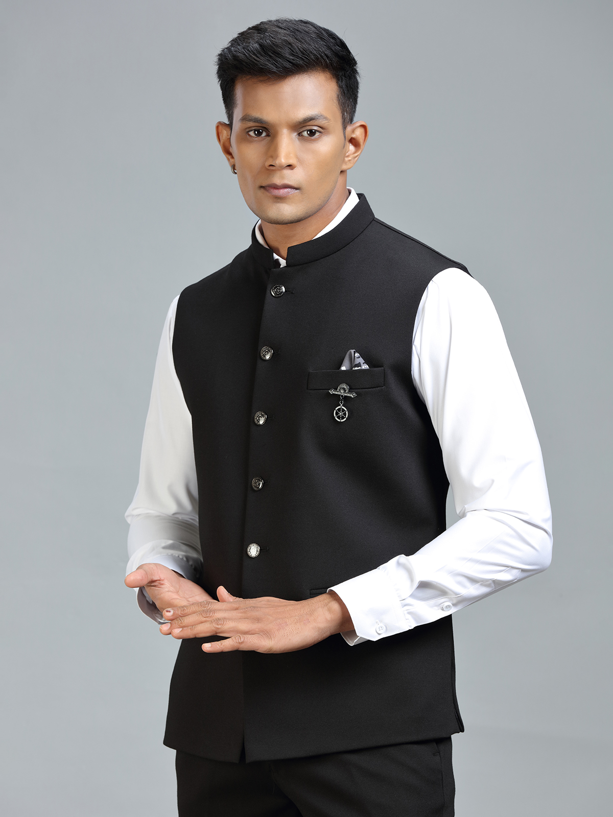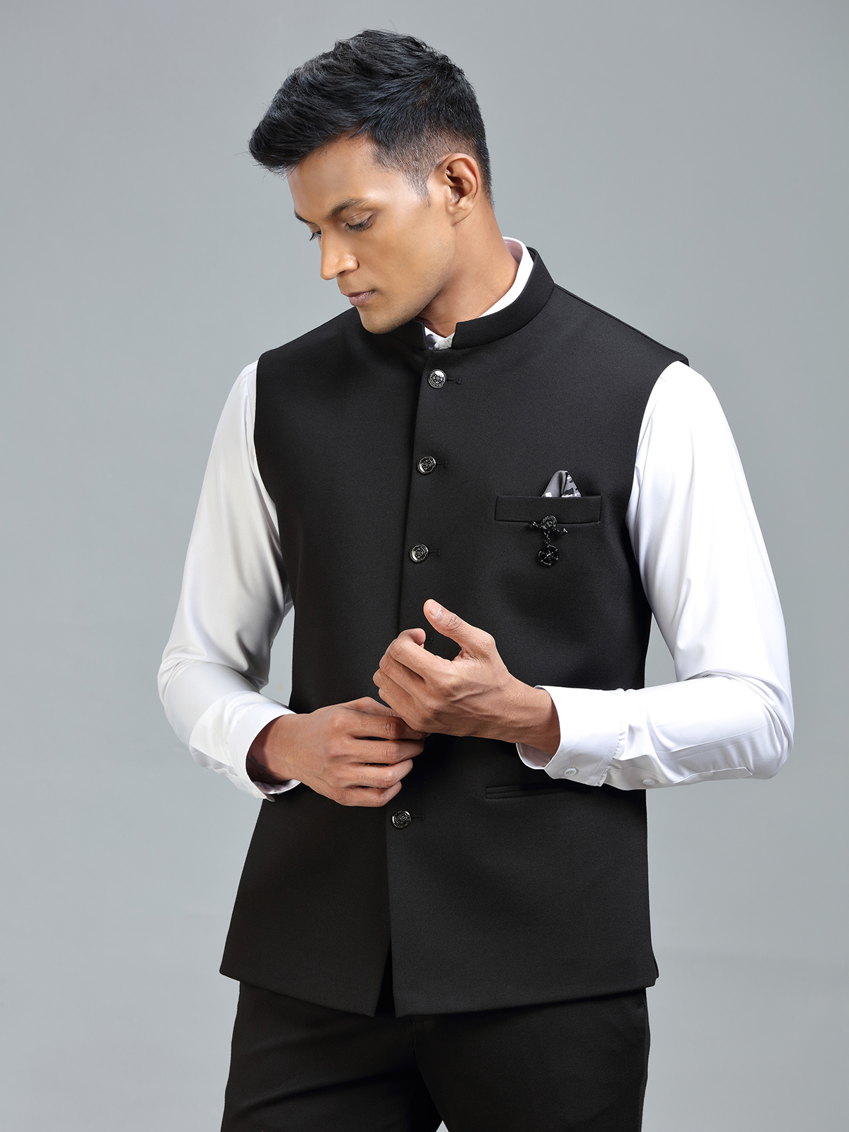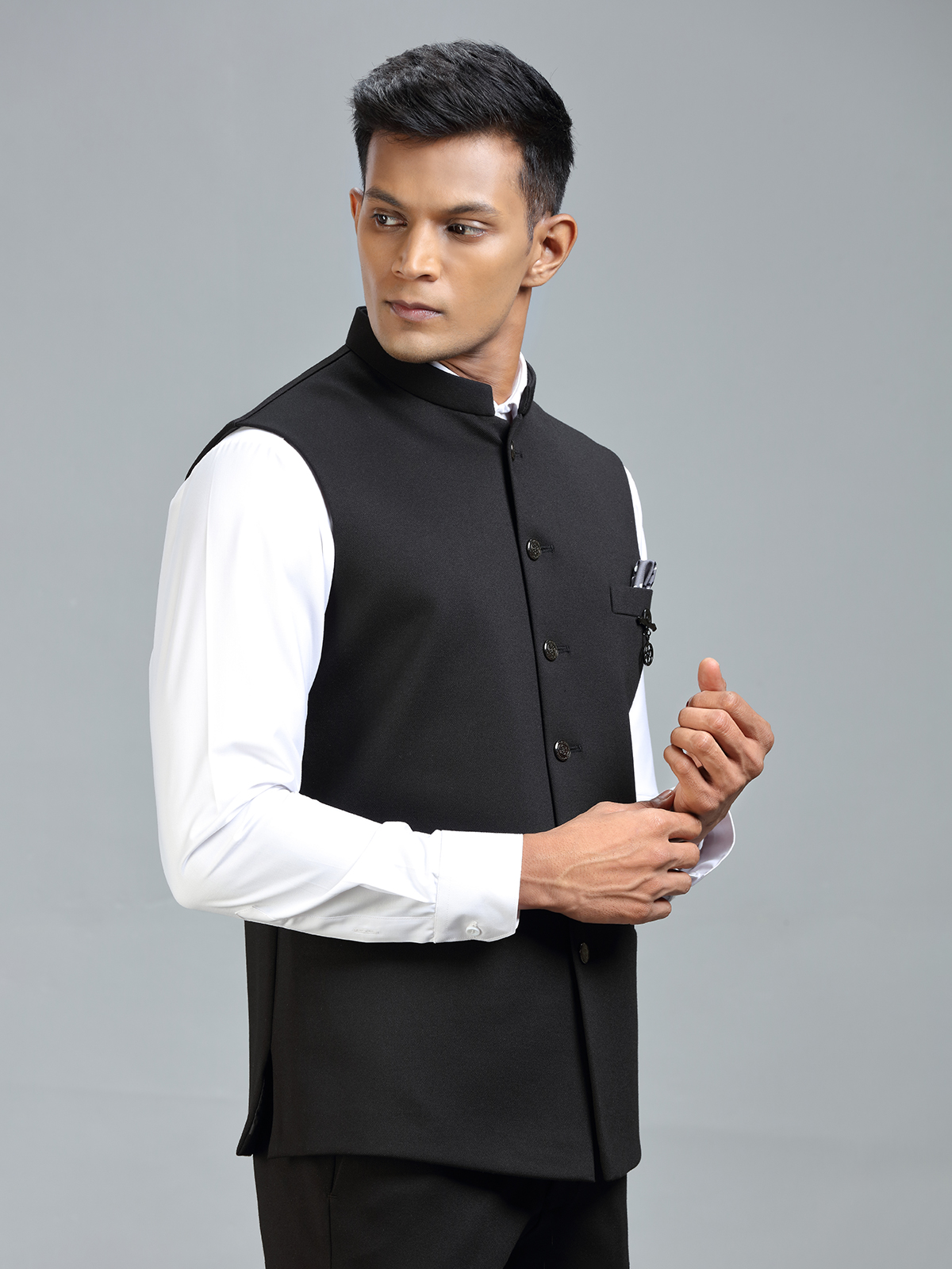 Elevate your festive wardrobe with the ultimate black waistcoat, crafted from premium terry rayon fabric. With a design that merges the traditional Bandhgala or Nehru jacket silhouette, this waistcoat offers a sophisticated and timeless look. Perfect for weddings and festivals, its soft, luxurious fabric promises both comfort and style, ensuring you stand out with class at any special event.