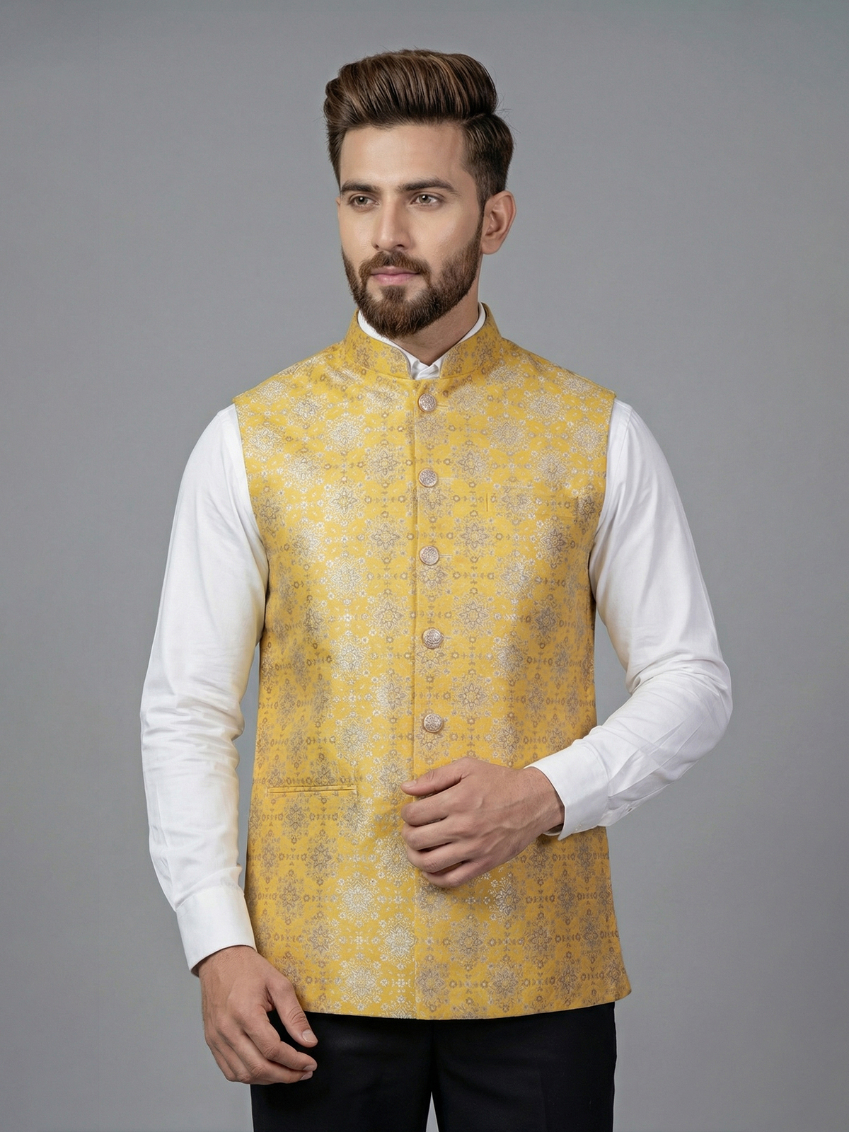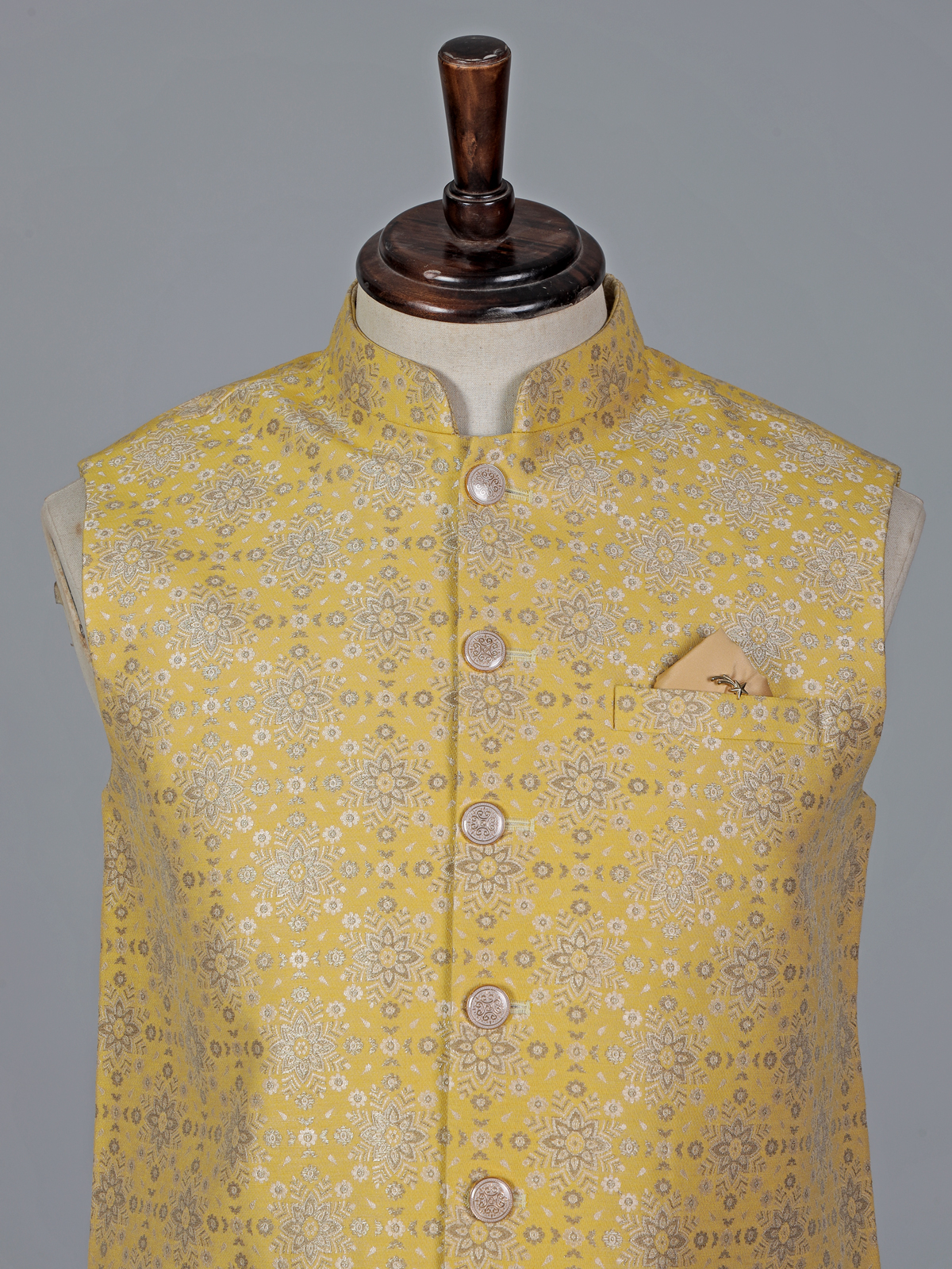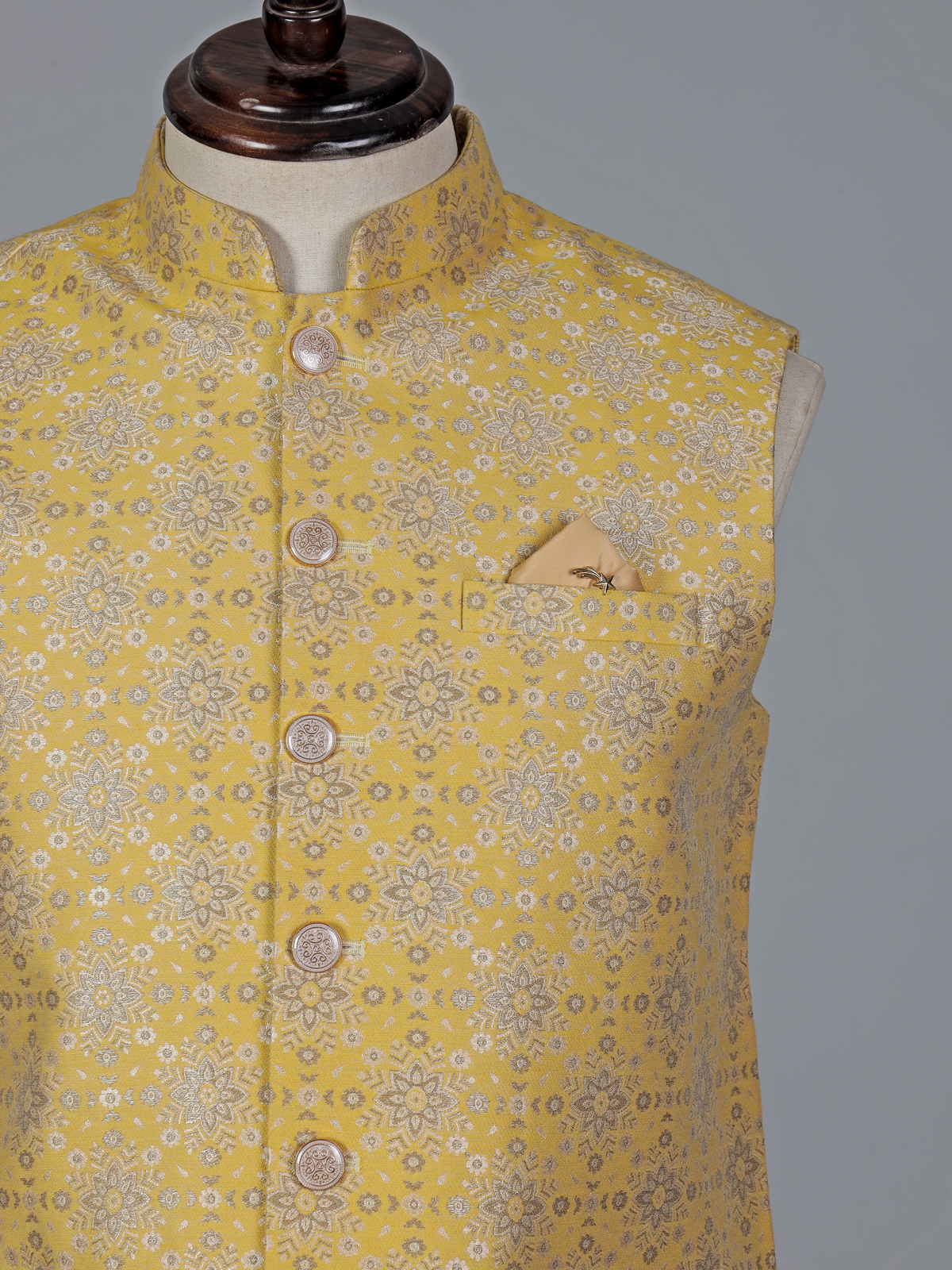 This yellow silk blend jacquard waistcoat is enriched with intricate zari work, making it a vibrant festive essential. Its rich texture and celebratory tone make it ideal for weddings, festive occasions, receptions, and haldi ceremonies.