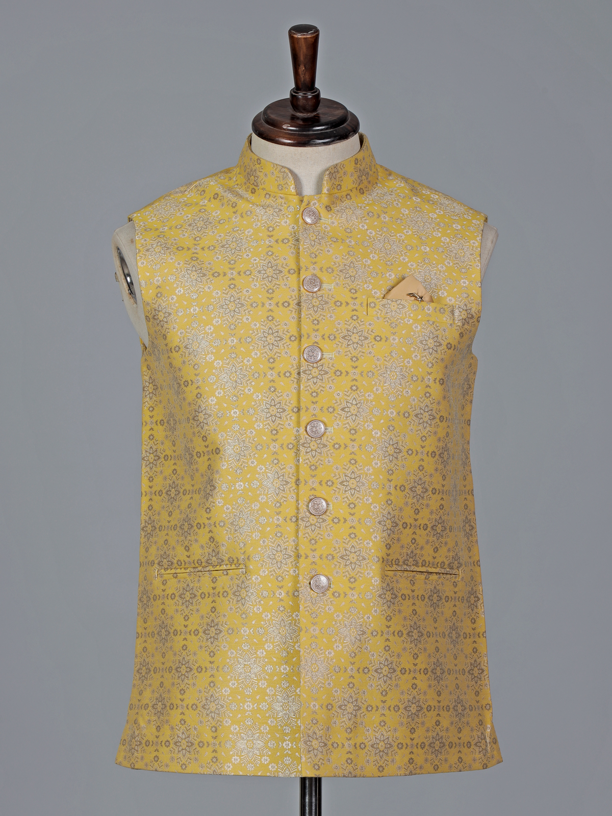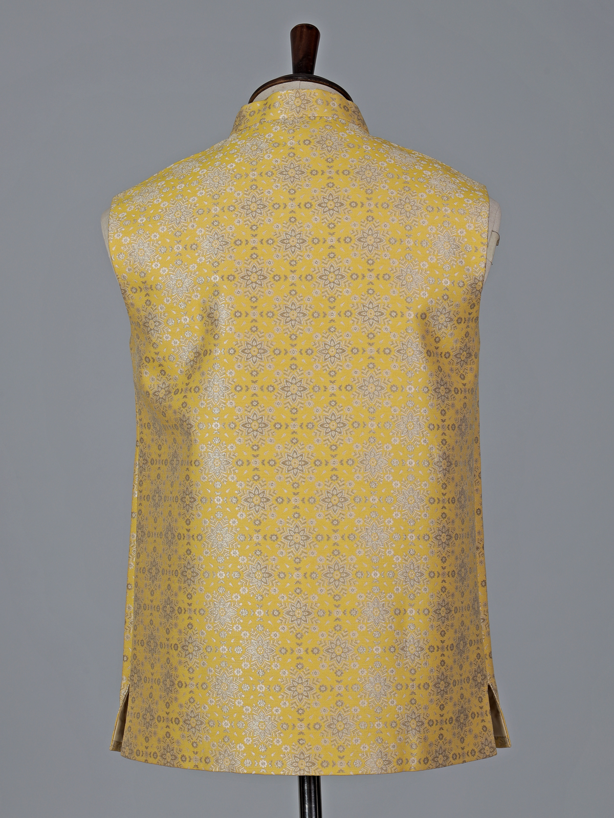 Yellow Silk Blend Jacquard Waistcoat With Zari Woven Charm