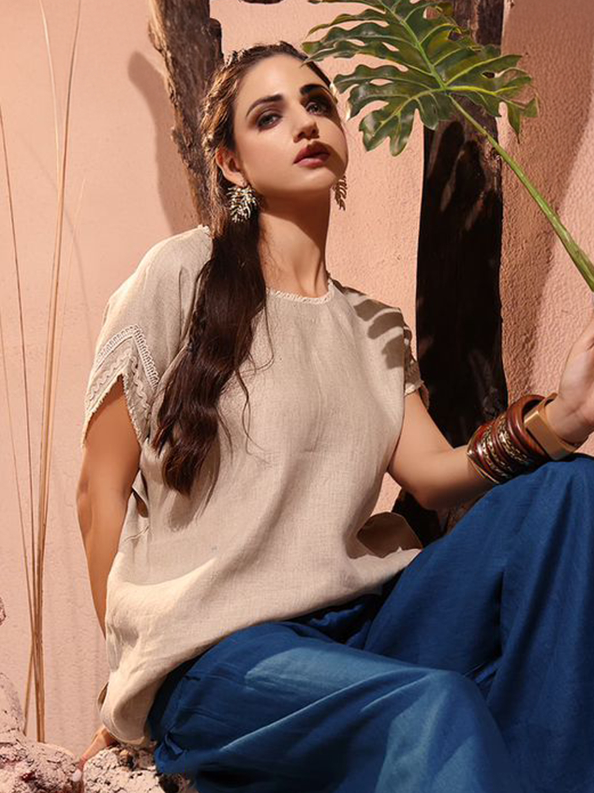 Stylish with an artistic touch, this beige co-ord set is designed in breathable linen fabric that provides comfort with a natural appeal. The relaxed-fit top features a round neckline, half sleeves enhanced with subtle thread detailing, and soft pintuck accents on the front. A striking print on the back adds a bold element, while the flowy blue wide-leg palazzo completes this chic ensemble, ideal for casual outings, resort wear, and contemporary day styling.