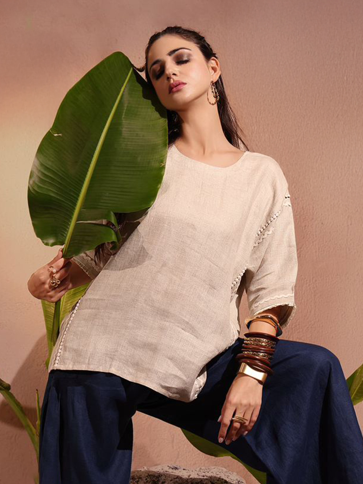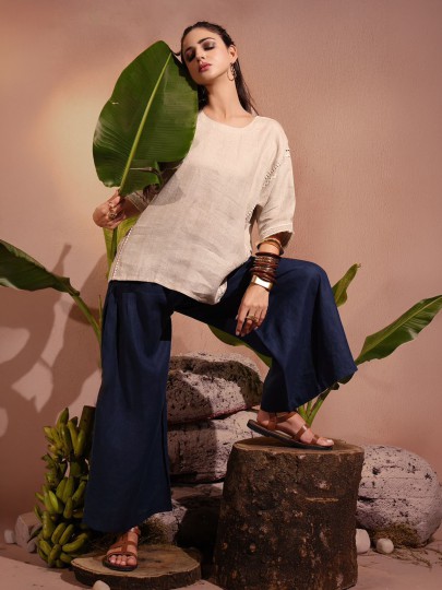 Elegant and creatively styled, this beige co-ord set is crafted from breathable linen fabric for a relaxed yet polished look. The top features a round neckline with front buttons and three-quarter sleeves accented with delicate thread work. A striking multicolored print artwork on the back adds a distinctive design element. Paired with flowing rust-red trousers, this outfit creates a modern and stylish look perfect for casual brunches, vacations, and contemporary daywear.