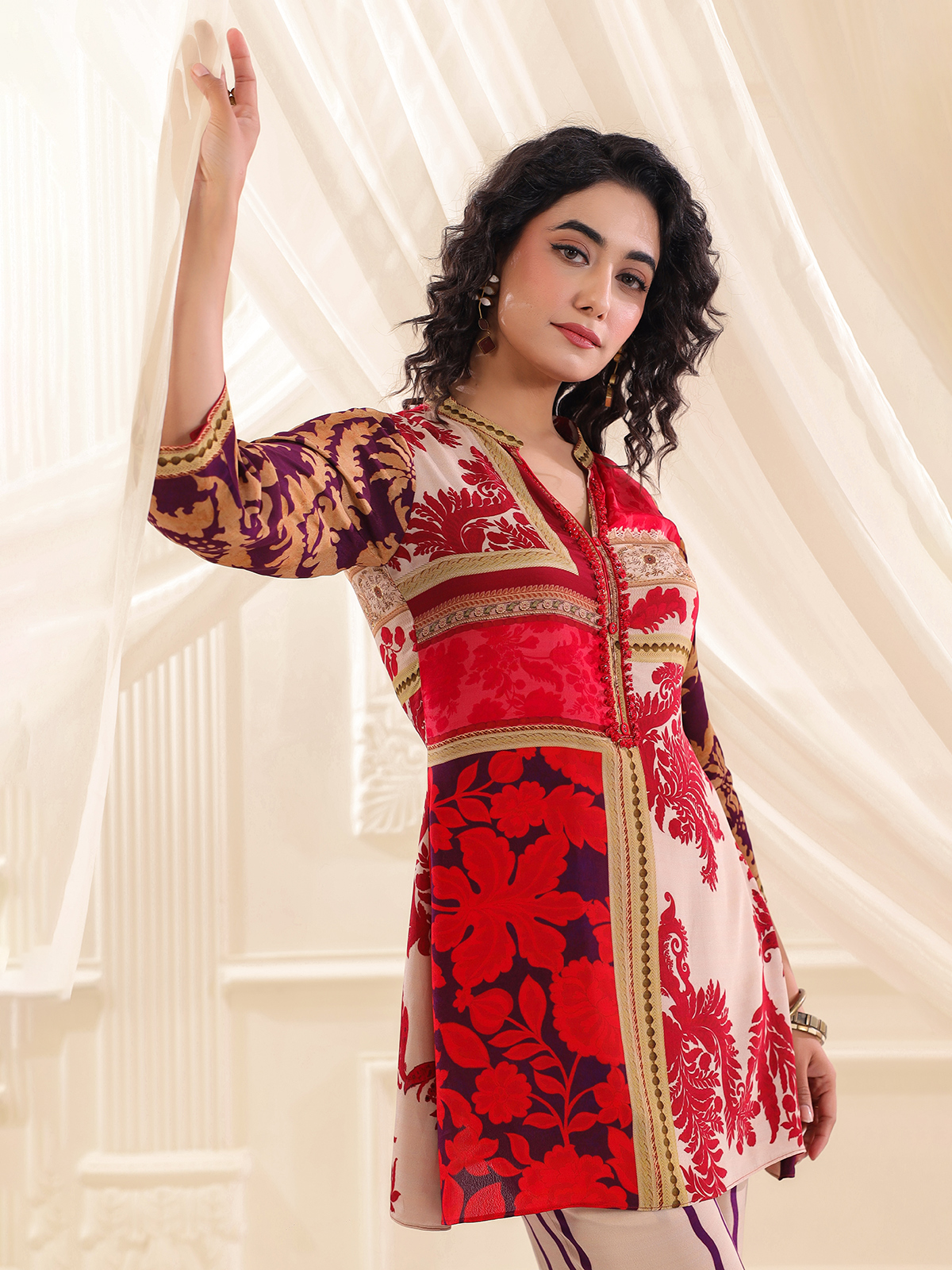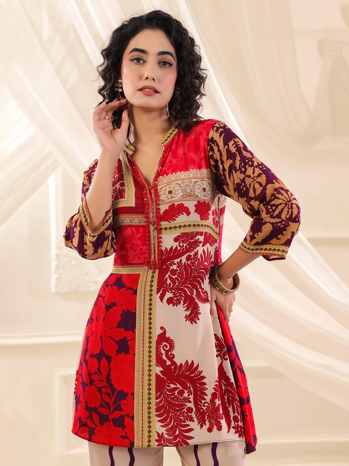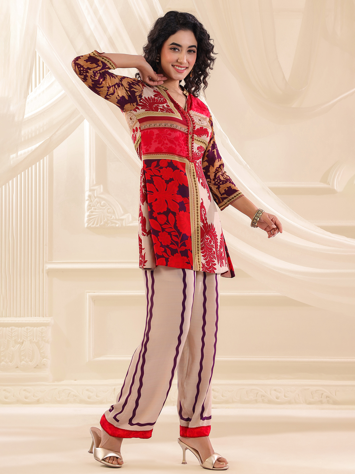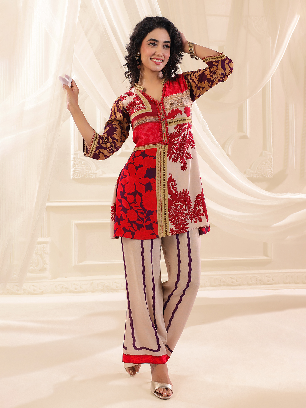 A striking fusion of beige and red defines this silk co ord set. Beautifully printed and adorned with sequins and bead accents. The stand collar and quarter sleeves lend a polished touch, while the tailored pants make it an ideal ensemble for festive flair and casual charm.