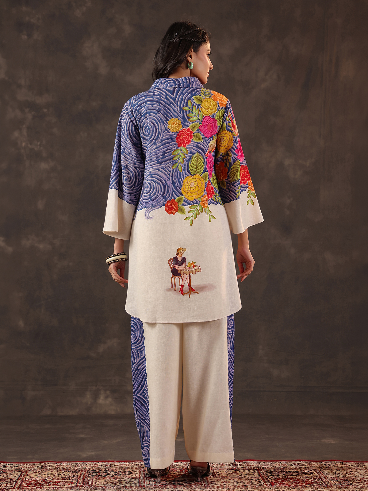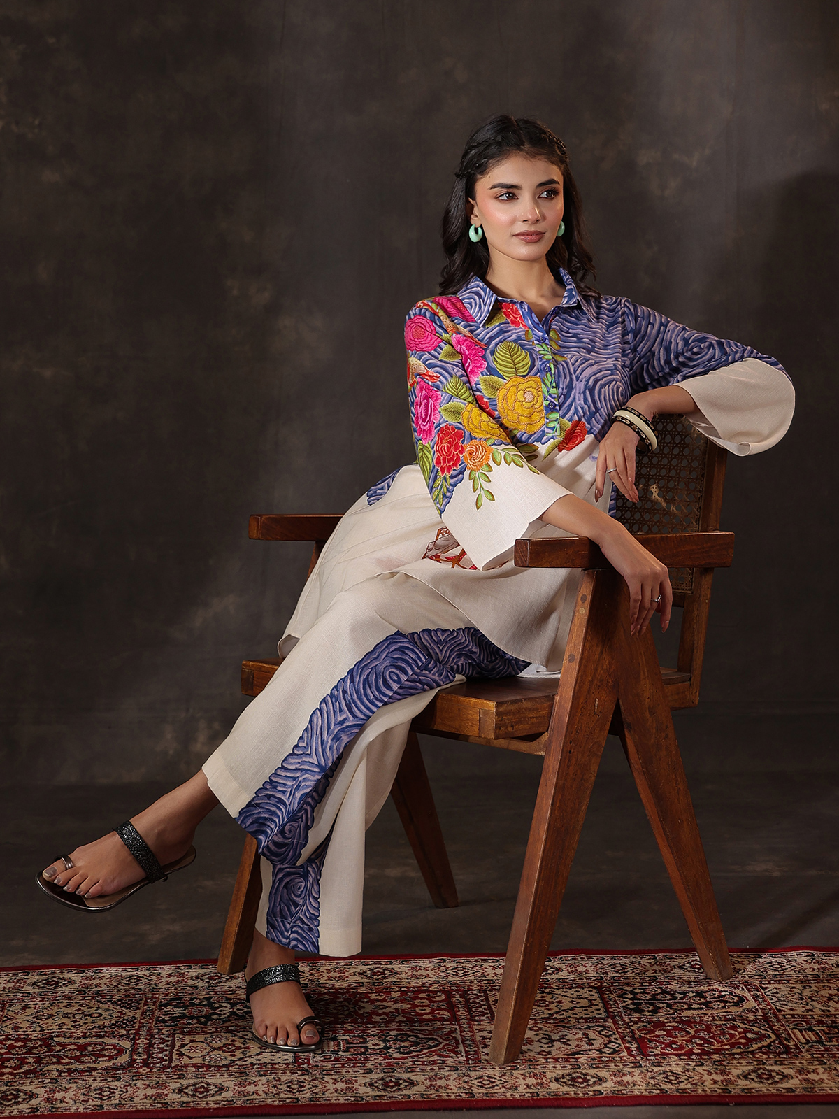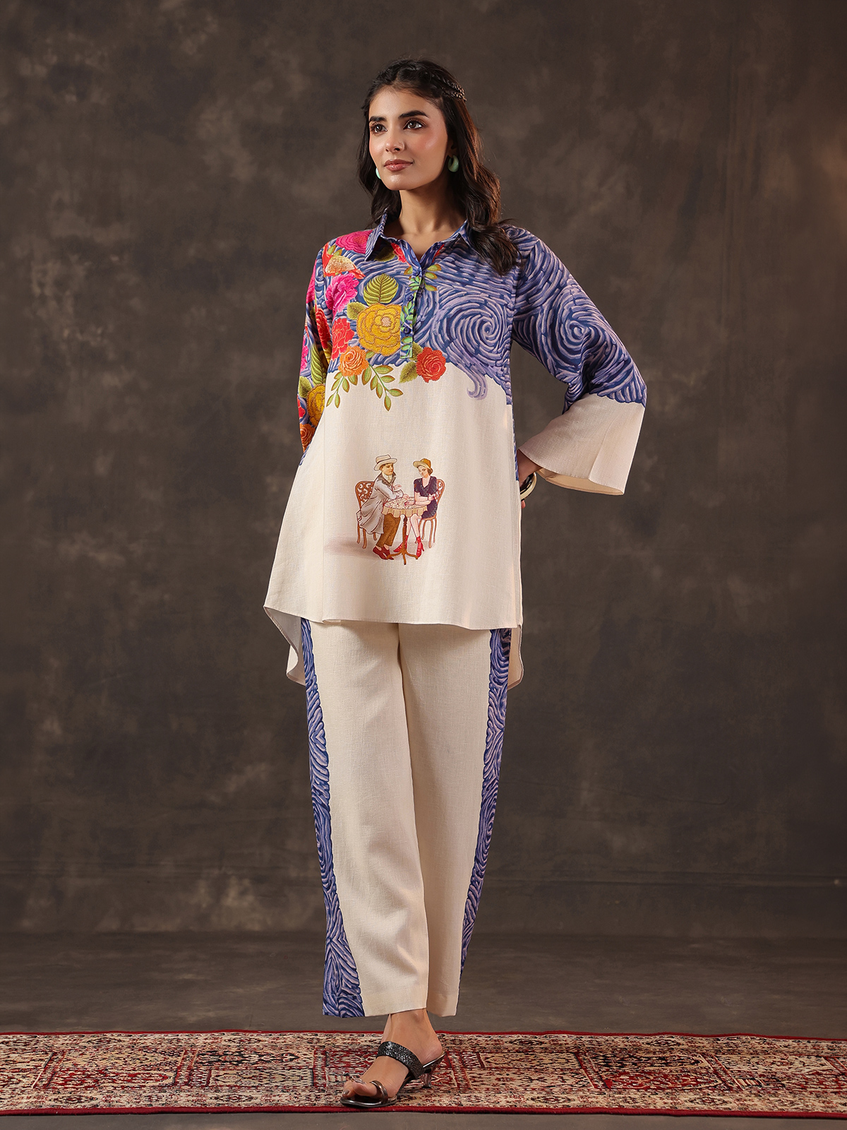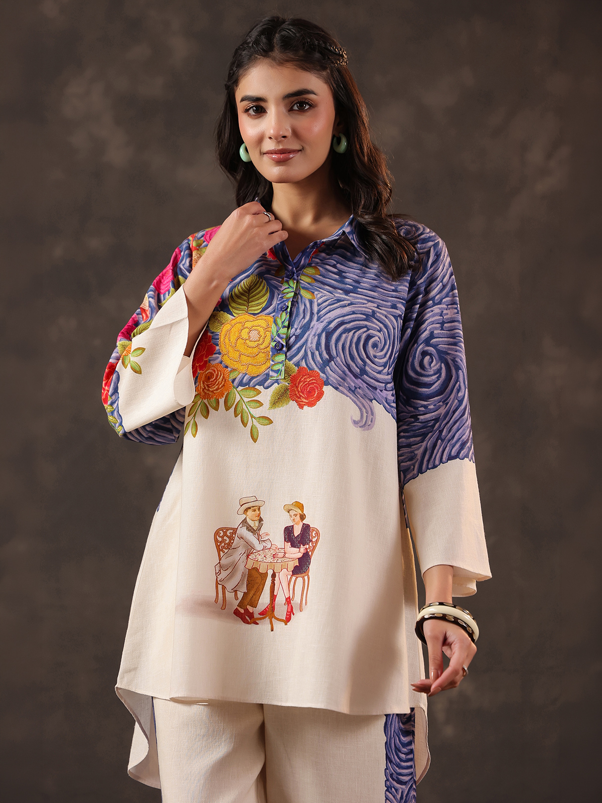 Graceful beige hues reflect quiet sophistication in this silver linen co ord set designed for casual festive dressing. The kurti features a refined collar neckline with elegant quarter sleeves, enriched with subtle printed motifs that add artistic charm. Paired with comfortable pants, the ensemble offers a breathable and relaxed silhouette ideal for daytime gatherings, festive outings and effortless everyday elegance.