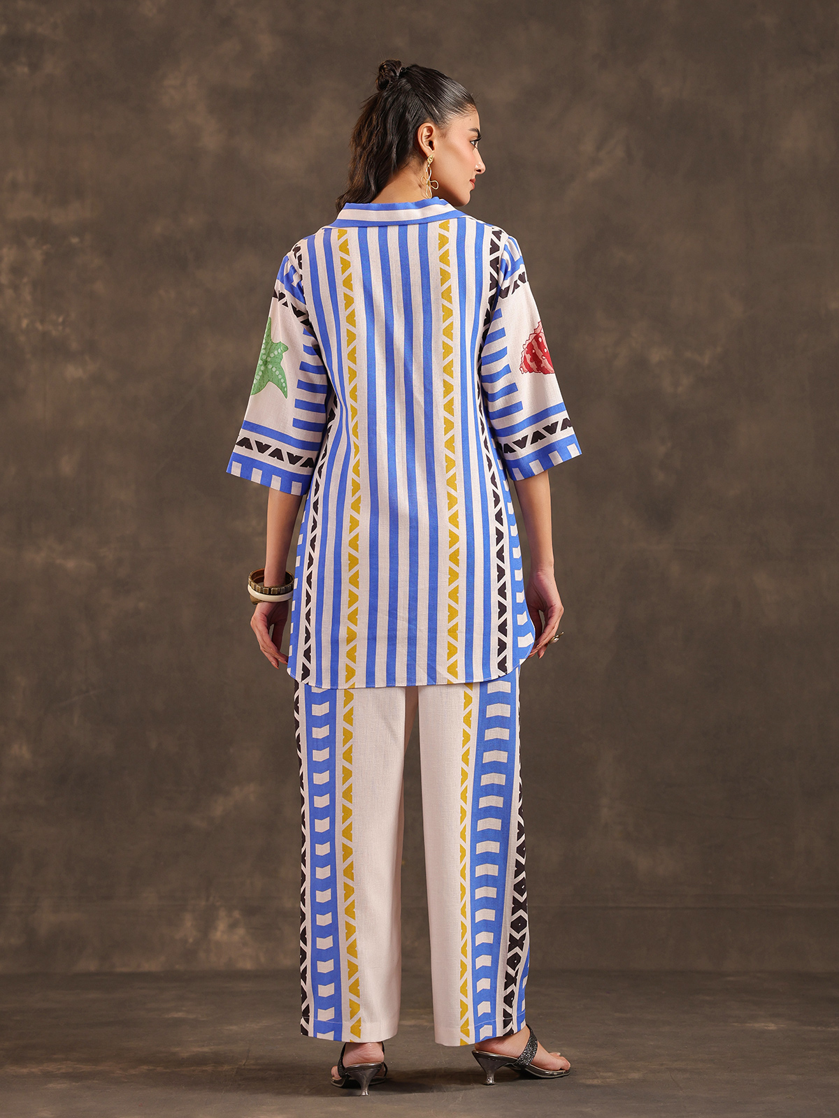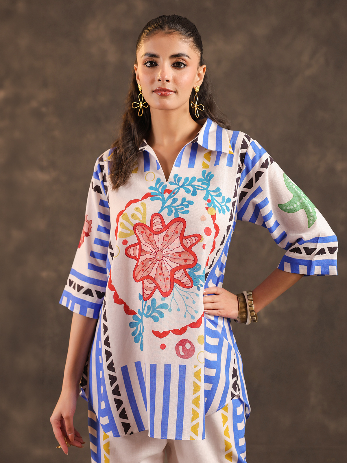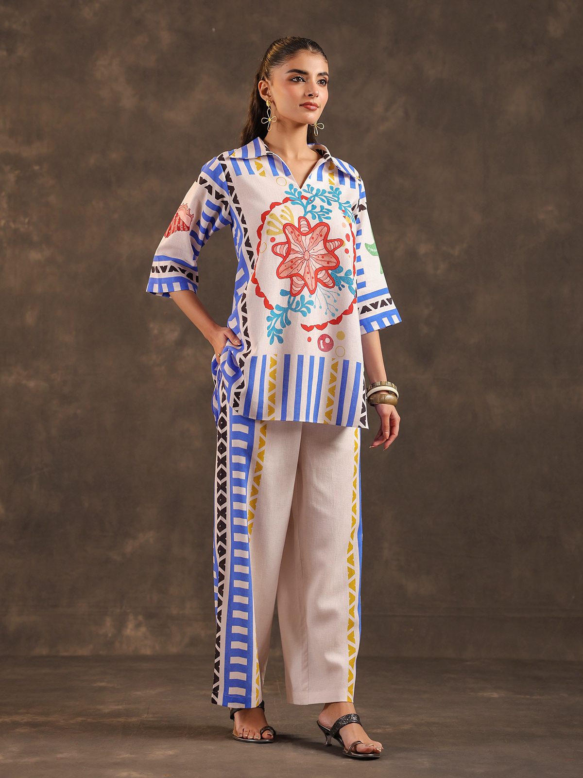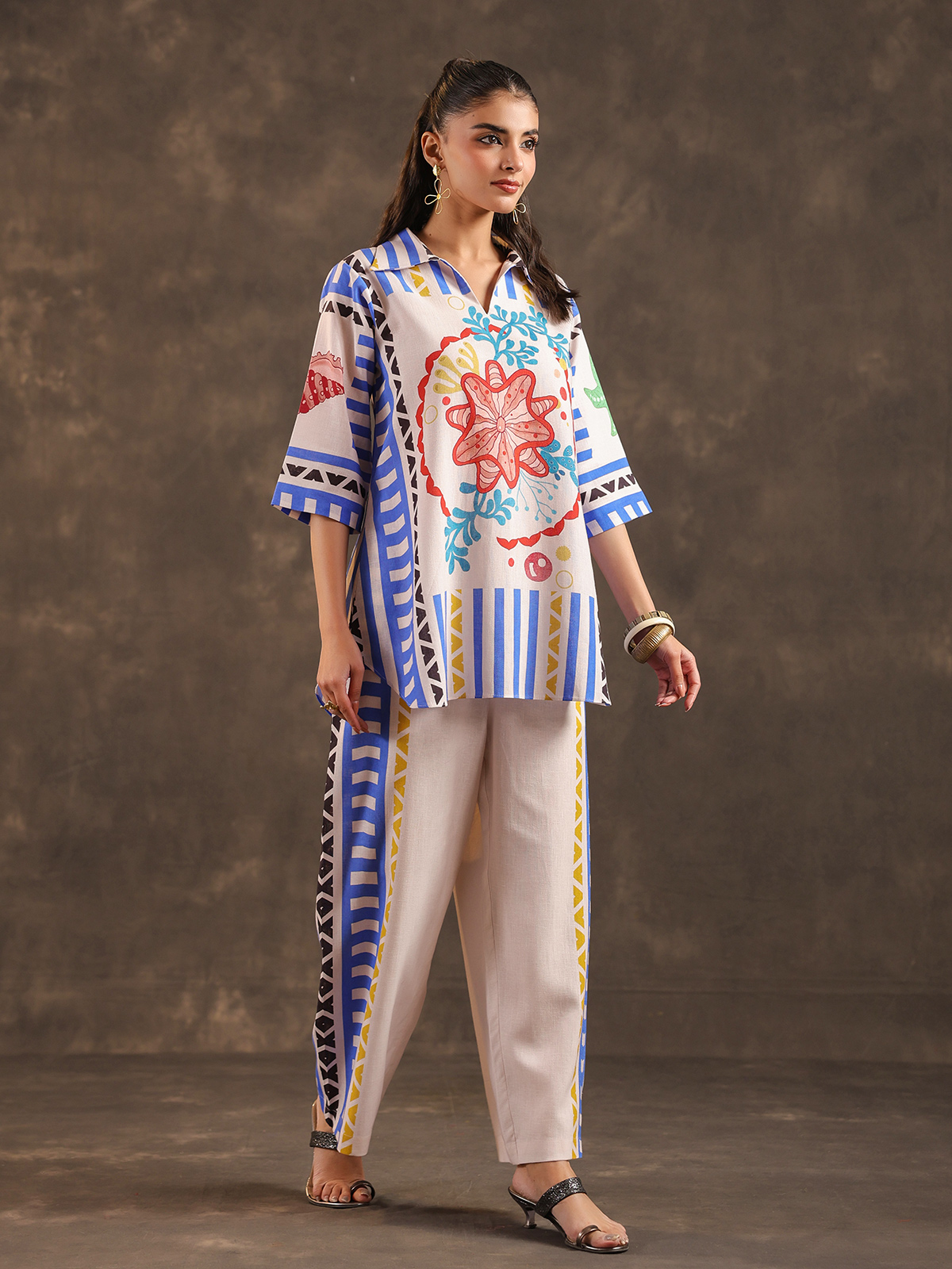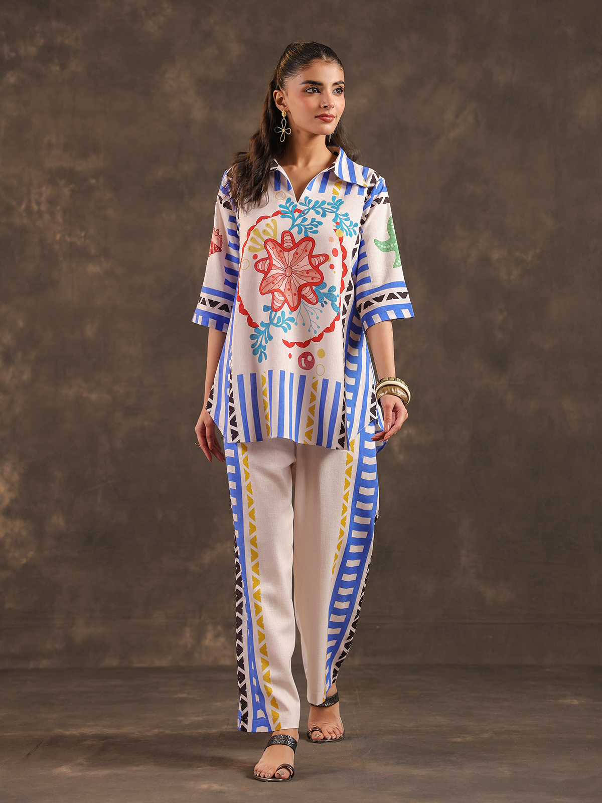 Classic beige tones bring timeless simplicity to this silver linen co ord set crafted for relaxed everyday wear. The kurti features a refined collar neckline with stylish elbow sleeves and delicate printed motifs that enhance its graceful appeal. Paired with comfortable pants, the ensemble creates a breathable and elegant silhouette perfect for casual gatherings and festive occasions.