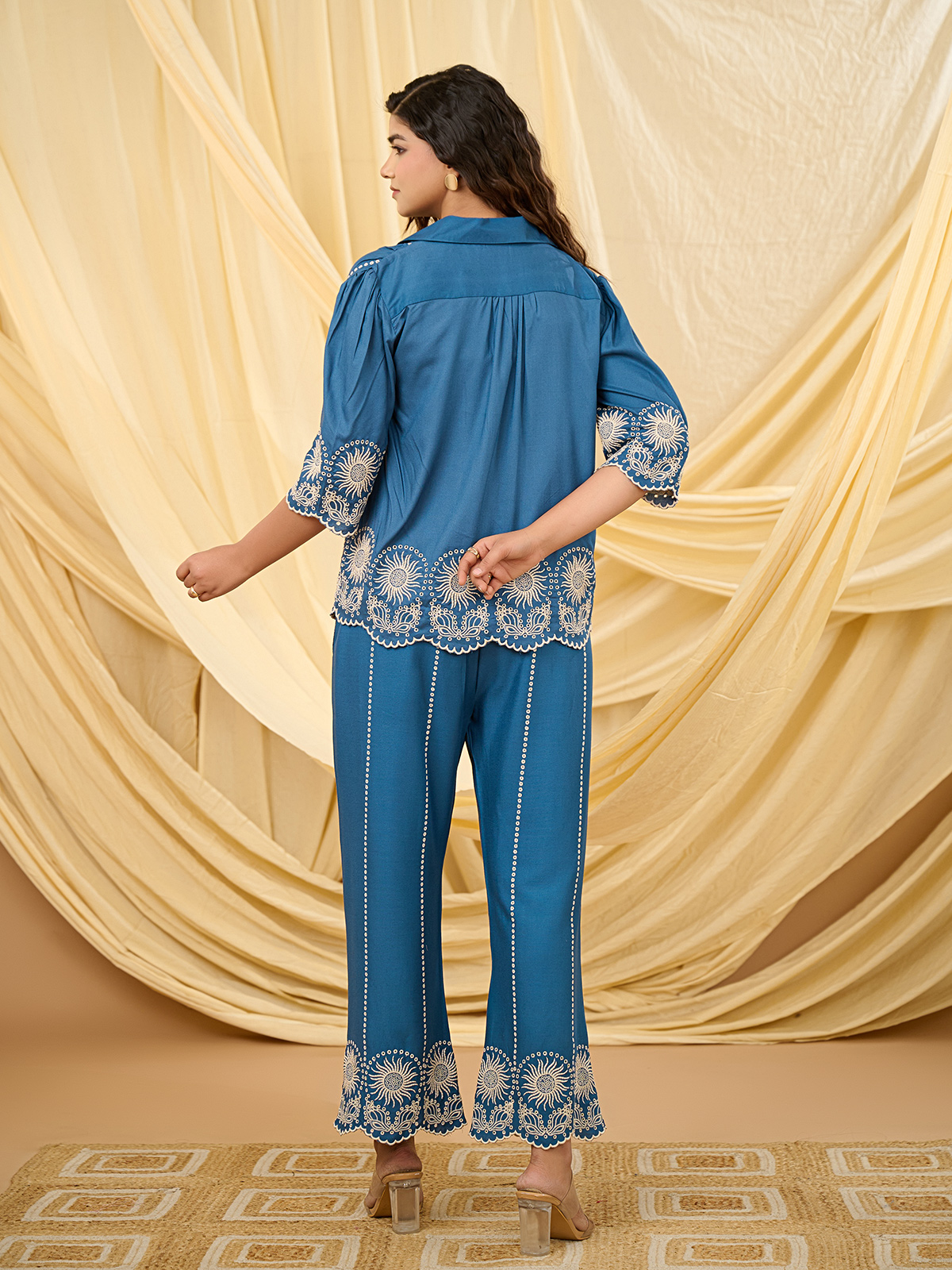 Blue cotton co-ord set breathes freshness with its casual yet sophisticated charm. Fine thread embroidery flows softly around the collared neckline and quarter sleeves, creating a refined canvas of effortless elegance. Matched with classic pants, it offers a perfect harmony of comfort and style, a versatile piece for modern, laid back occasions.