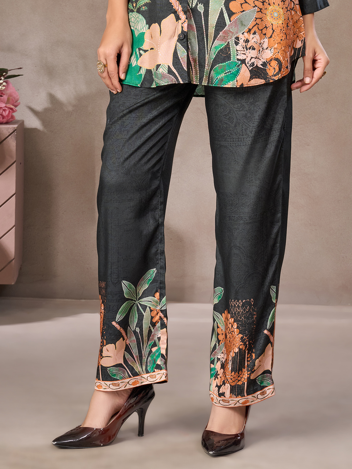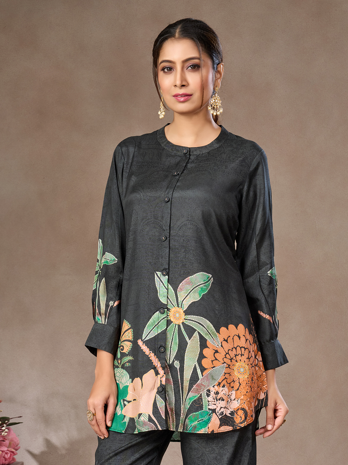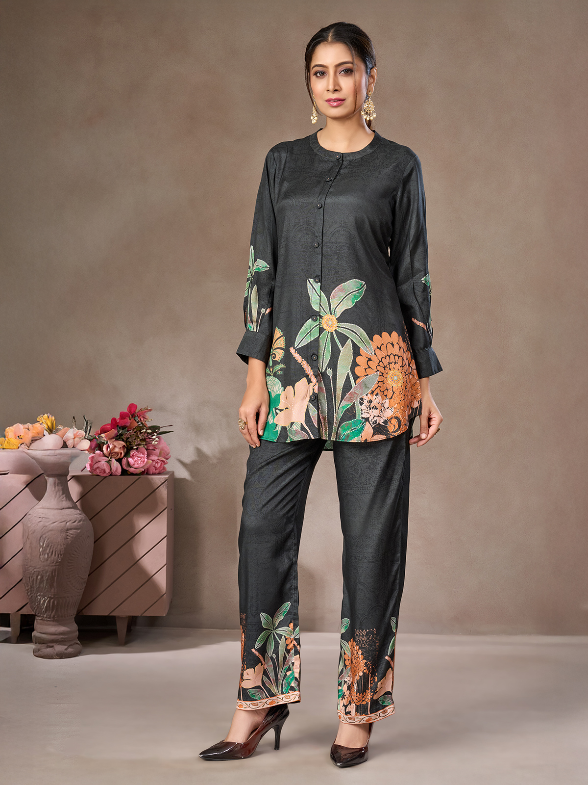 In charcoal black crepe silk, this floral printed co-ord stands out with a refined stand collar and quarter sleeves. Palazzo pants complete the look, blending relaxed sophistication with everyday comfort for stylish casual wear.