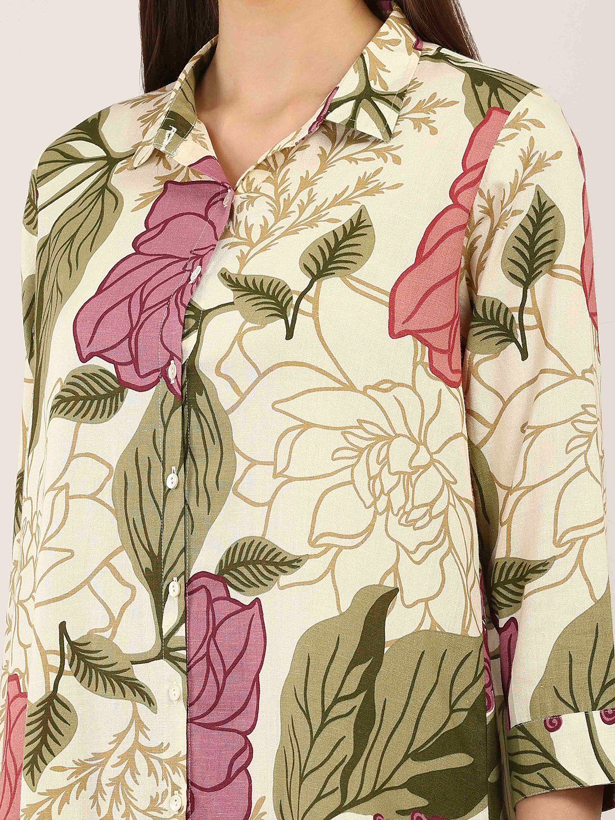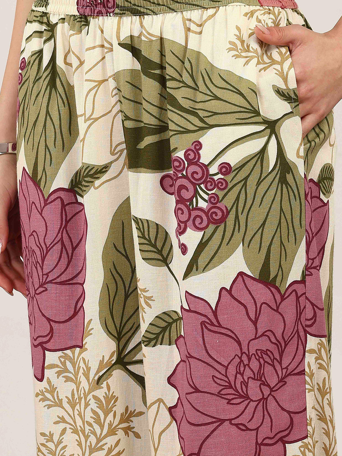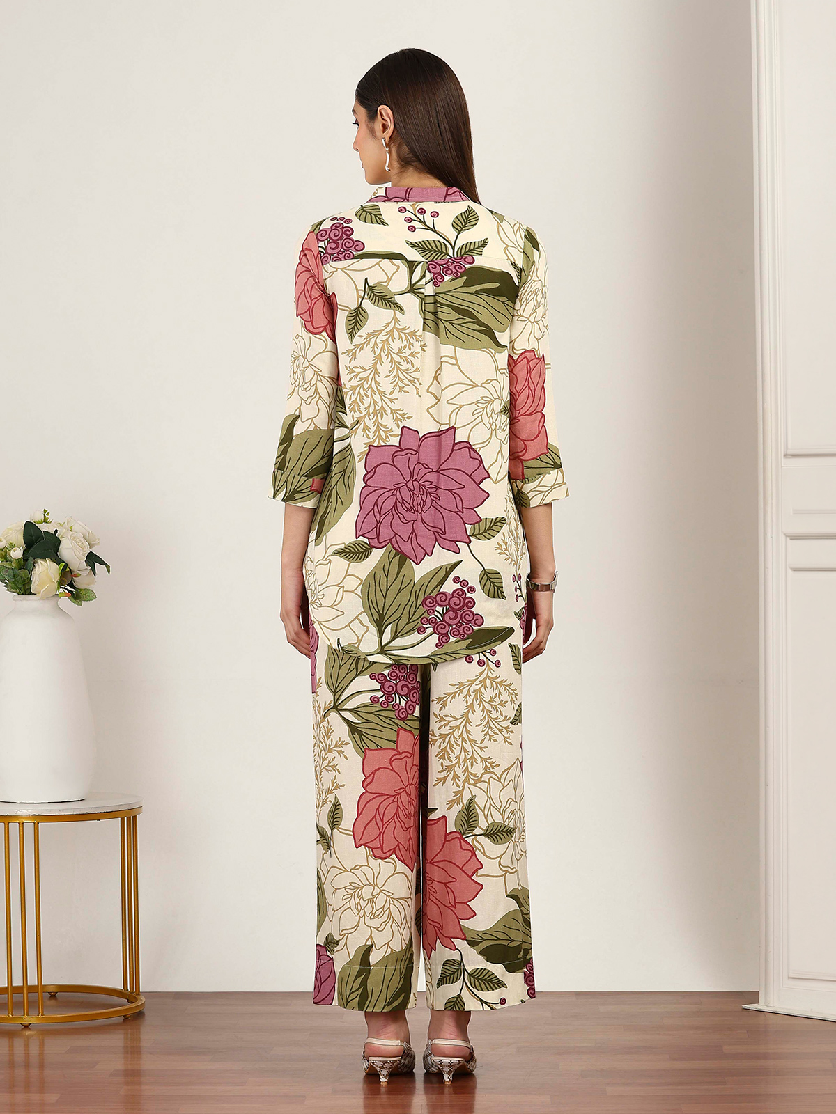 Cream Cotton Silk Floral Printed Co Ord Kurti Set