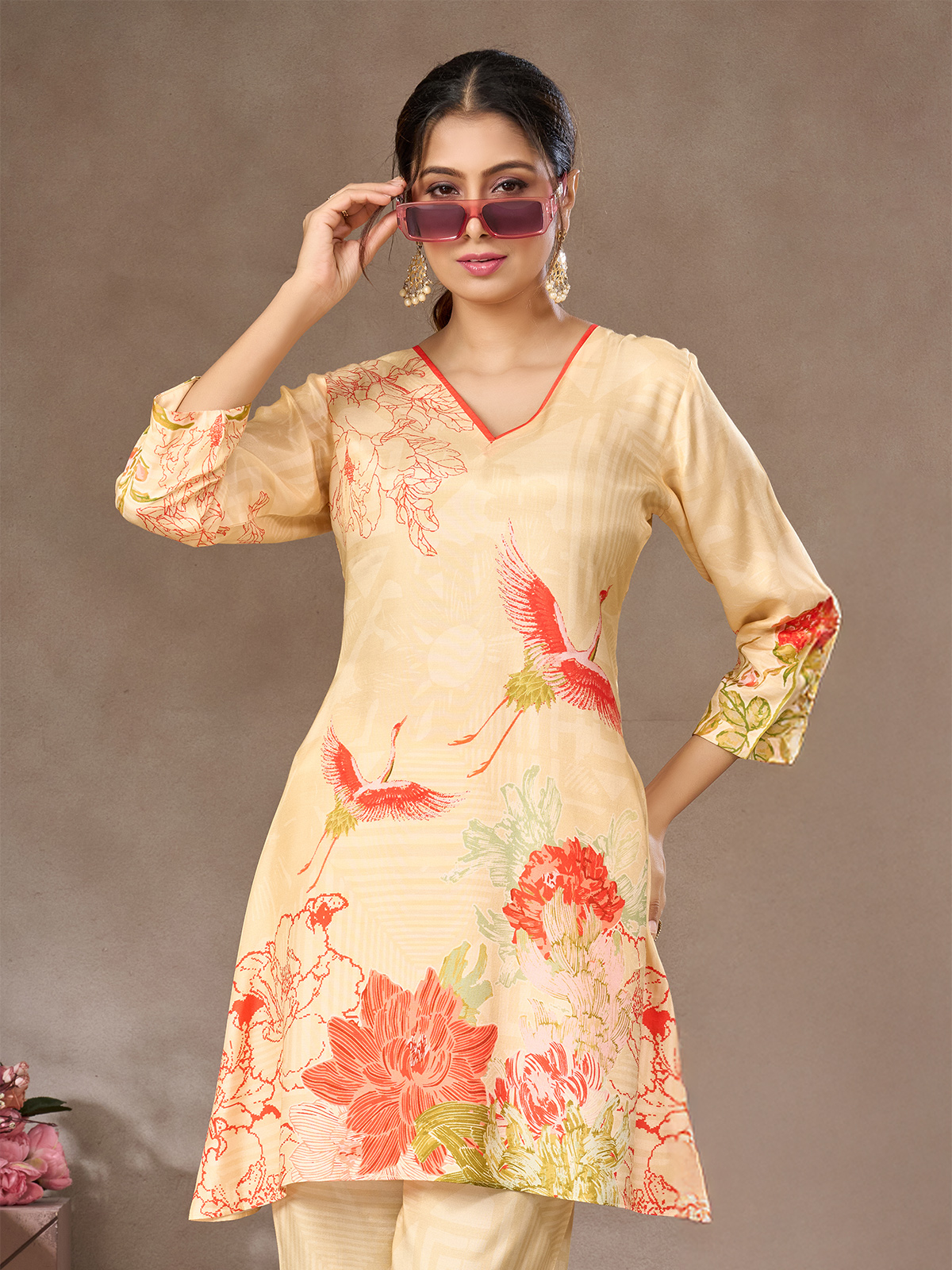 Soft cream crepe silk meets delicate floral prints in this charming co-ord. Styled with a flattering V-neckline and quarter sleeves, the set is paired with relaxed palazzos. A refreshing choice that adds effortless grace to your casual wear wardrobe.