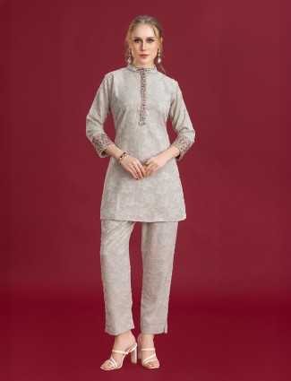 Gentle cream silk blooms with printed finesse in this co-ord set. A stand collar and quarter sleeves bring structured poise, while sleek pants enhance its polished style. Minimal yet graceful, it radiates casual sophistication, perfect for serene days or occasions that call for quiet elegance.
