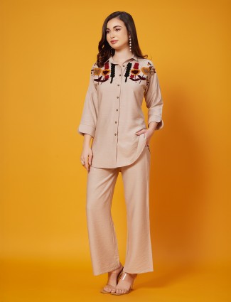 This light brown silk palazzo co-ord set showcases delicate thread detailing with a structured stand collar and quarter sleeves. A graceful choice for casual outings or festive moments, it balances modern styling with traditional flair.