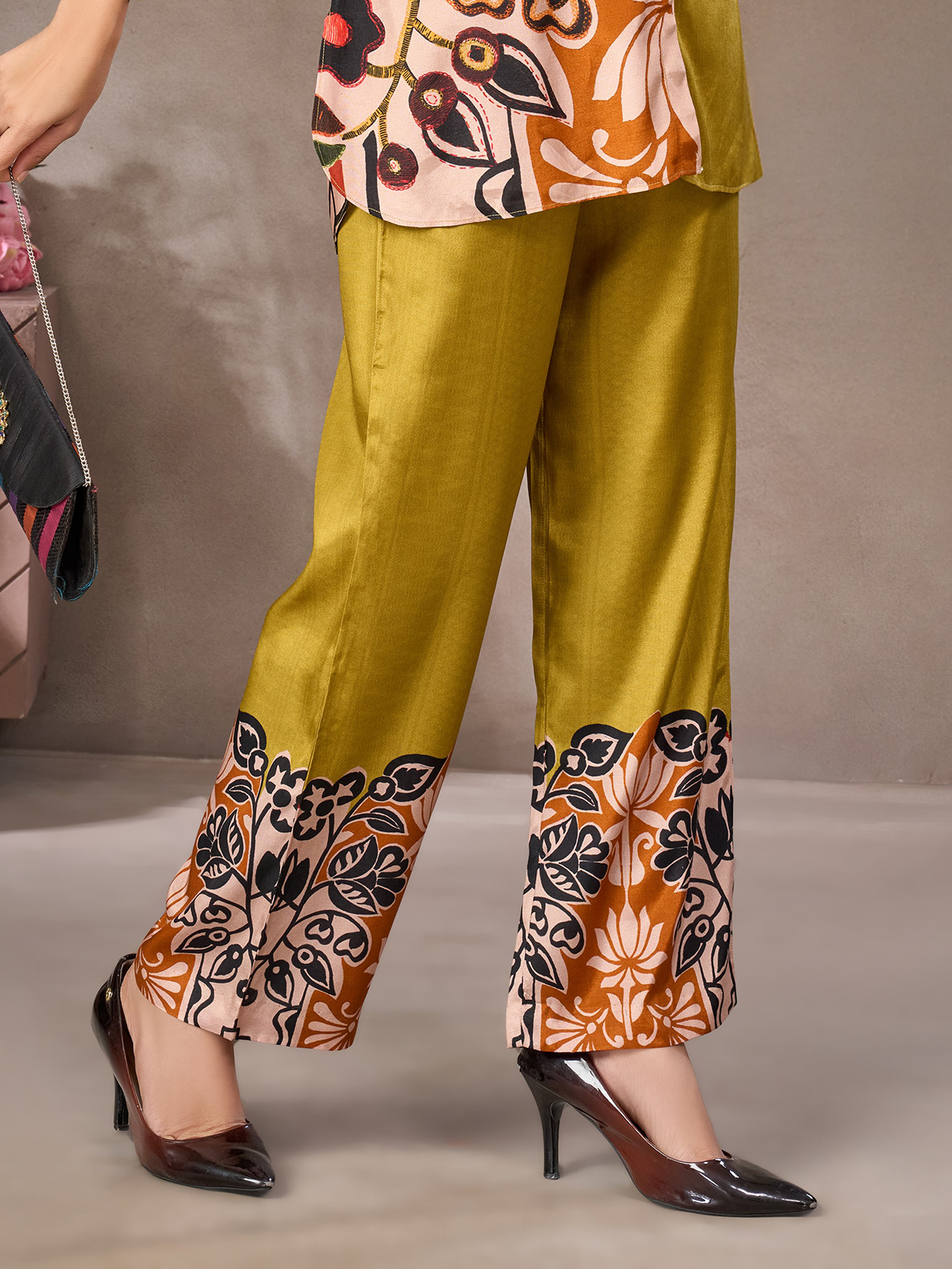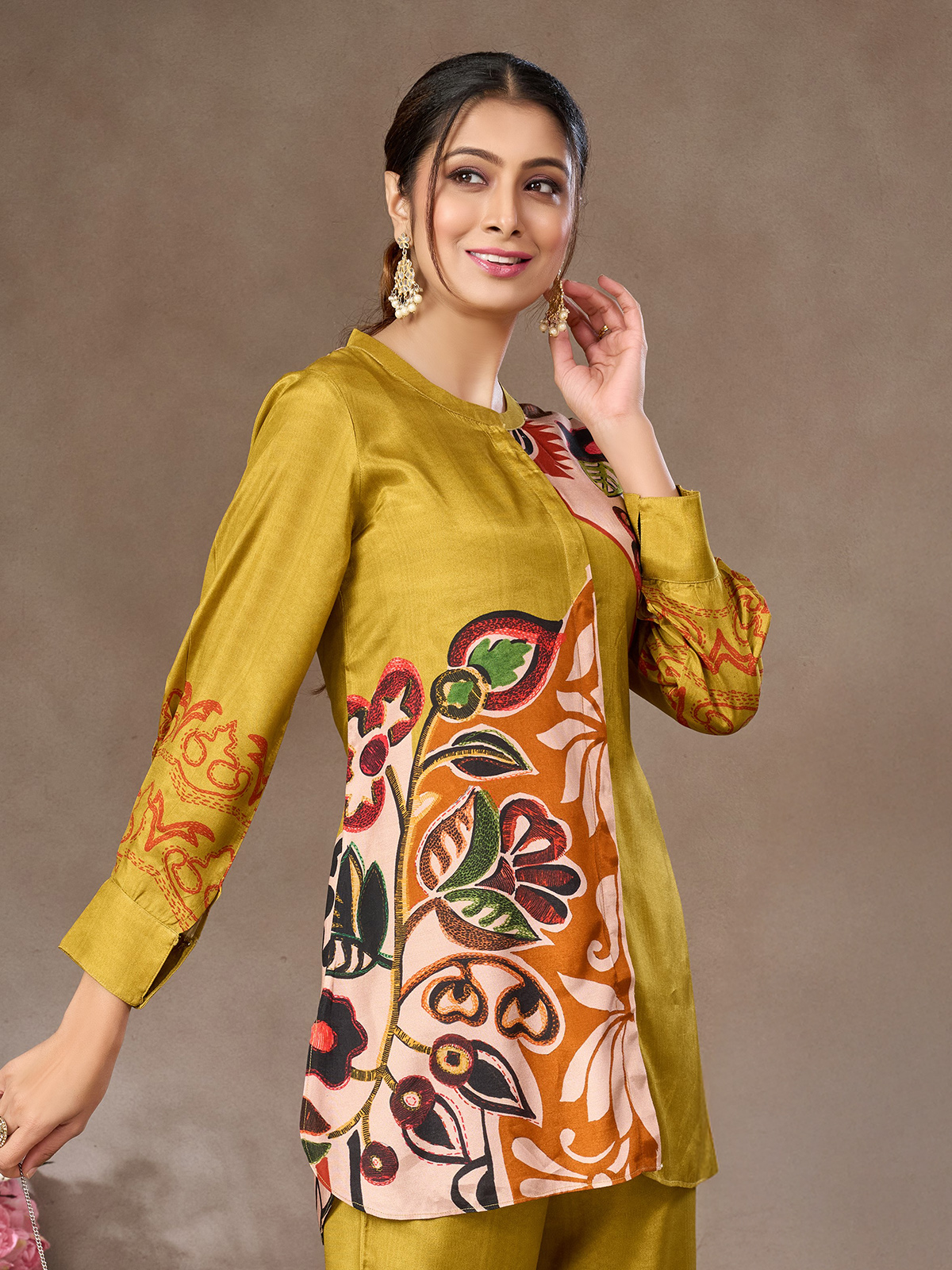 Lively mehendi green crepe silk hosts floral prints in this chic co-ord set. Featuring a stand collar and quarter sleeves, paired with easy palazzo pants, it offers a refreshing take on casual style with a blend of vibrancy and comfort.