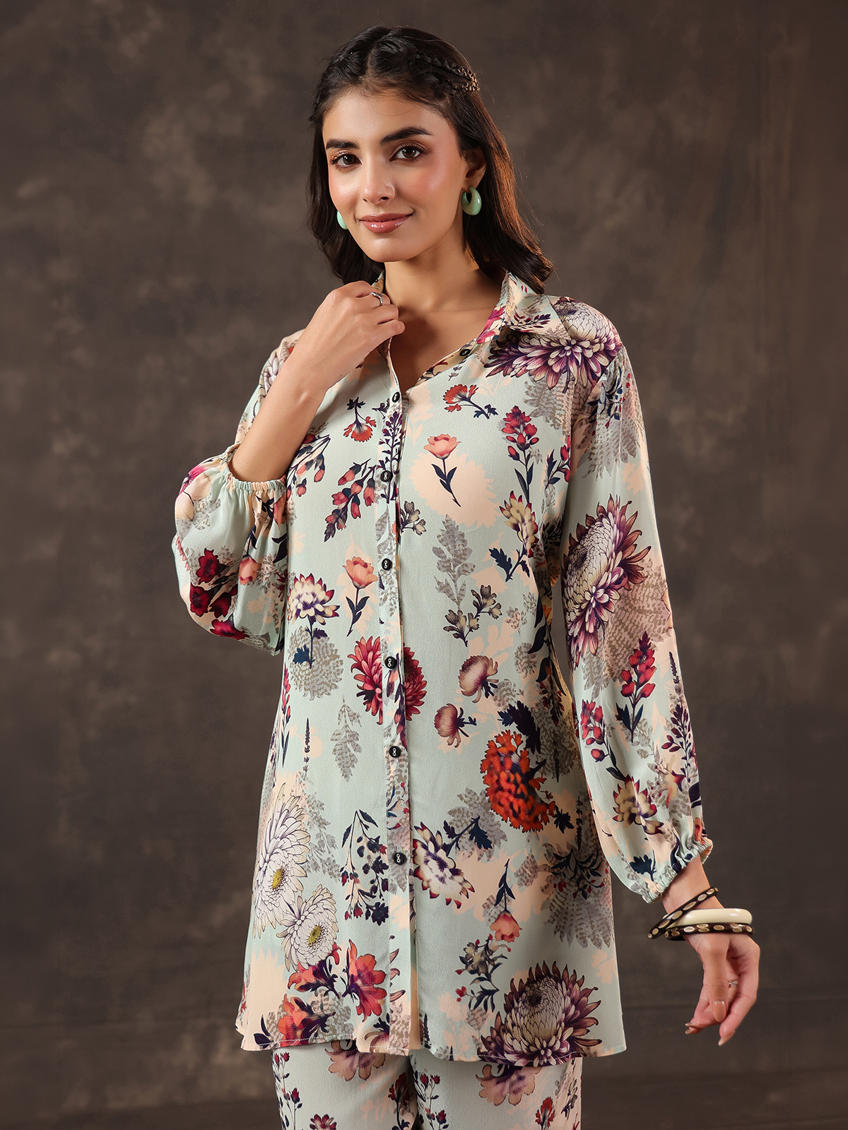 Fresh mint green tones brighten this viscose crepe co ord set crafted for relaxed festive style. Designed with a classic collar neckline and full sleeves, the kurti is enhanced with delicate printed accents that elevate its graceful appeal. Styled with flowing palazzo bottoms, the outfit creates an airy and contemporary silhouette perfect for casual celebrations, brunch events and daytime festivities.