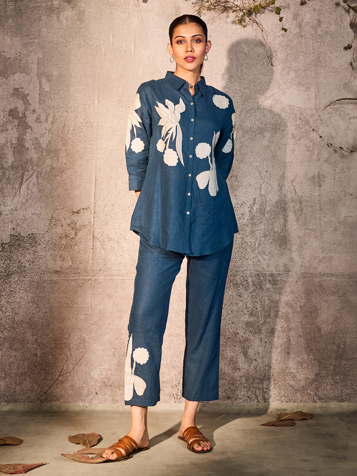 Woven in smooth cotton silk, this navy printed co-ord set redefines casual refinement with a touch of modern grace. The collared neckline and quarter sleeves lend a sleek appeal, while the coordinating pant enhances its understated elegance—perfect for serene evenings and urbane gatherings.