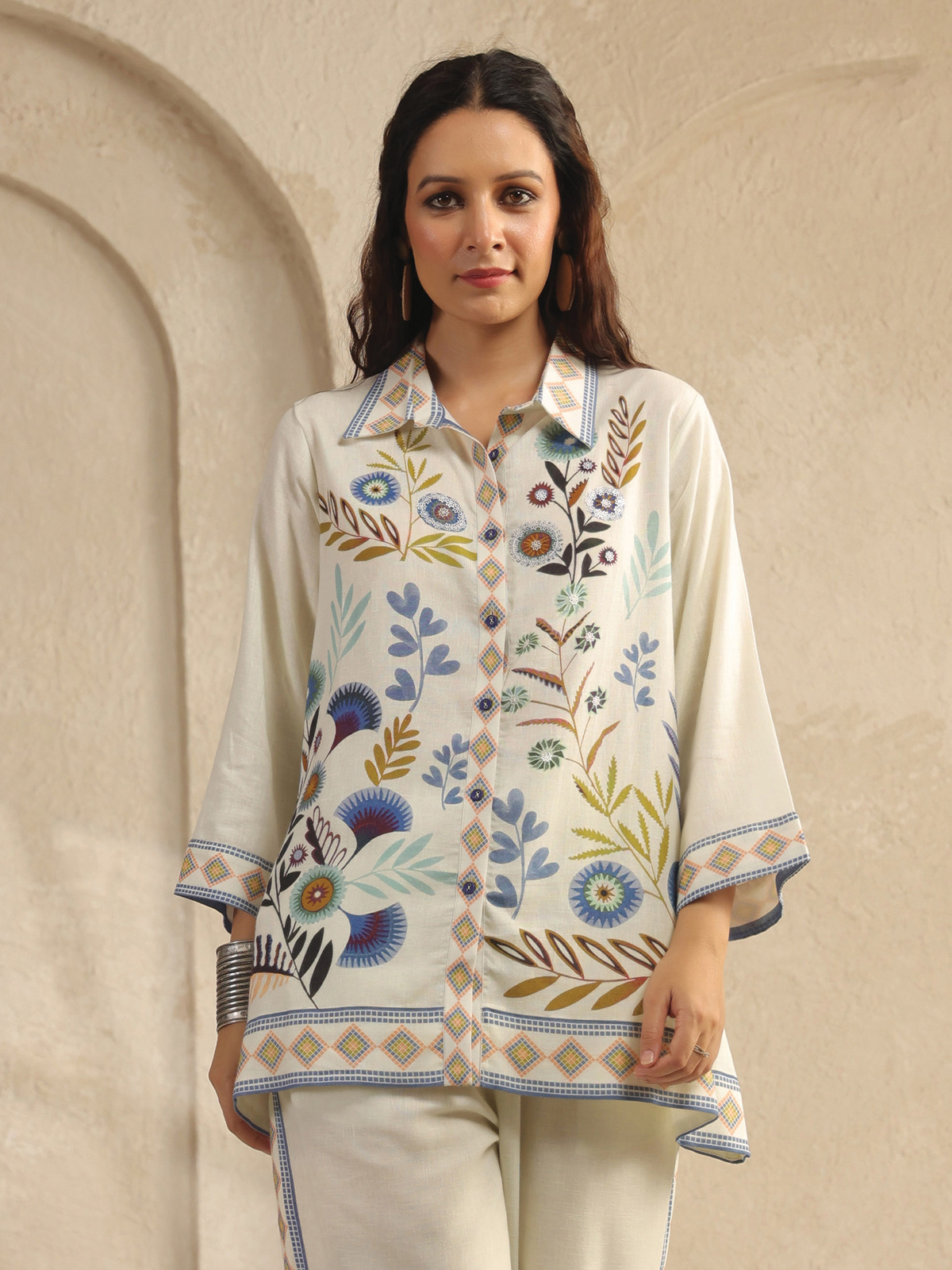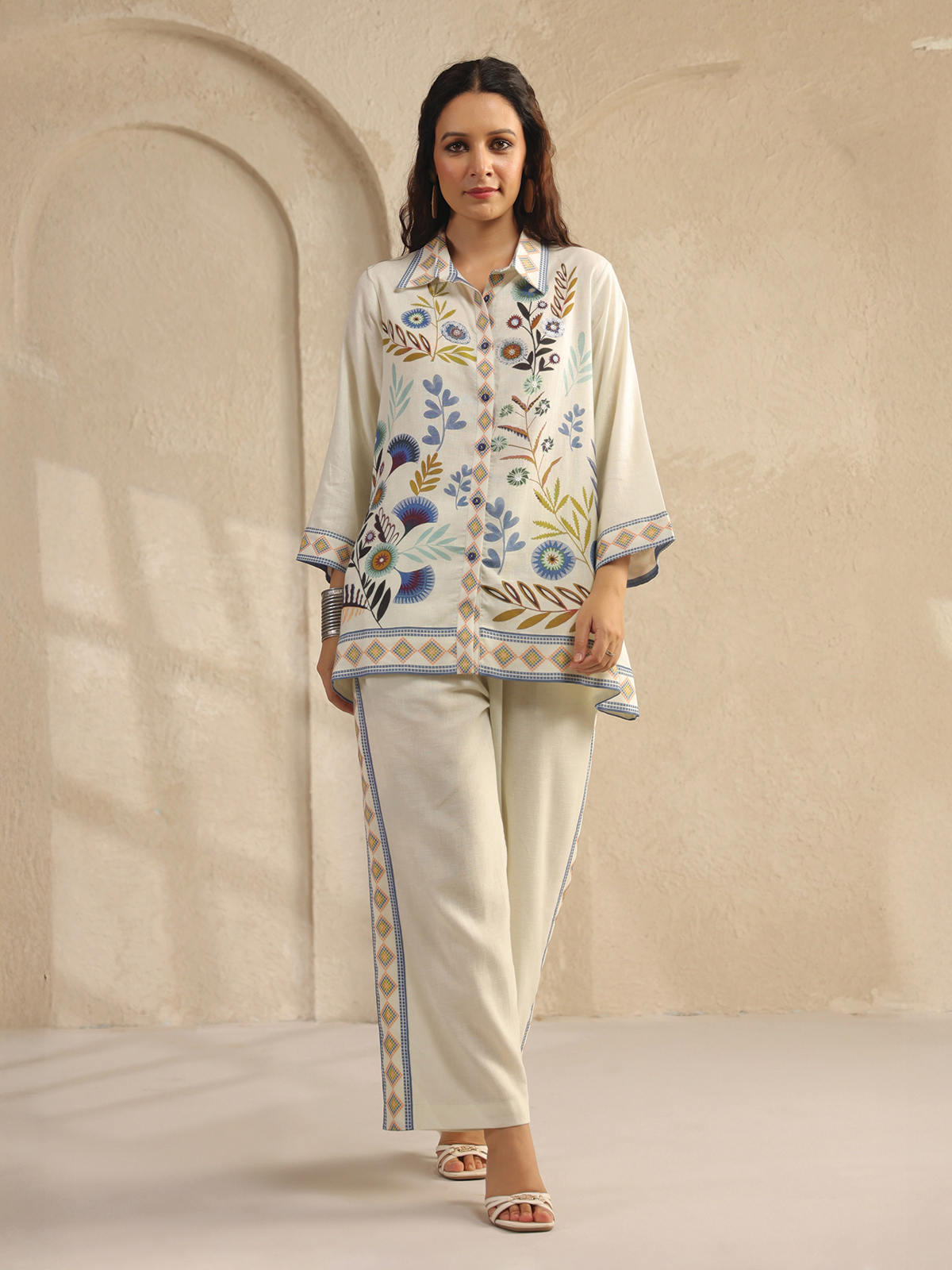 Soft off-white silk unfolds with printed artistry in this sleek co-ord set. Featuring a collar neckline and quarter sleeves, it flows into slim pants for balanced charm. Subtle and refined, it carries an aura of understated elegance, suited for versatile everyday styling with a modern edge.