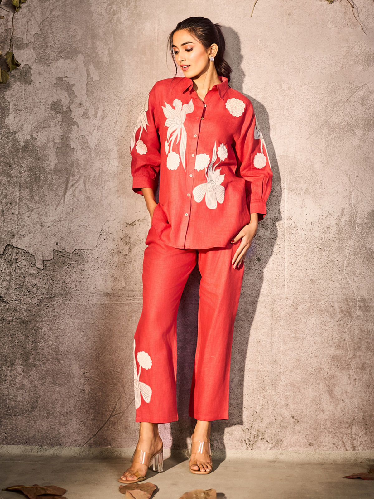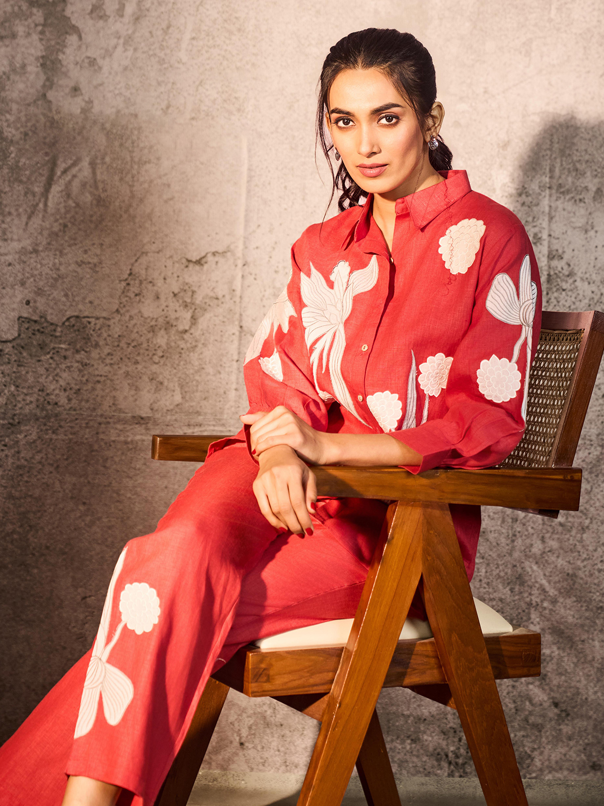 Brimming with vitality, this red printed co-ord set in soft cotton silk captures a relaxed yet spirited vibe. Featuring a collared neckline and quarter sleeves, it blends simplicity with poetic charm. The coordinated pant completes the look, creating an ensemble ideal for easy brunches and breezy outings.