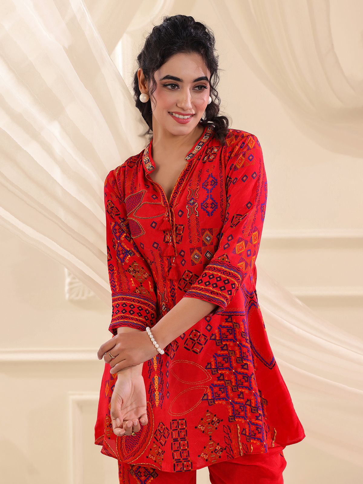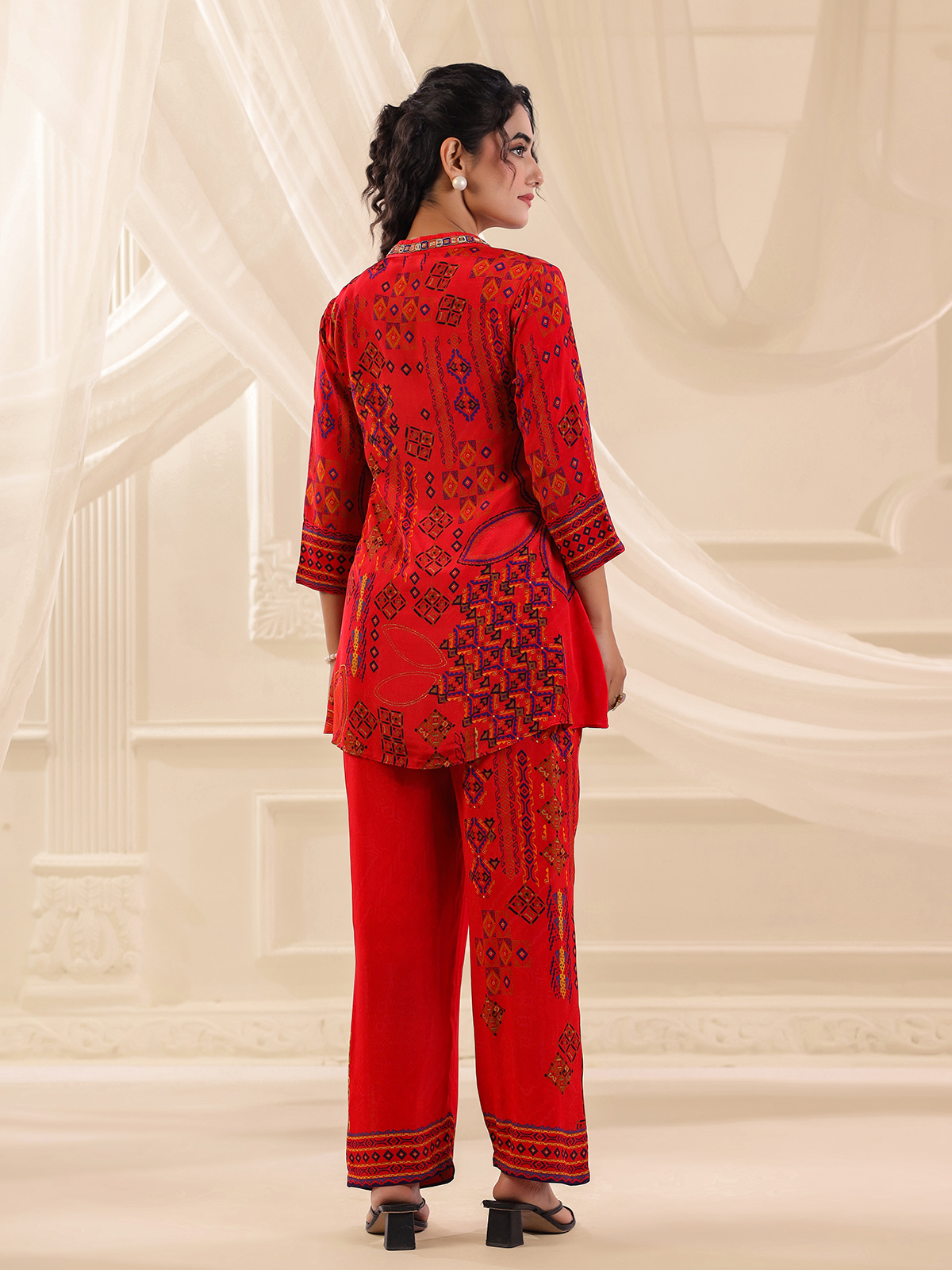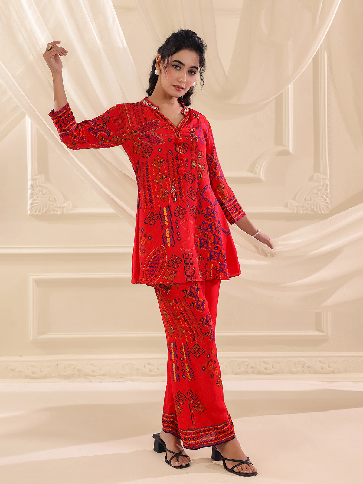 Bold red hues bring striking charm to this viscose crepe co ord set crafted for festive casual style. The kurti features a classic collar neckline with quarter sleeves. Highlighted with printed patterns and delicate bead and cutdana embellishments that add gentle sparkle. Paired with flowing palazzo bottoms. The ensemble forms a vibrant and stylish festive silhouette.