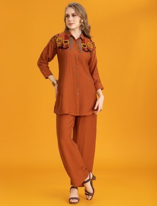 Whether it is a family function or a festive occasion, this red silk co-ord set is your ticket to feeling graceful and lovely. Embellished with a charming printed design, it comes complete with a printed jacket for added flair.