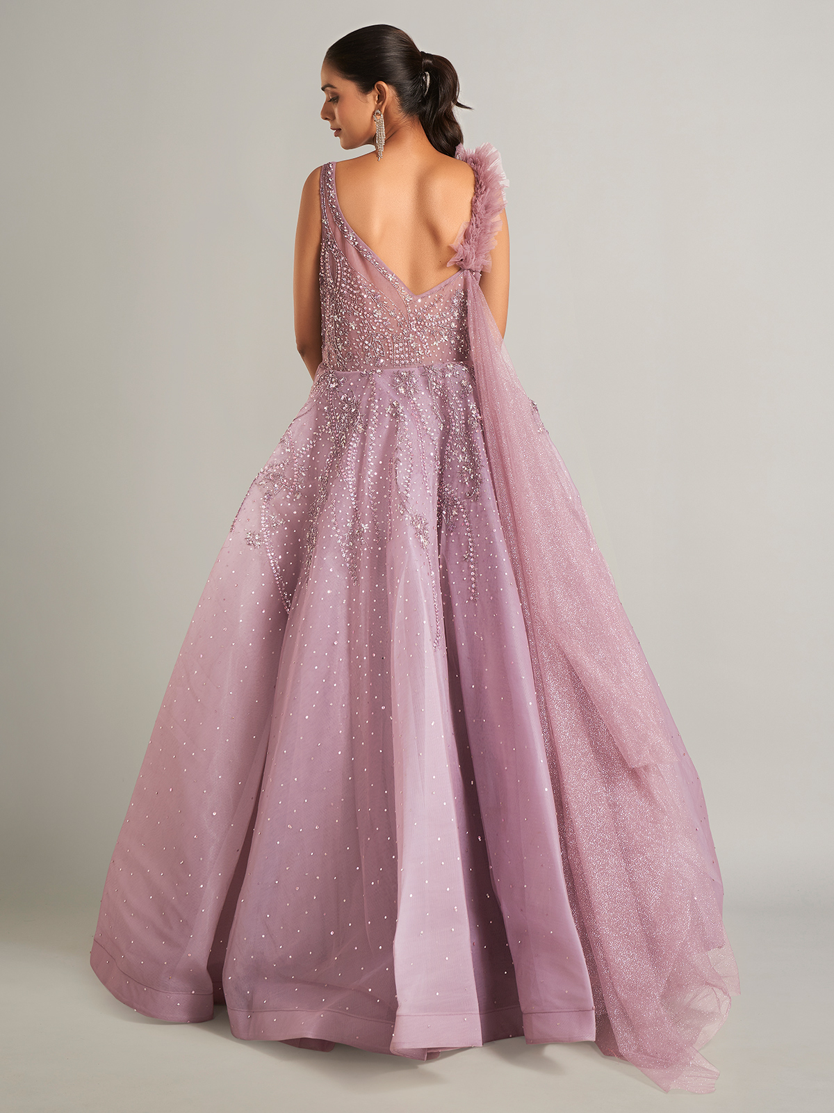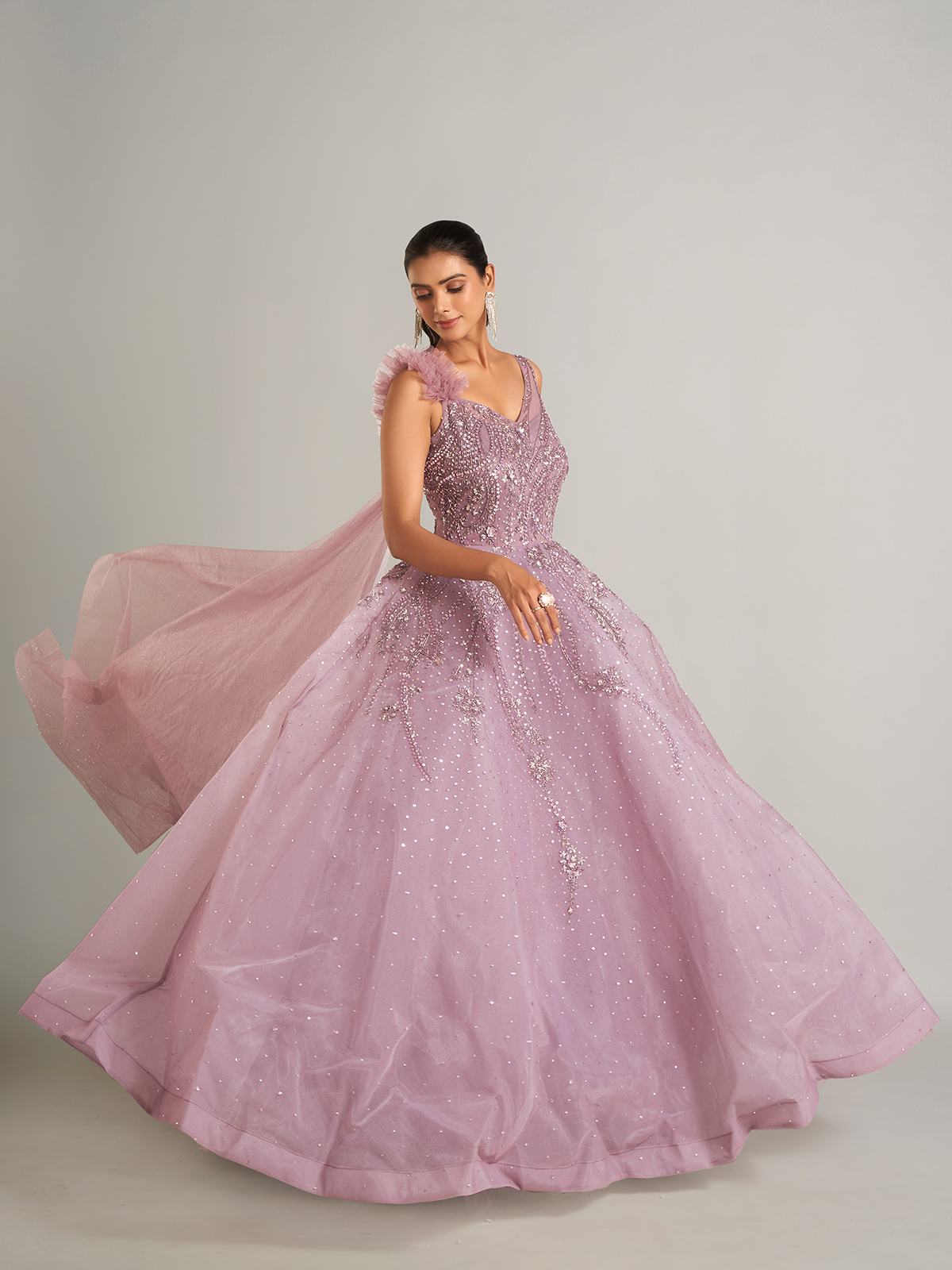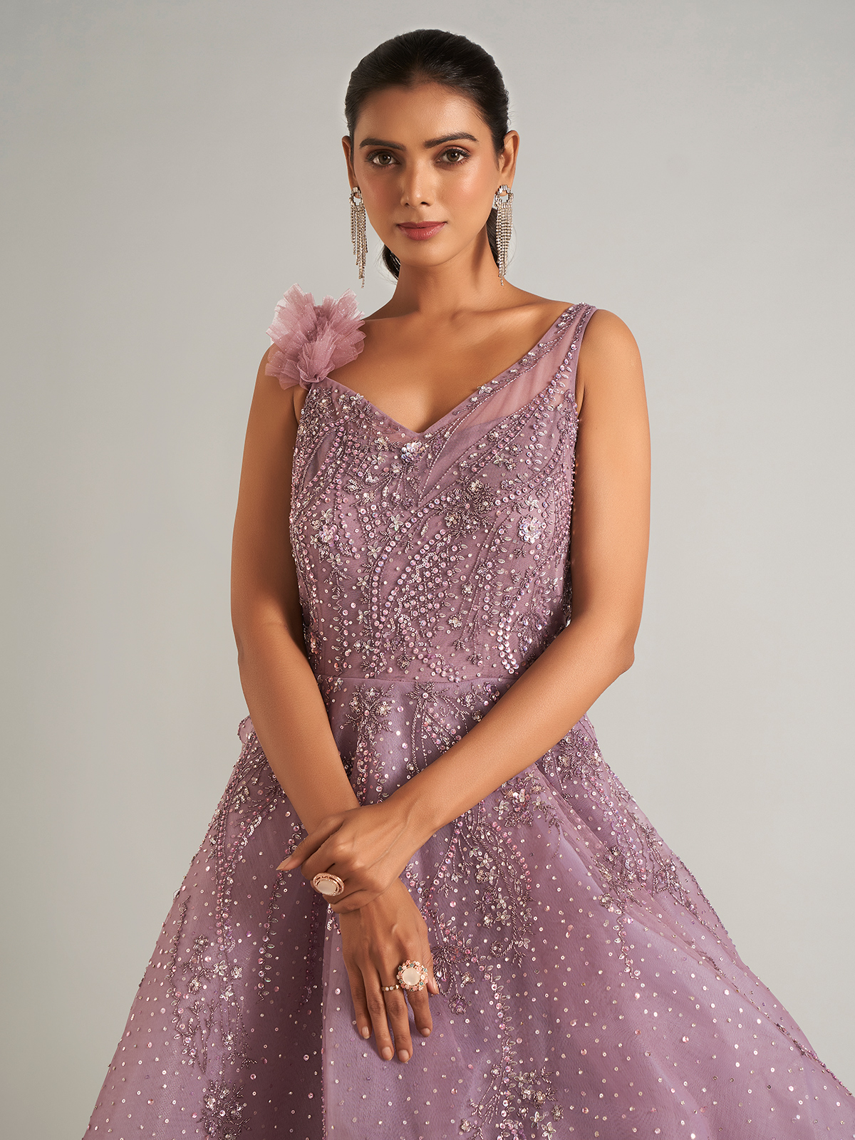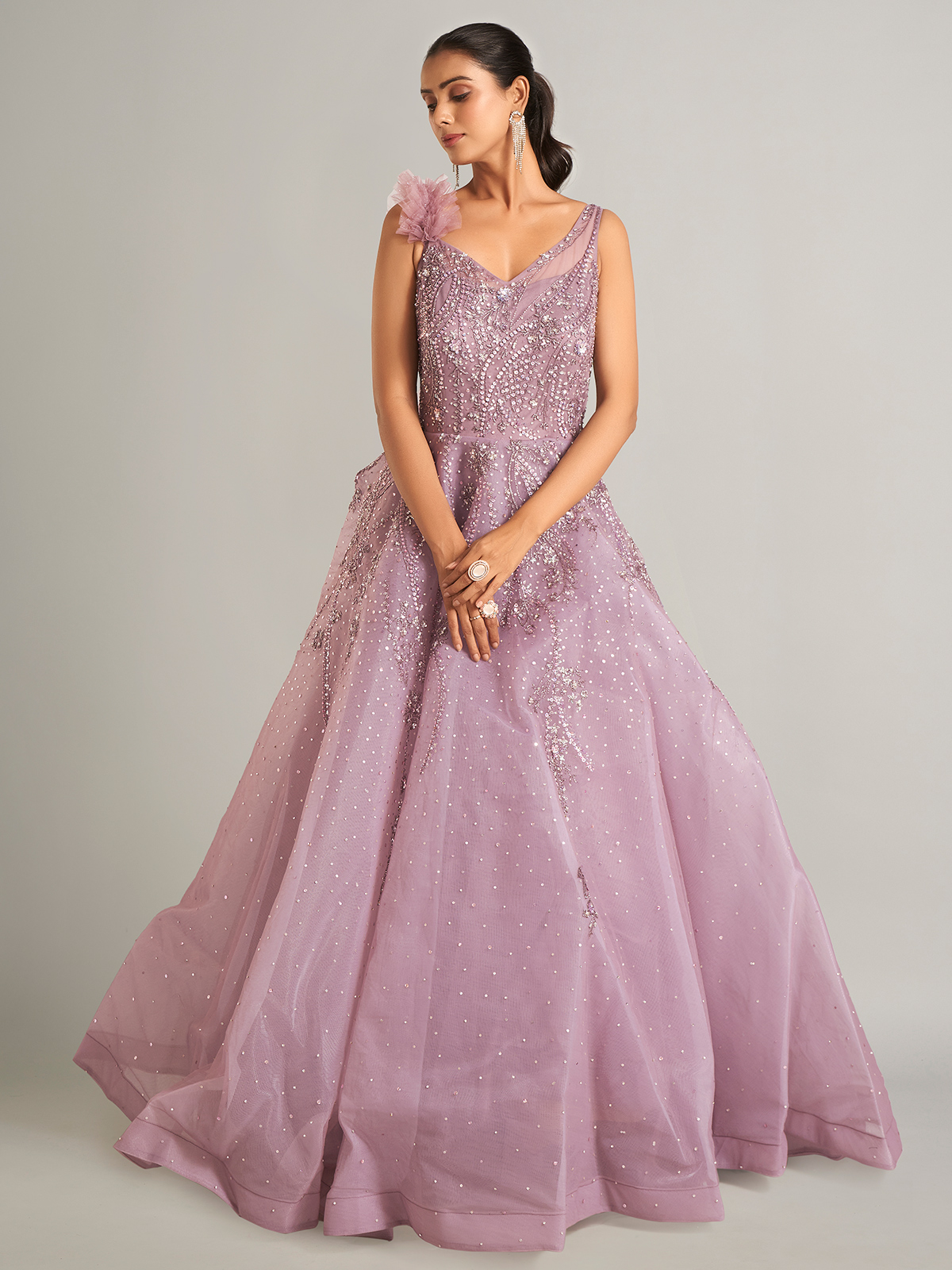 Give a bold statement with our stunning purple net designer gown. Expertly crafted with intricate cutdana, beads, sequins, pearls, and stone work, this dress is designed to dazzle. With a flattering V-neck and sleeveless design, it’s the perfect choice for anyone looking to turn heads and stand out.