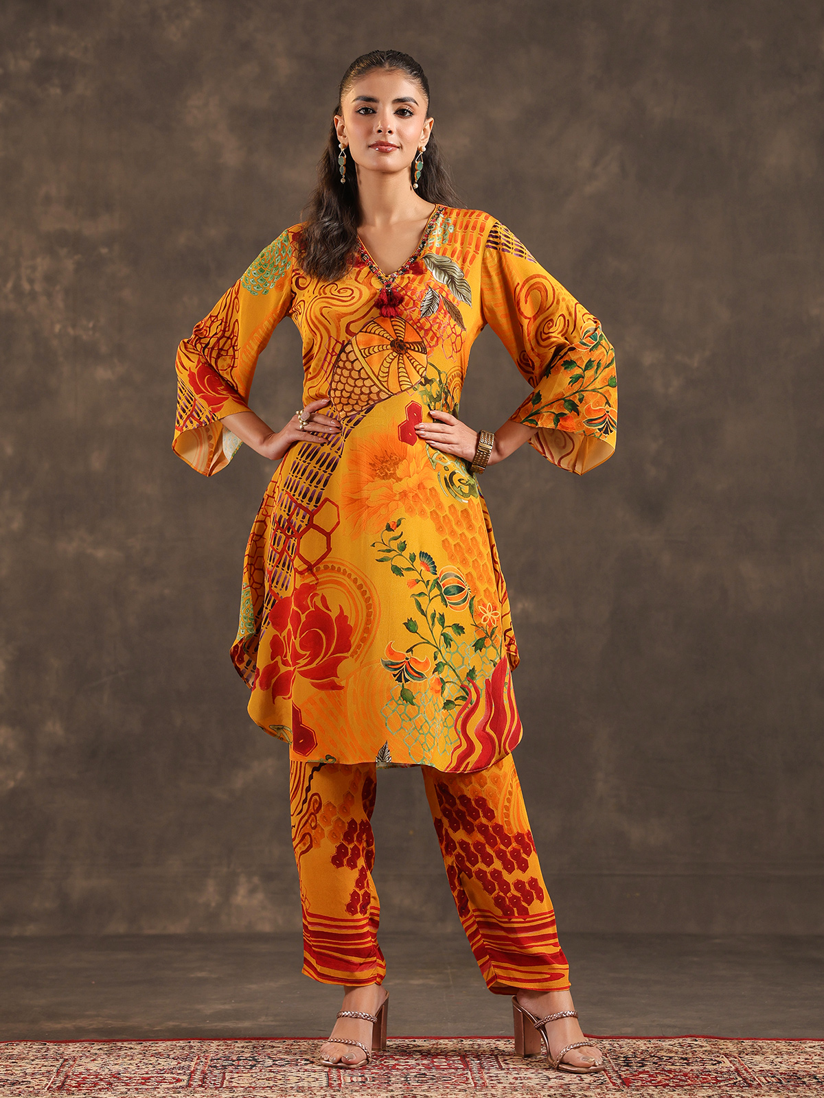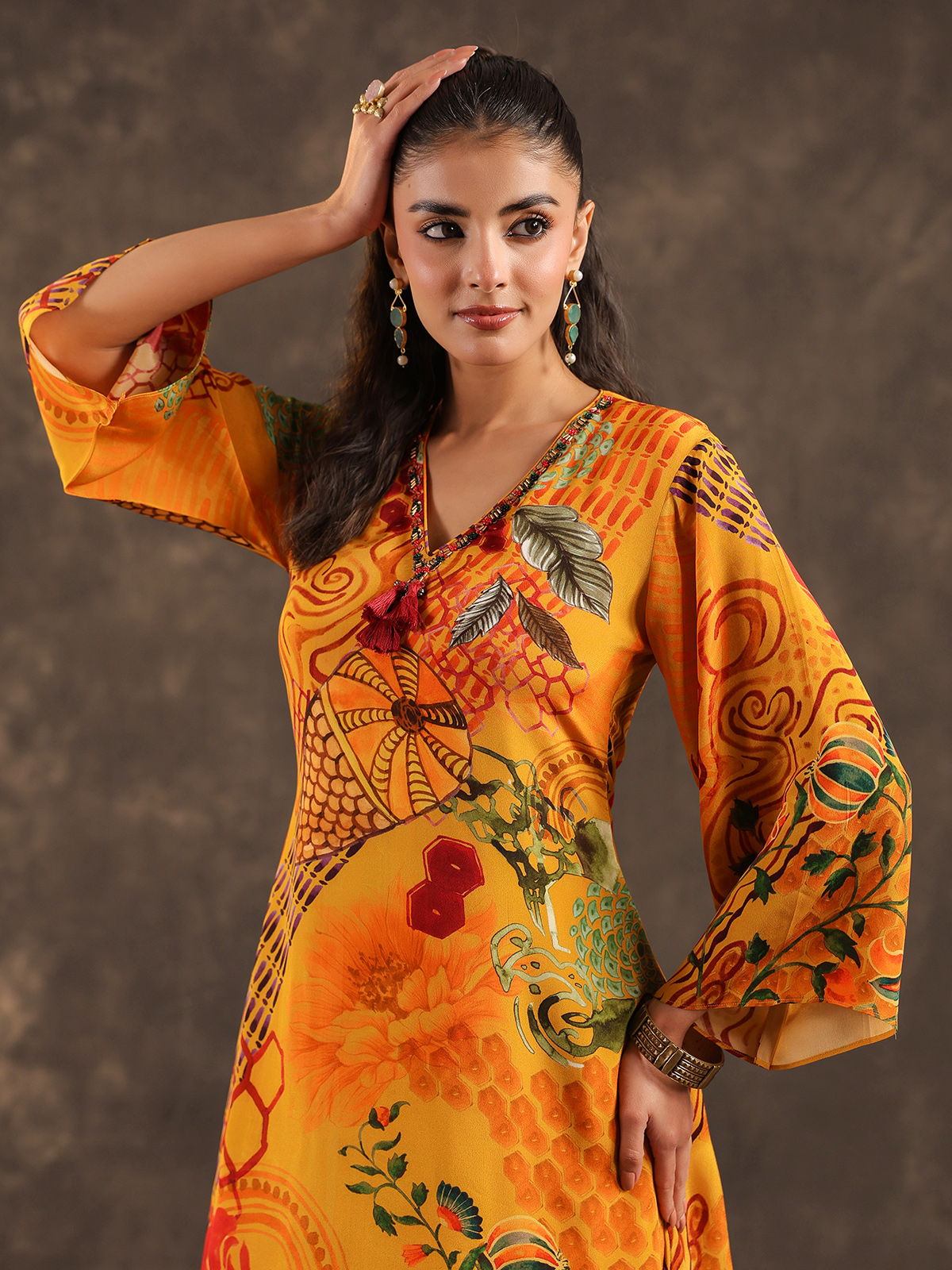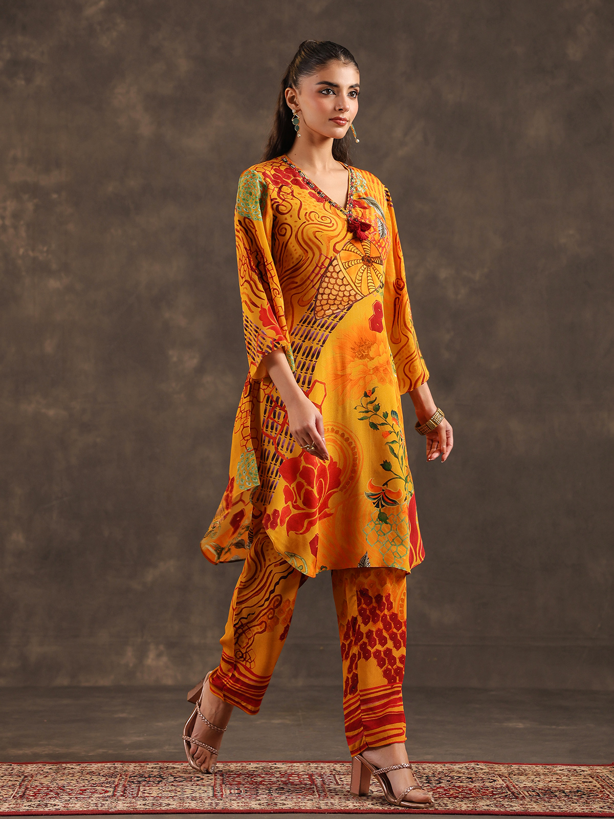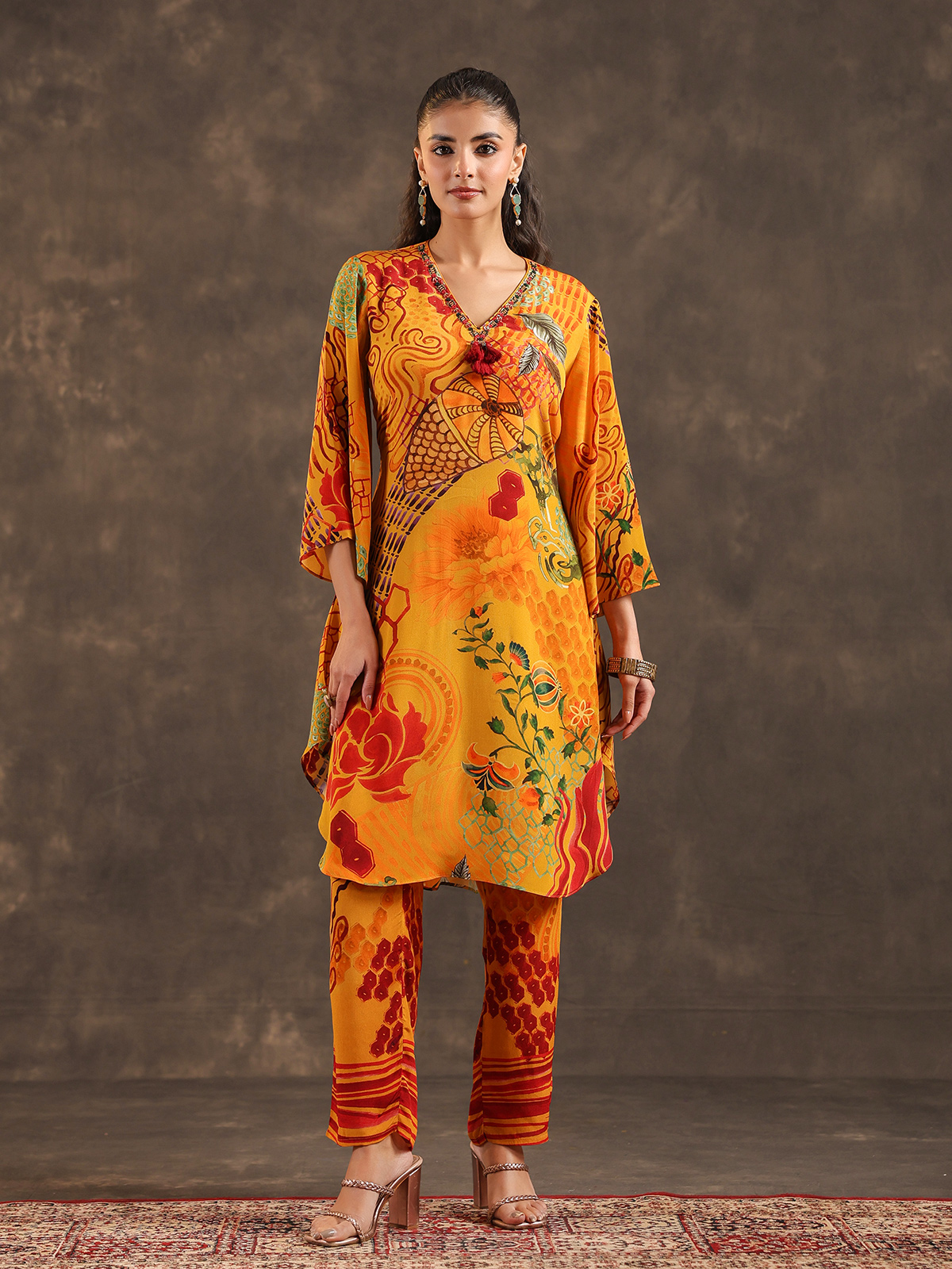 Bright festive tones enhance the charm of this mustard yellow viscose crepe kurti set. The printed kurti features a stylish V neckline with quarter sleeves, delicately embellished with sequins, cutdana and bead detailing. Paired with tailored pants, the ensemble creates a lively ethnic silhouette ideal for casual celebrations.