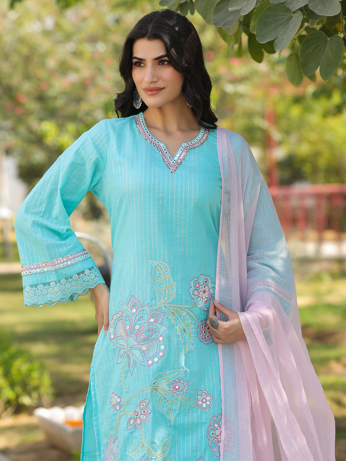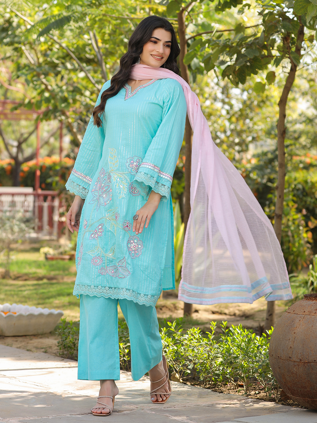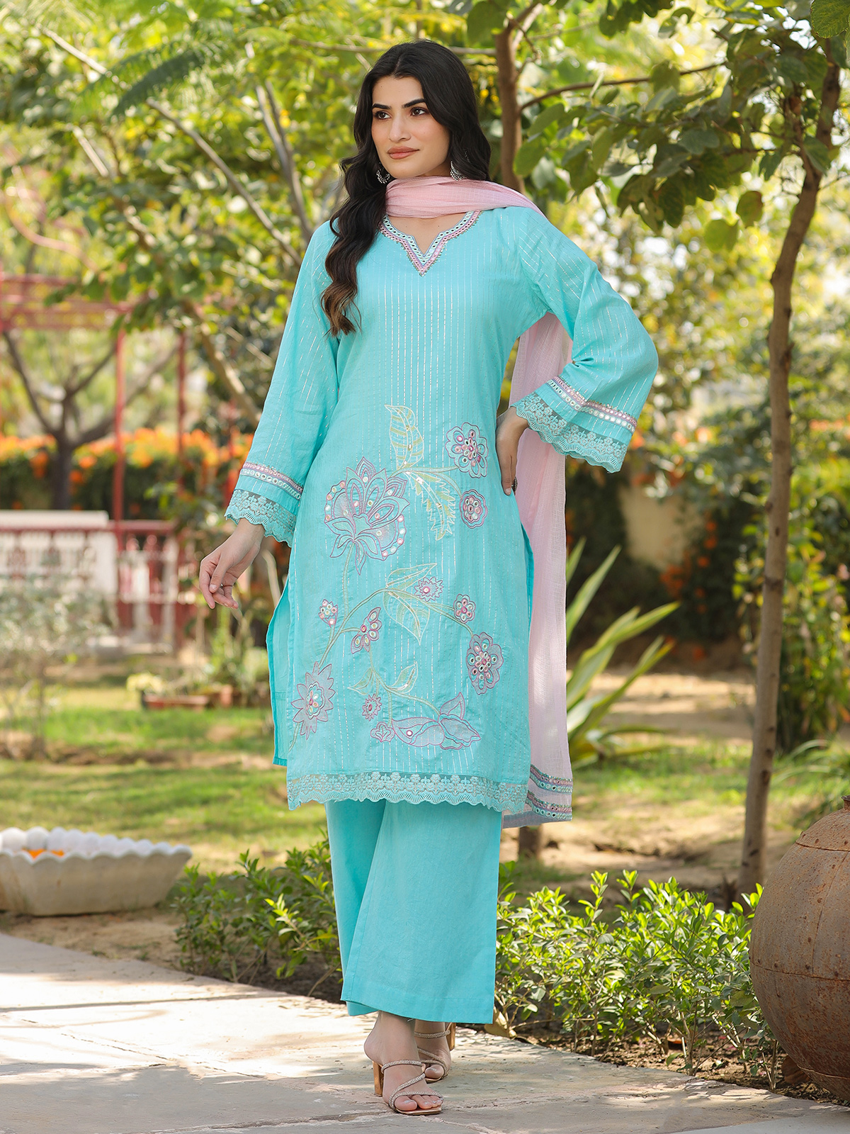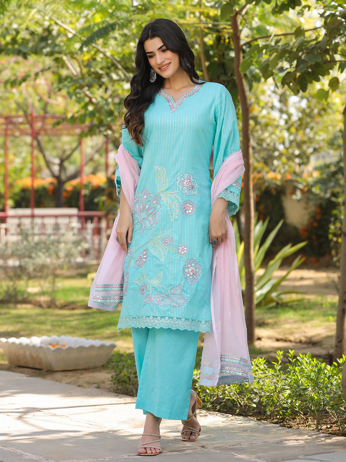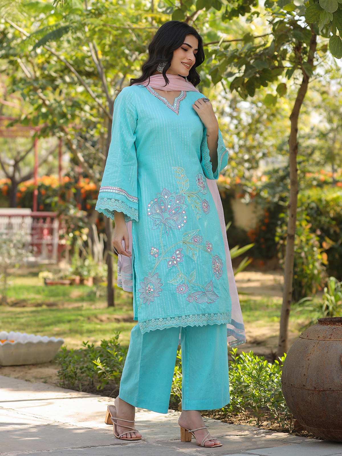 Graceful and vibrant, this aqua blue cotton silk kurti set is perfect for festive gatherings. The kurti features a sweetheart neckline with full sleeves, adorned with intricate embroidery, aabla and sequins work in a Pakistani-style silhouette. Paired with palazzo pants and a soft pink dupatta, it creates a refined festive statement.