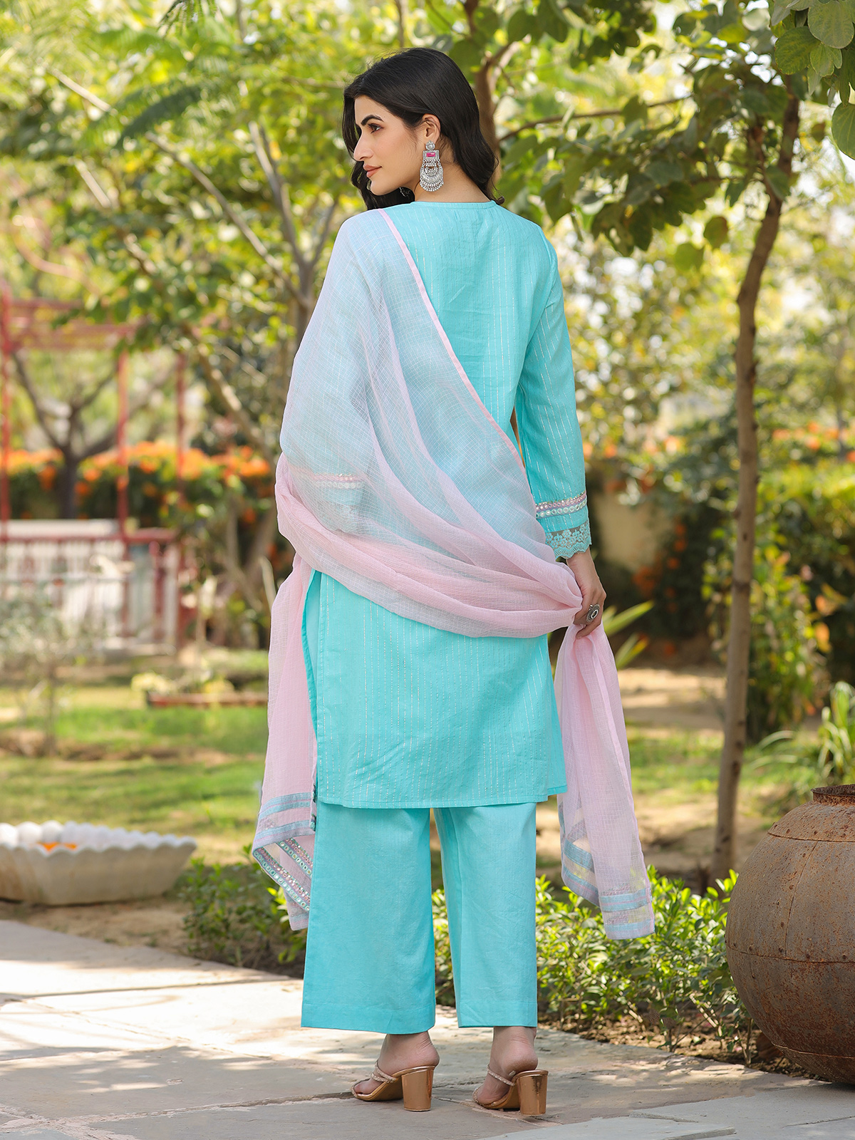 Aqua Blue Cotton Silk Pakistani Style Palazzo Festive Set