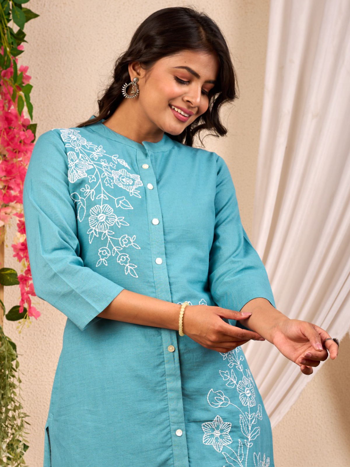 Aqua Cotton Cotton Silk Kurti Set With Thread Embroidery