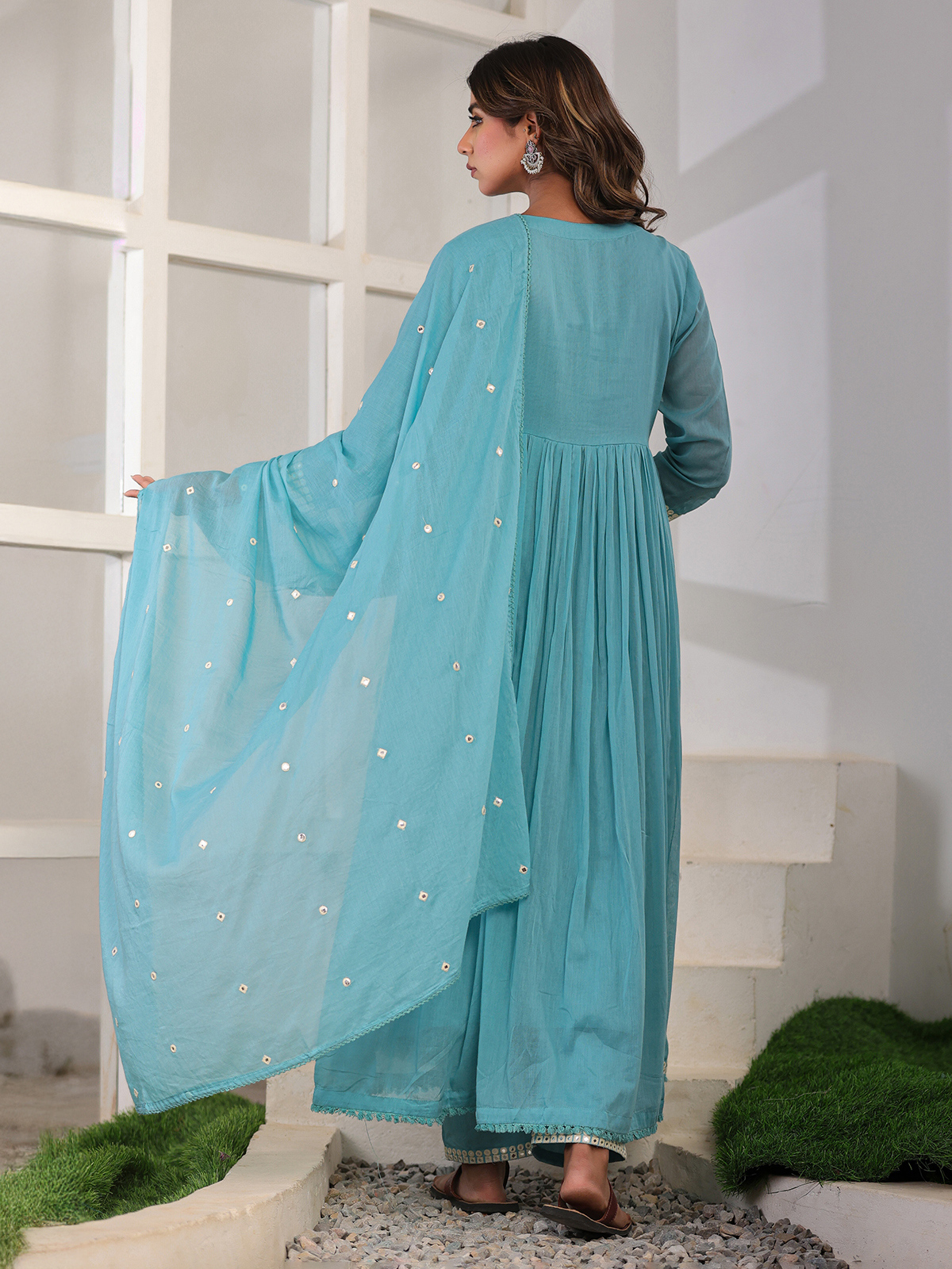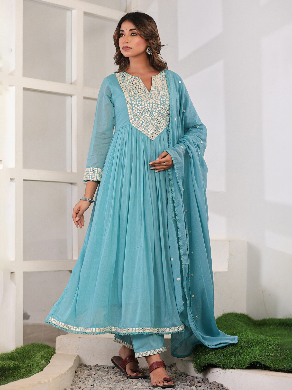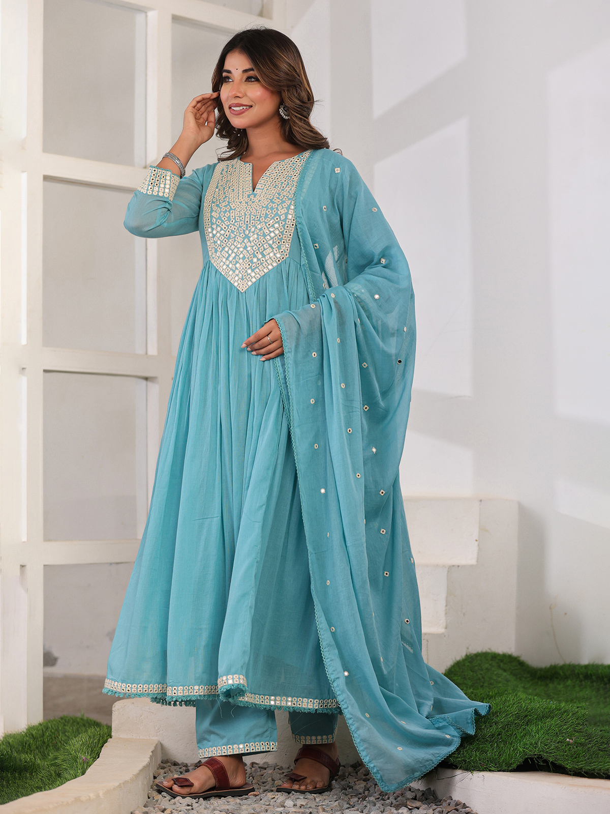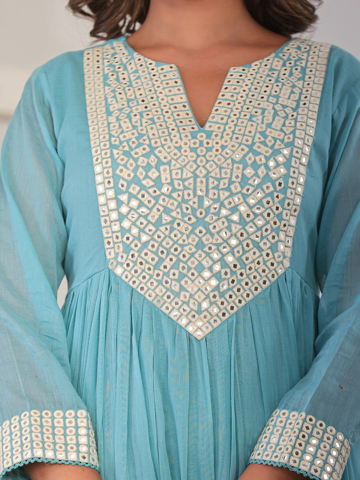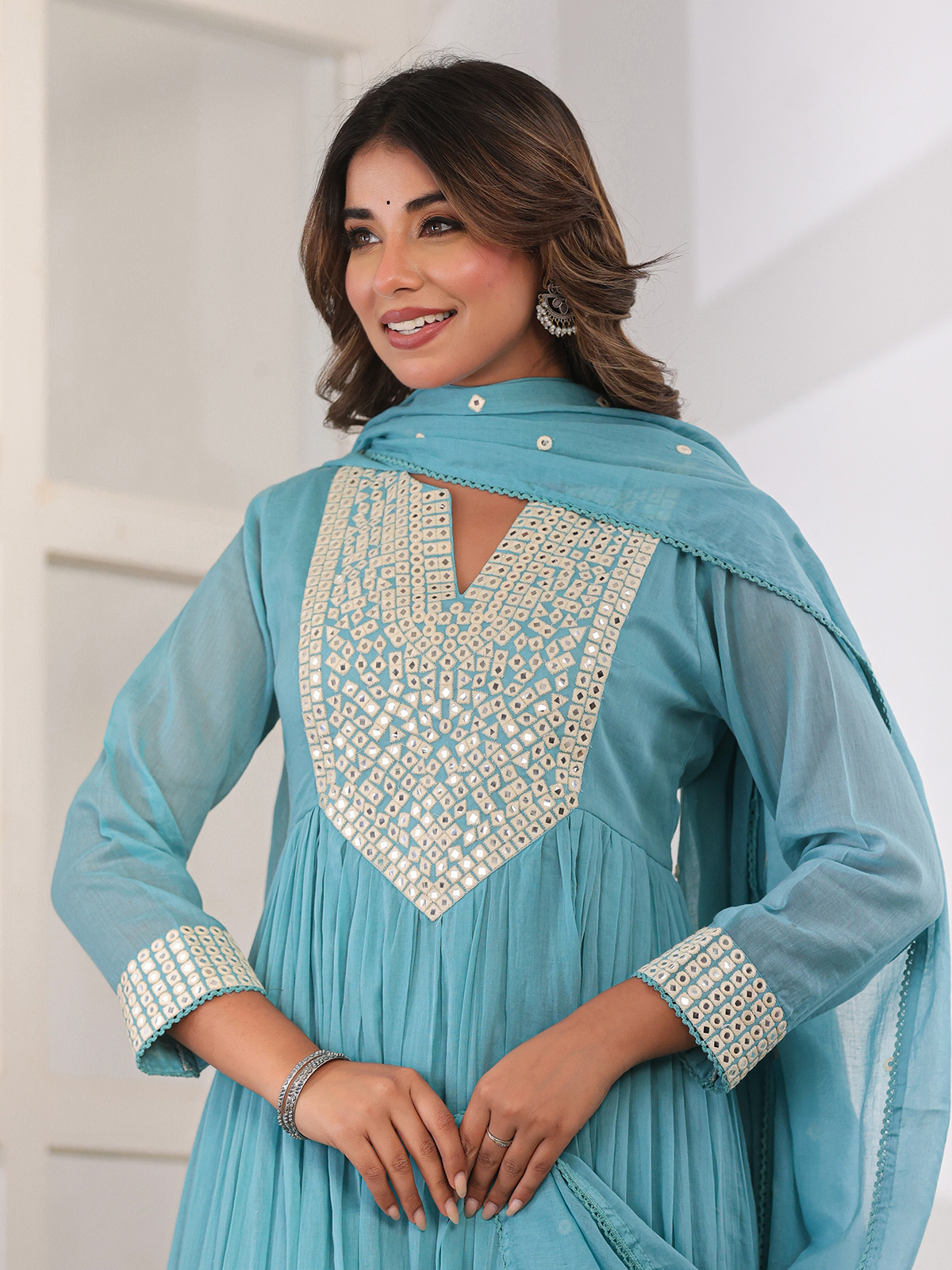 Grace your festive moments in this aqua cotton silk kurti set, adorned with aabla work on the yoke. Designed with quarter sleeves, straight pants, and a soft dupatta, it offers serene elegance for special occasions.