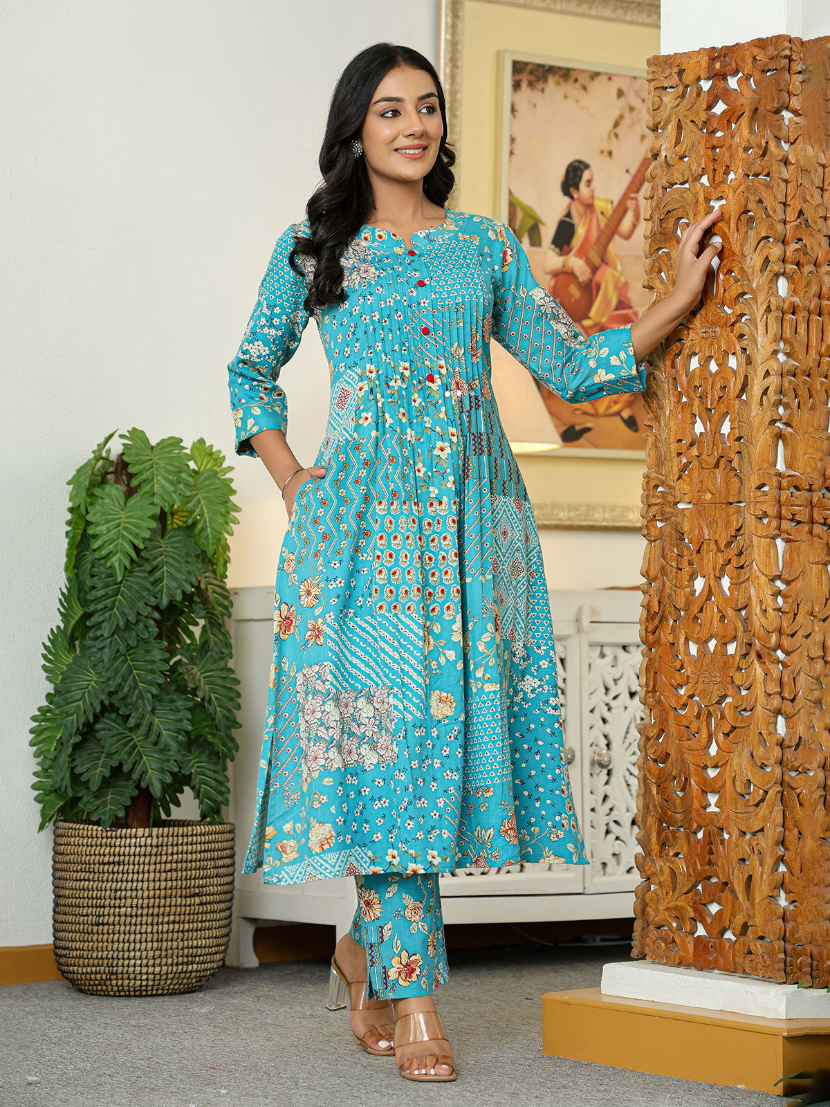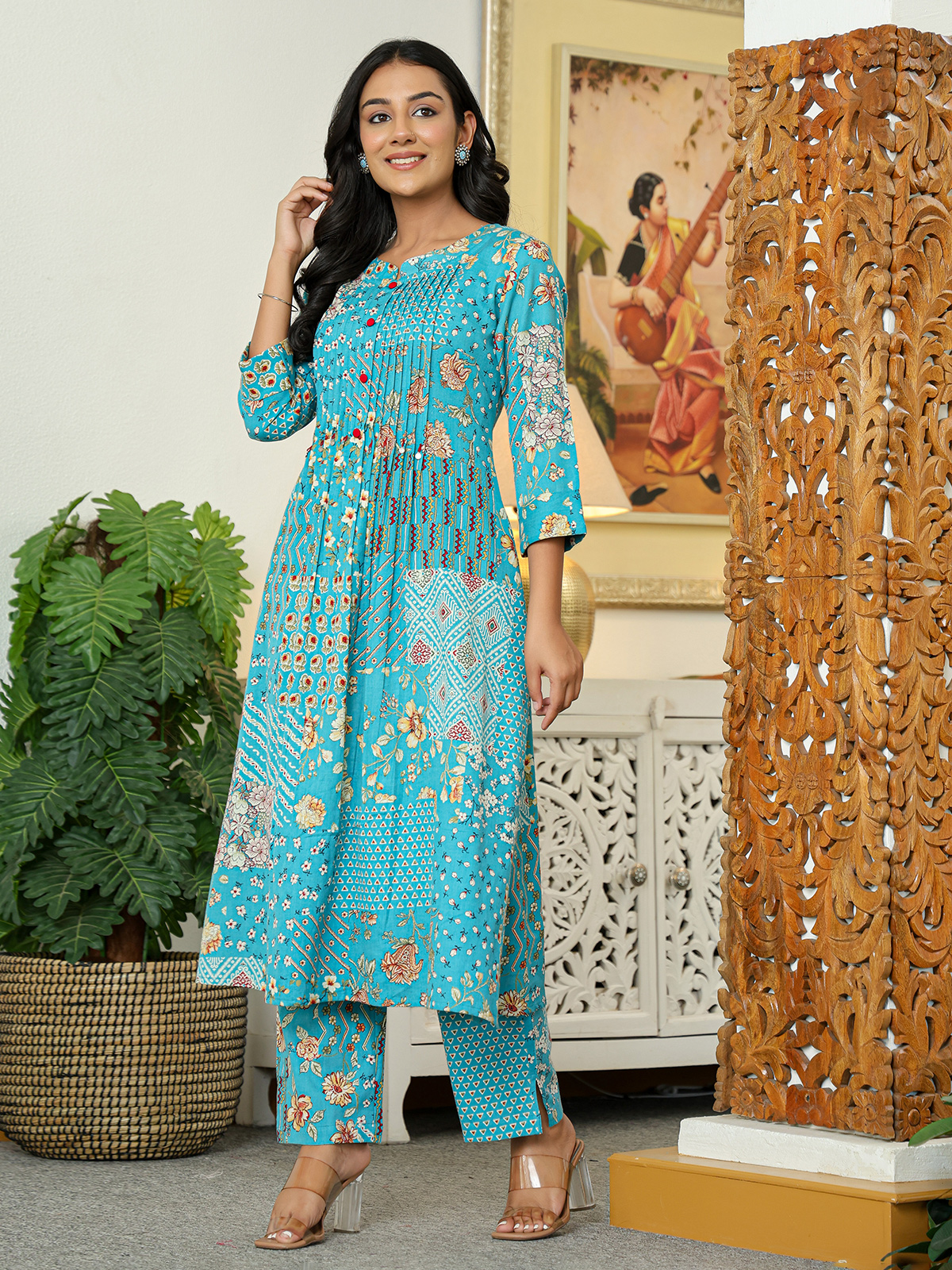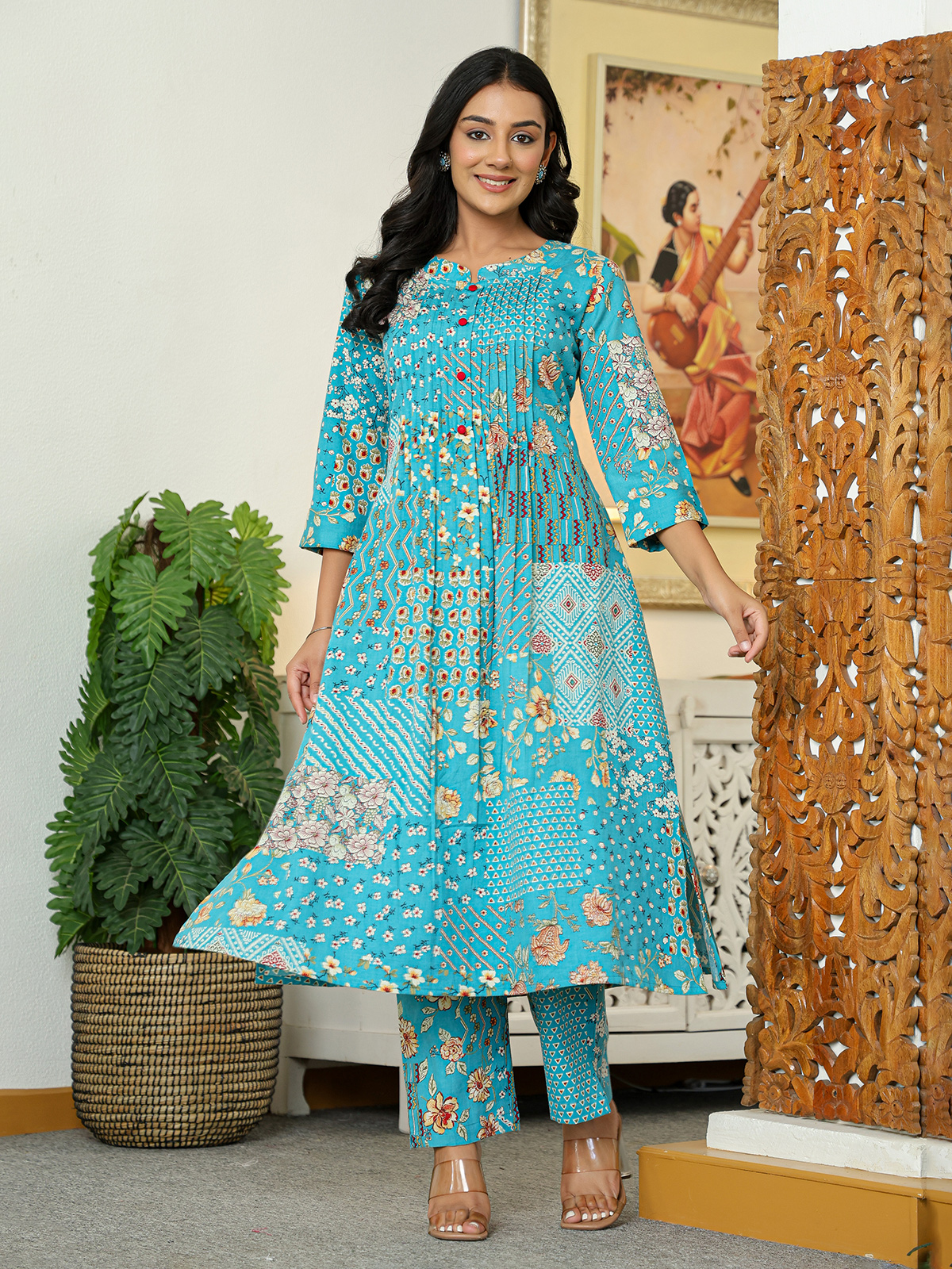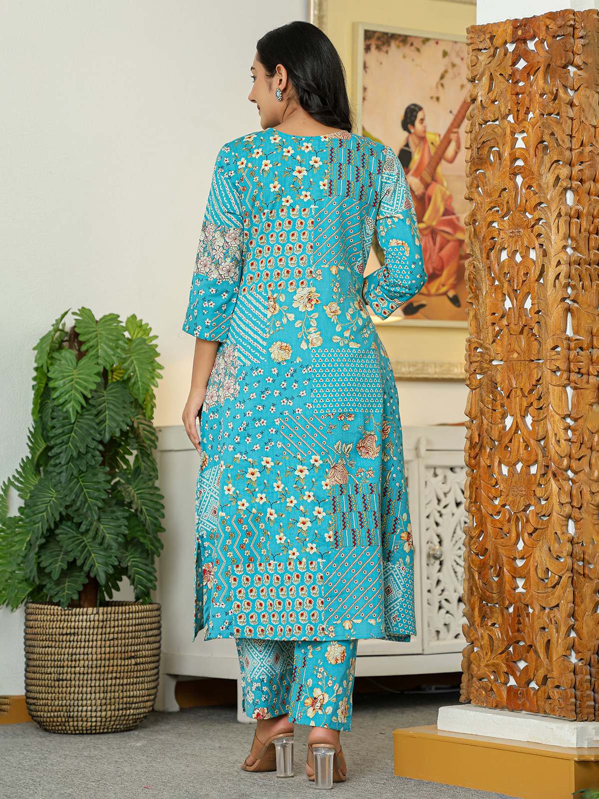 Fresh and lively, this aqua silk kurti set with quarter sleeves and pant is enhanced with a printed finish. Its festive style makes it ideal for day functions and cultural events, ensuring both elegance and comfort.