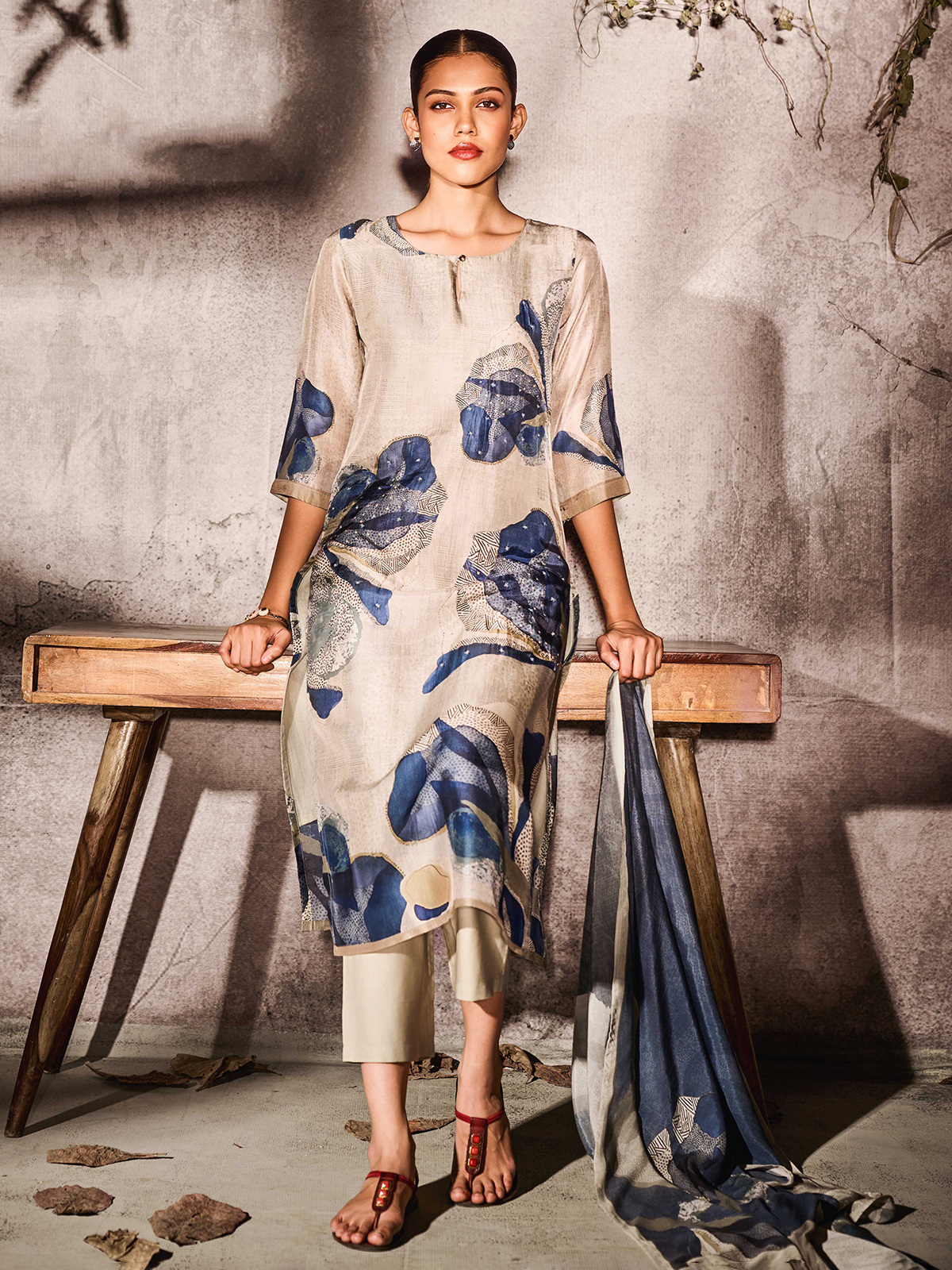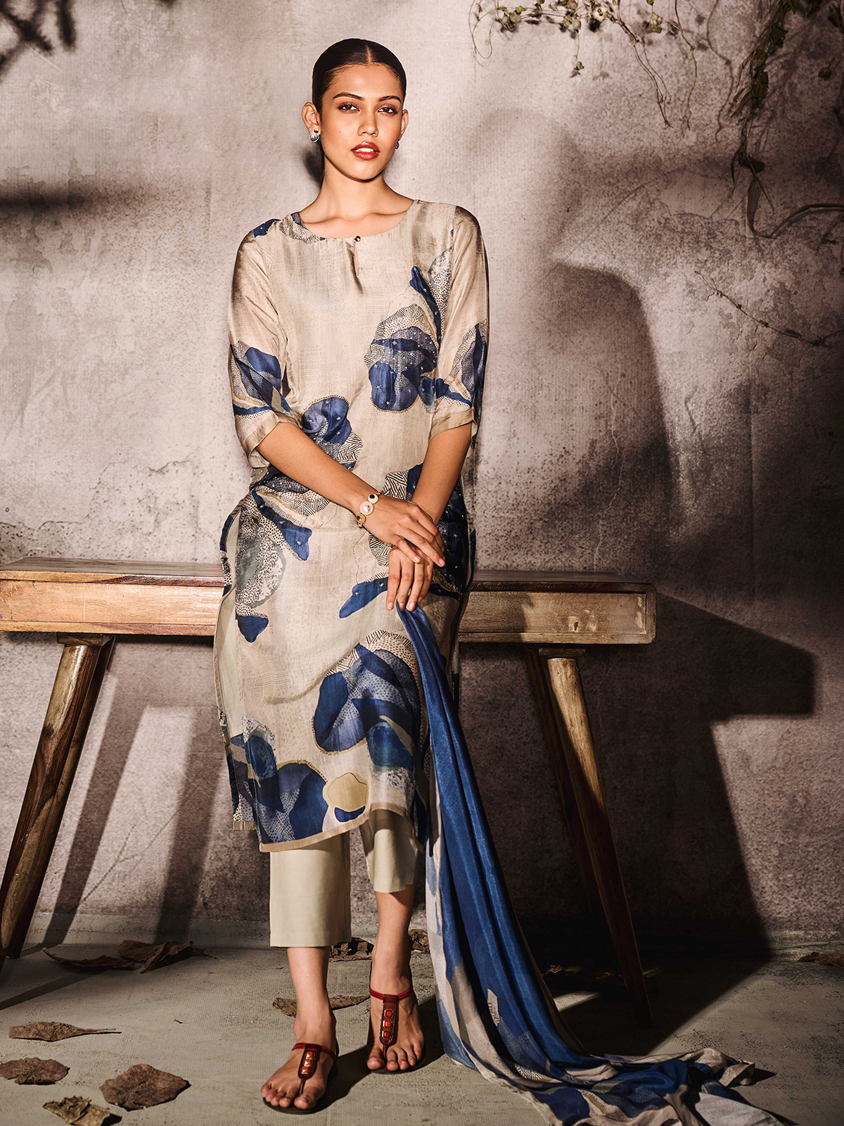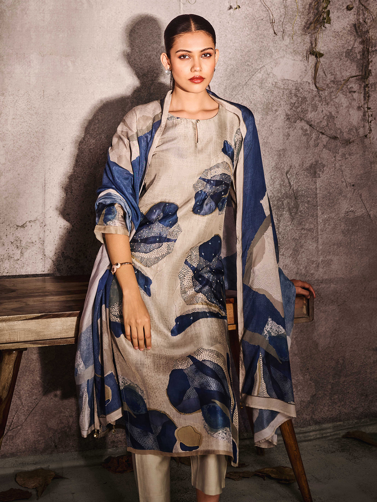 Beige and blue hues merge in smooth silk, illuminated by delicate sequins that gleam with festive light. The keyhole neckline and quarter sleeves lend understated allure. Styled with pant and dupatta, it flows with refined ease for celebrations and calm gatherings alike.