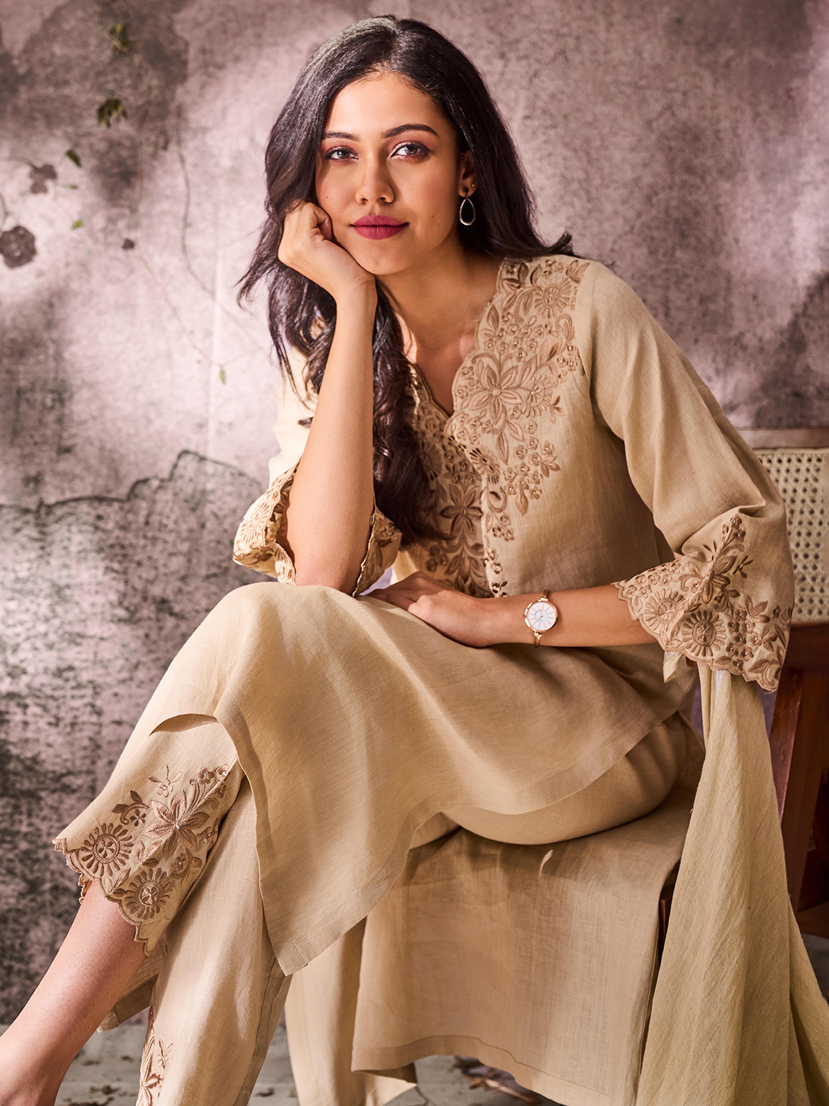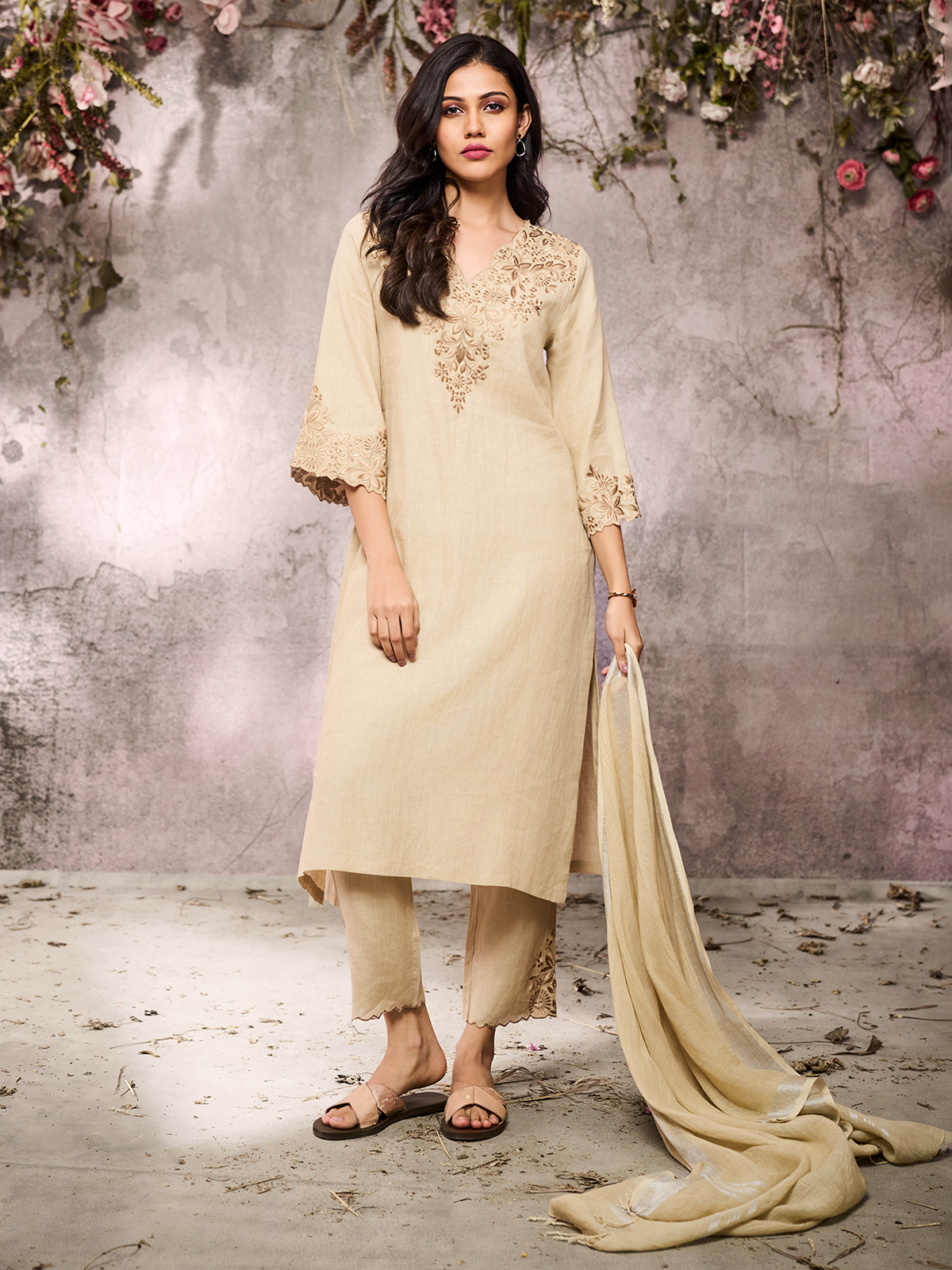 This printed beige cotton kurti set speaks in threads of subtle embroidery, radiating timeless charm. A V-neckline with quarter sleeves adds soft structure. Teamed with pant and dupatta, it transitions gracefully from casual comfort to festive sophistication.