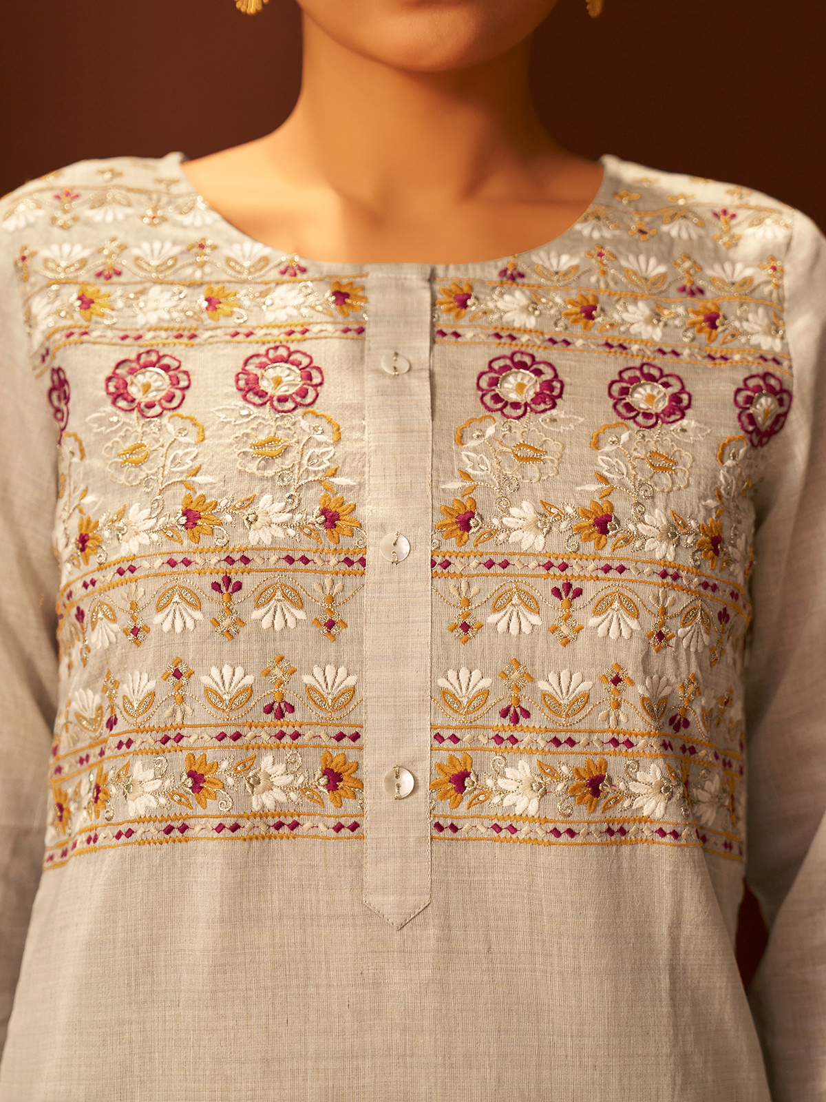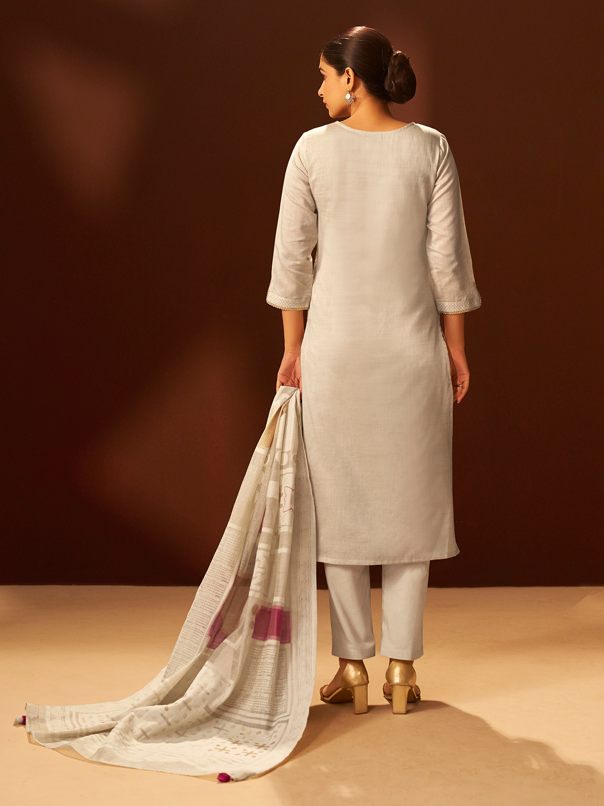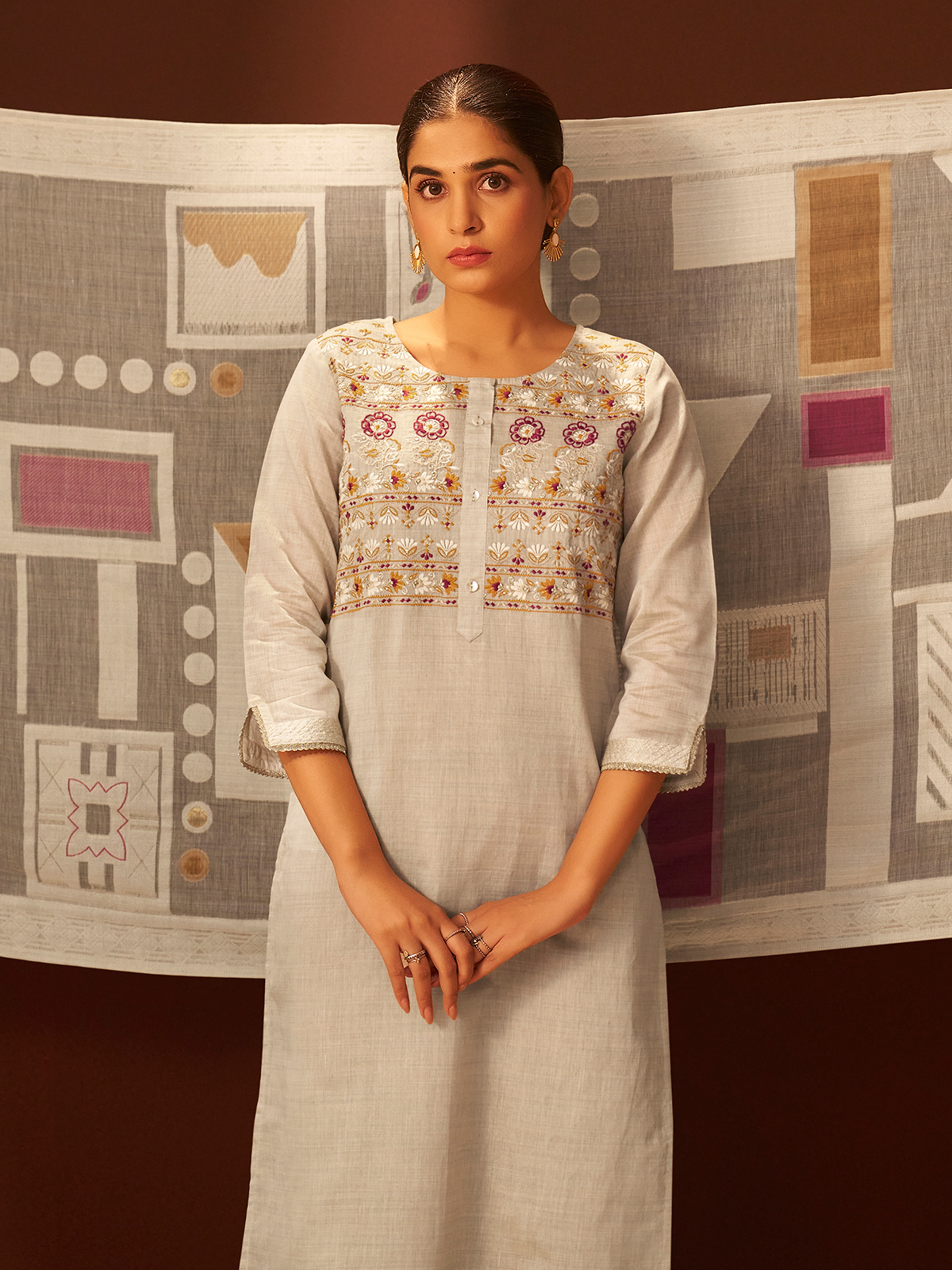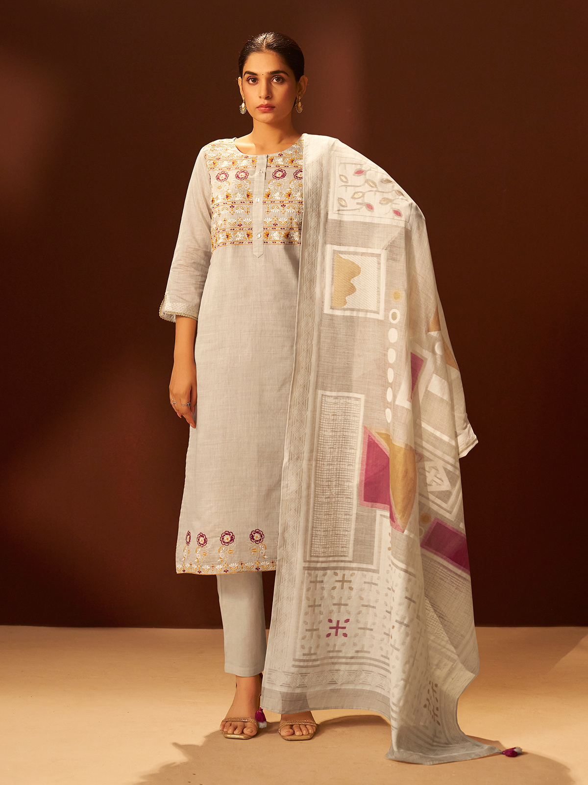 Beige Cotton Linen Embroidered Kurti Set With Dupatta