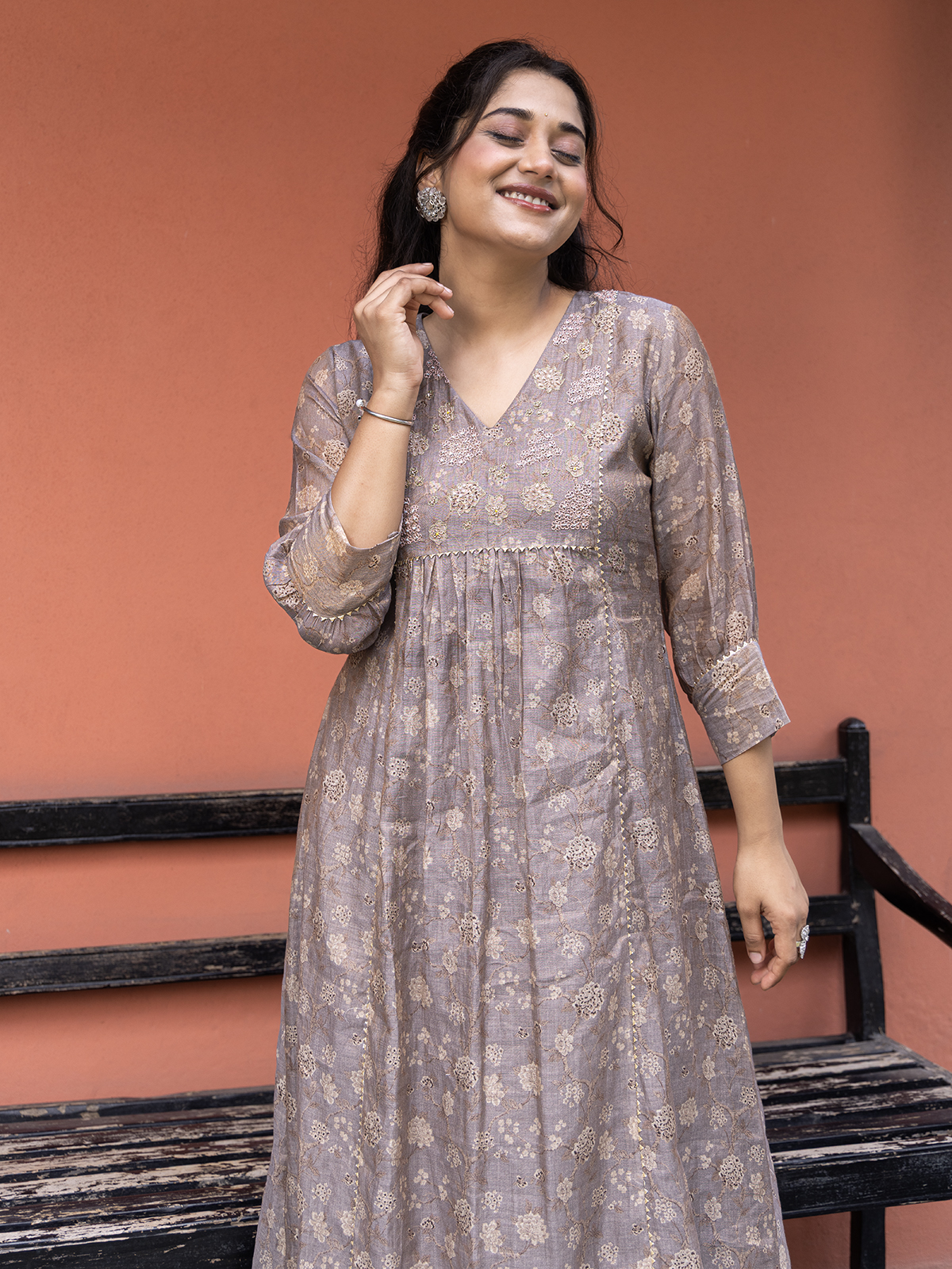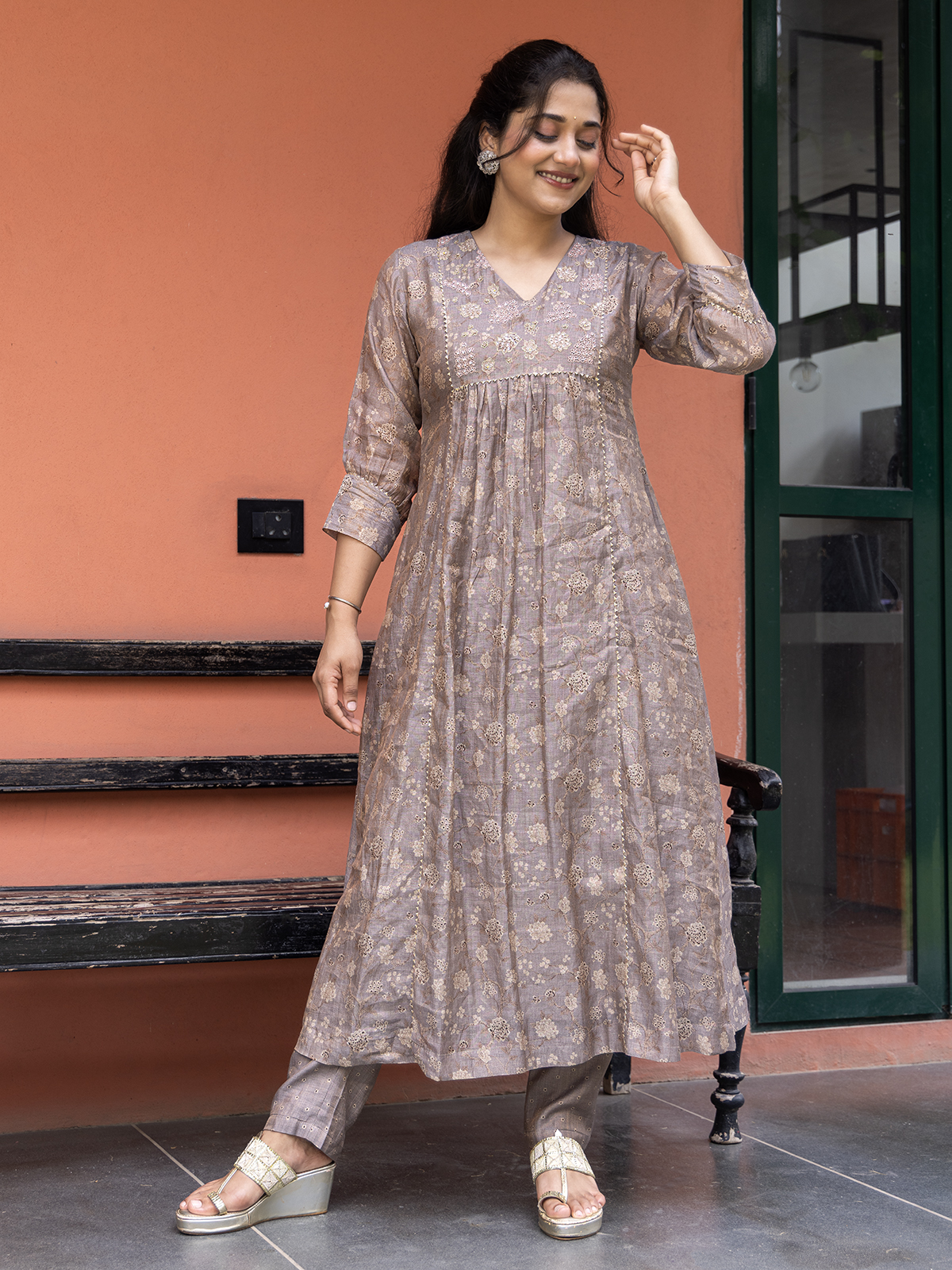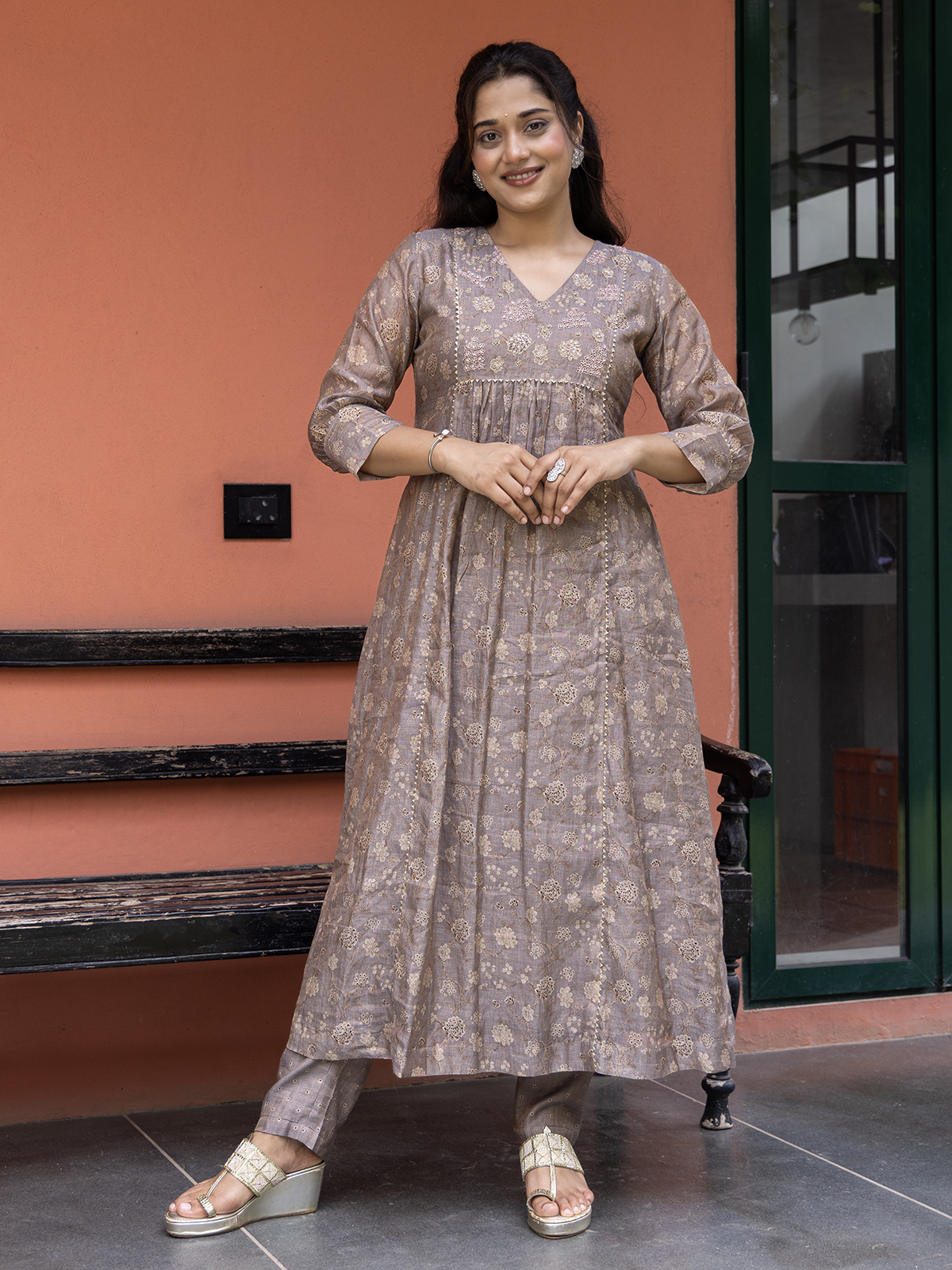 Crafted in a soft dark beige cotton fabric, the kurti set brings together comfort and ethnic finesse. The intricate detailing of resham, cutdana, sequins, and zardosi work lends subtle richness, while the V neckline and quarter sleeves add to its graceful charm. Paired with a complementing pant for a complete look.