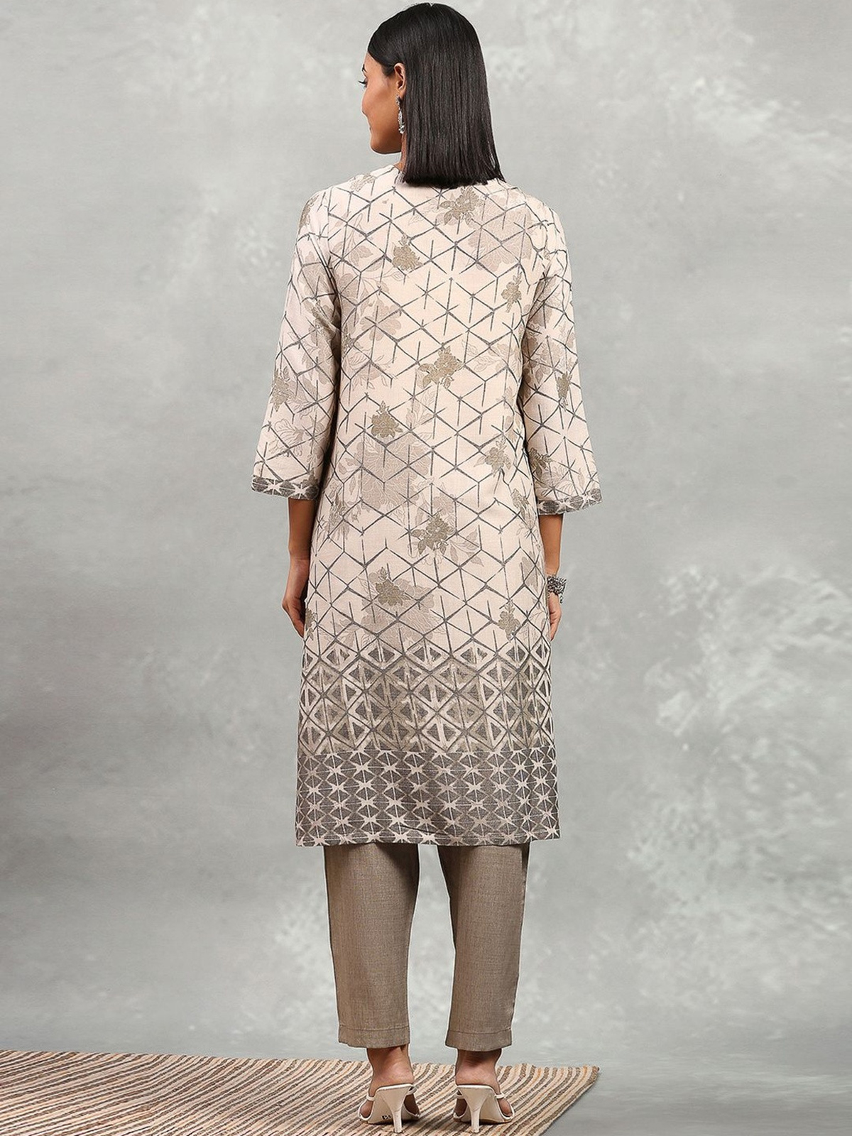 Fashioned in fine beige cotton, this printed kurti set reflects minimal sophistication and festive warmth. The V-neckline and quarter sleeves bring an aura of calm elegance. Paired with tonal pants, it flows with understated charm perfect for serene celebrations.