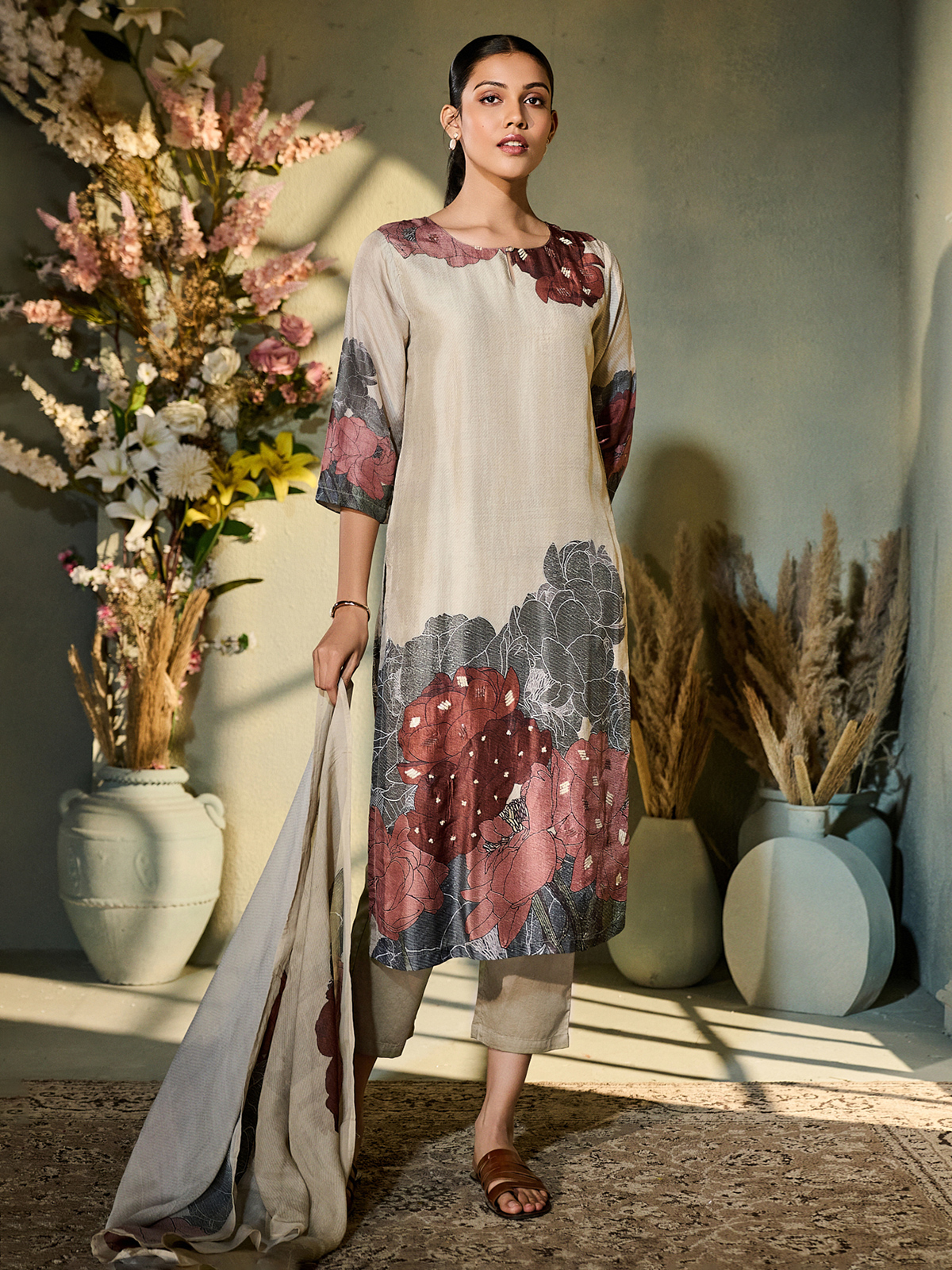 Beige silk radiates festive brightness, its printed surface touched with sequins shimmer. The keyhole neckline and quarter sleeves add elegant form. Styled with pant and dupatta, it offers timeless charm infused with soft grace.