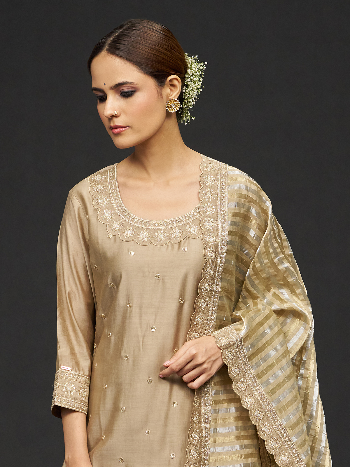 Beige Resham Sequins Silk Kurti Pant Dupatta Set