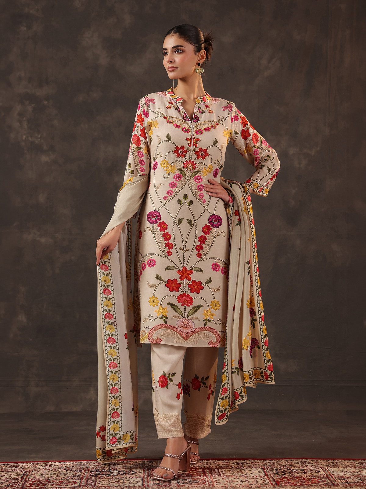 Beige Russian Silk Floral Printed Kurti Set With Dupatta