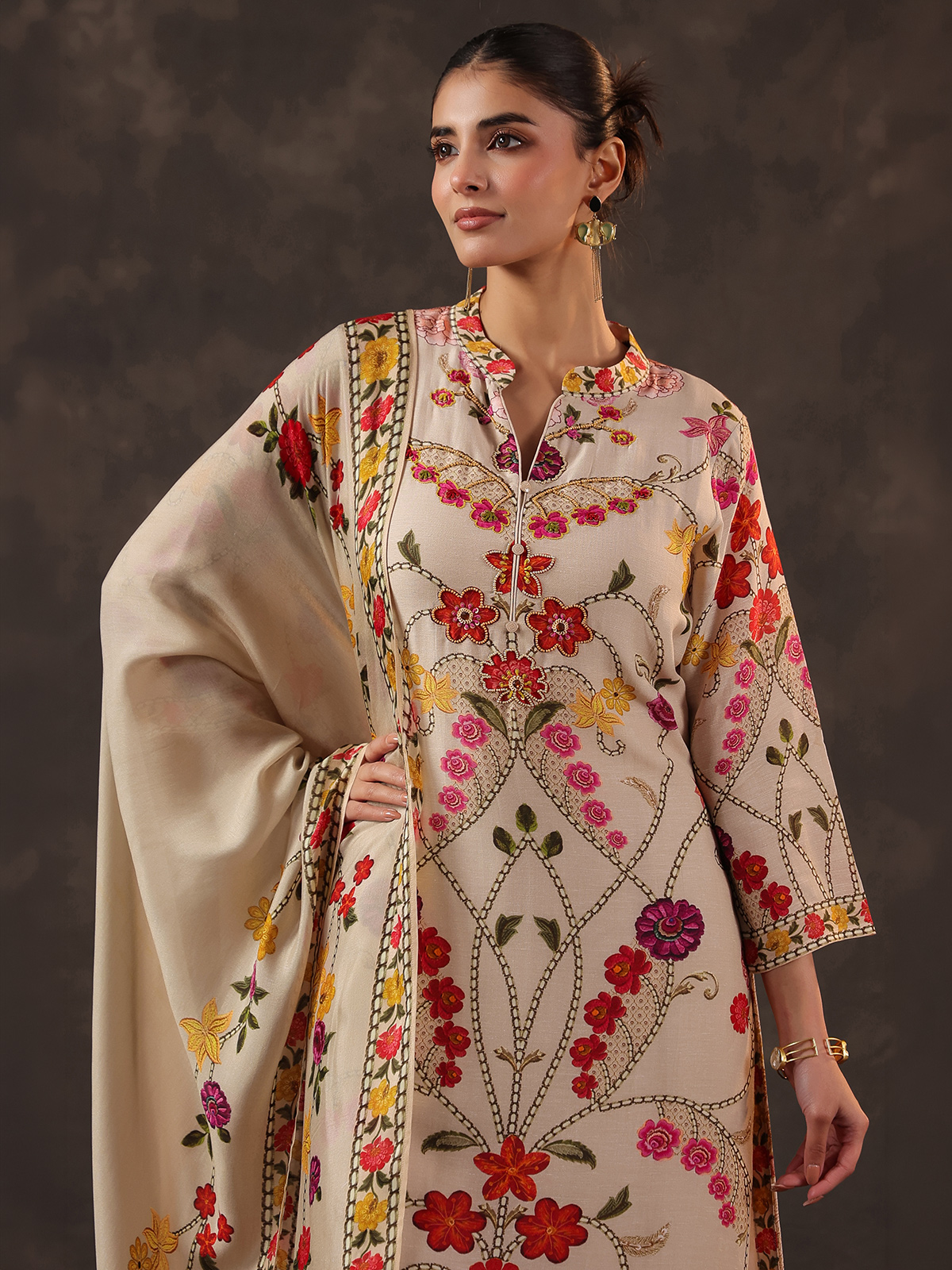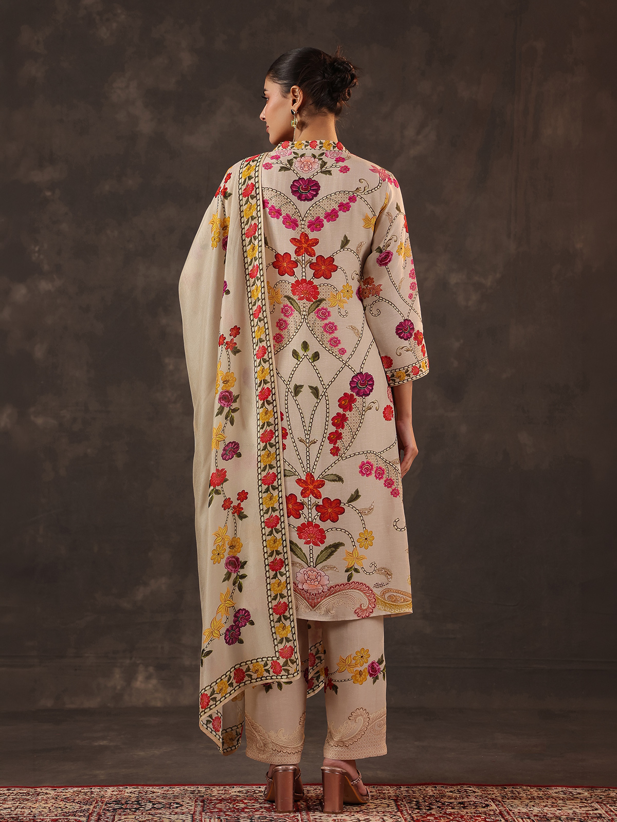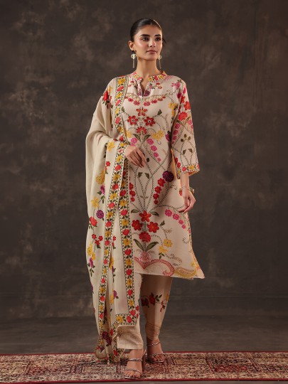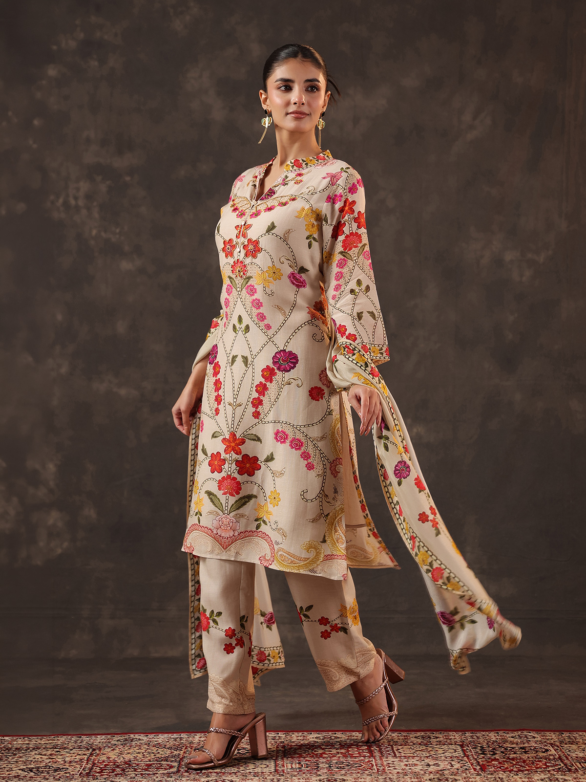 Soft elegance defines this beige russian silk kurti set designed with floral artistry. The printed kurti features a graceful stand collar and quarter sleeves. Delicately enhanced with beads, sequins and thread embellishments. Styled with pants and a coordinated dupatta, the ensemble offers a timeless ethnic look perfect for casual festivities.