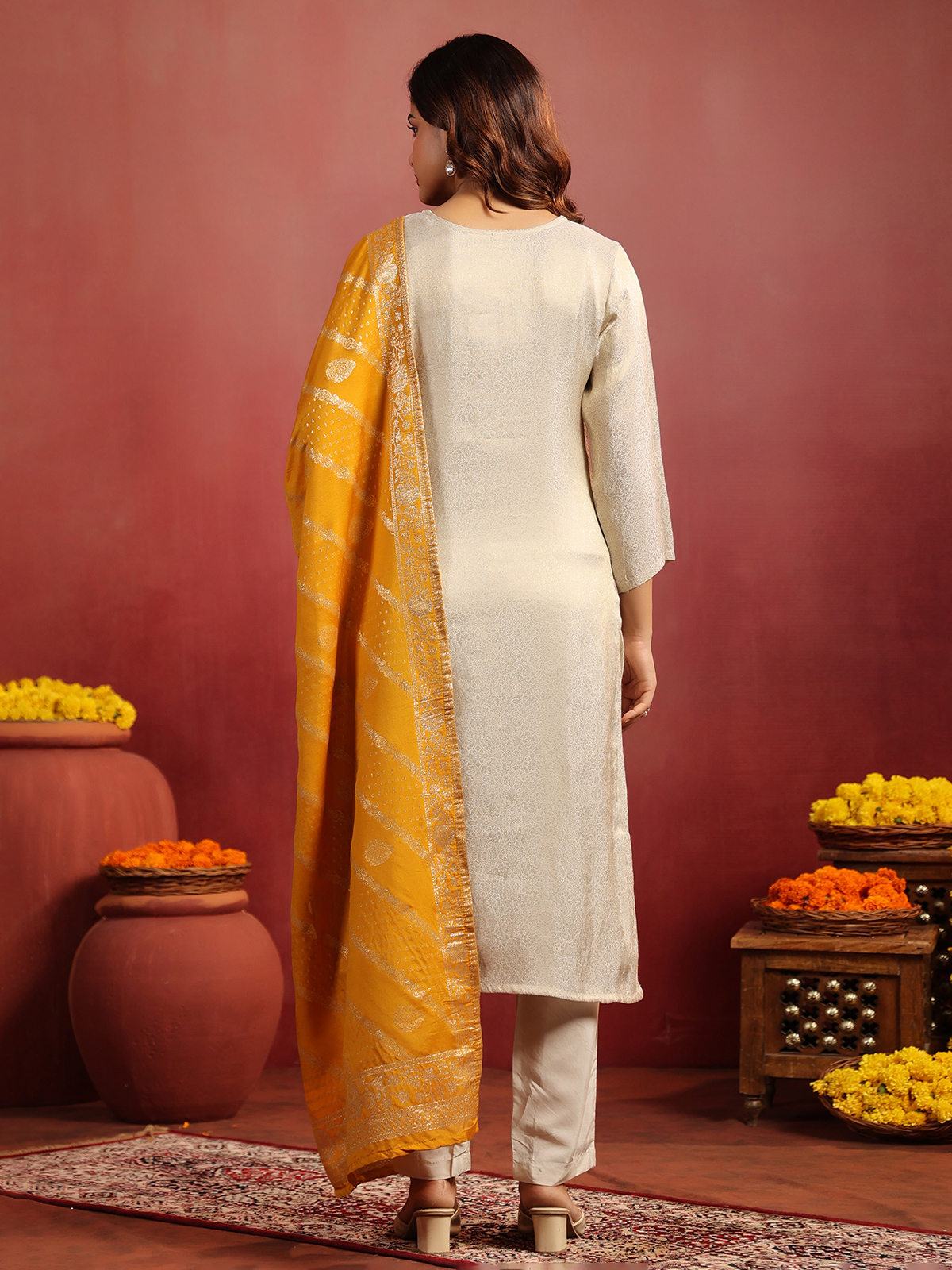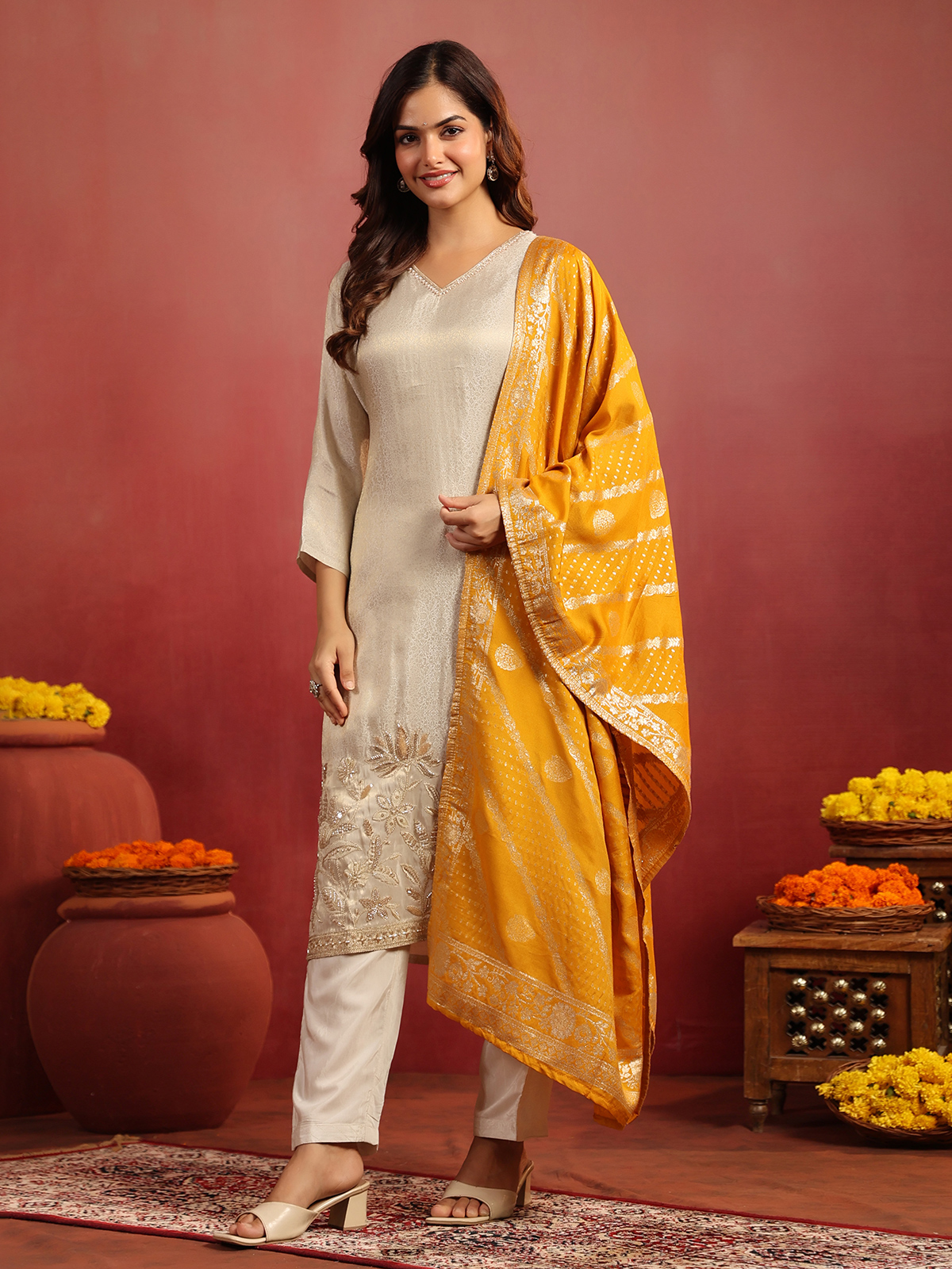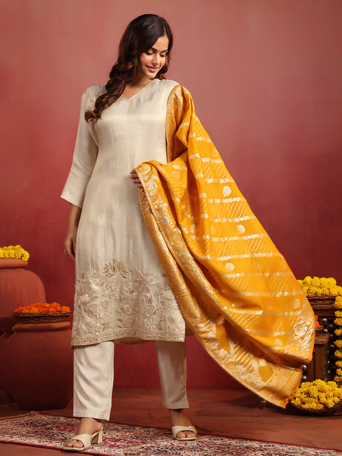 Sophisticated beige silk straight cut kurti set detailed with rich embroidery, cutdana, beads, sequins, thread and zari work. Styled with a V neckline and quarter sleeves, it includes a pant and contrast dupatta, making it suitable for festive and ethnic events.