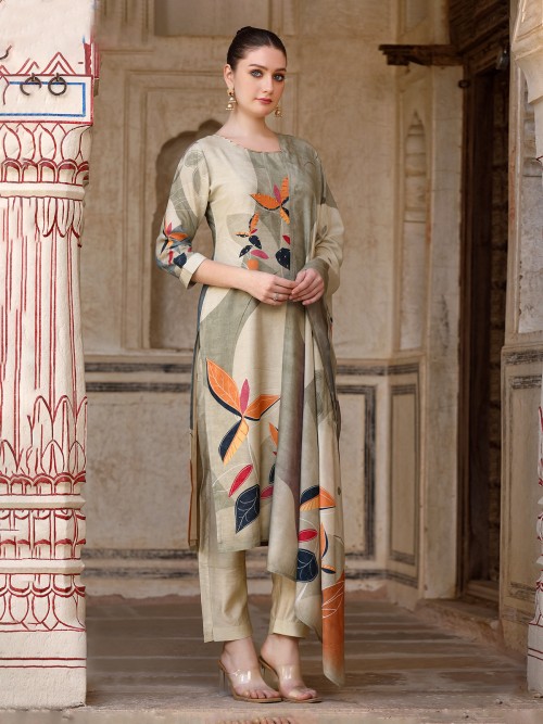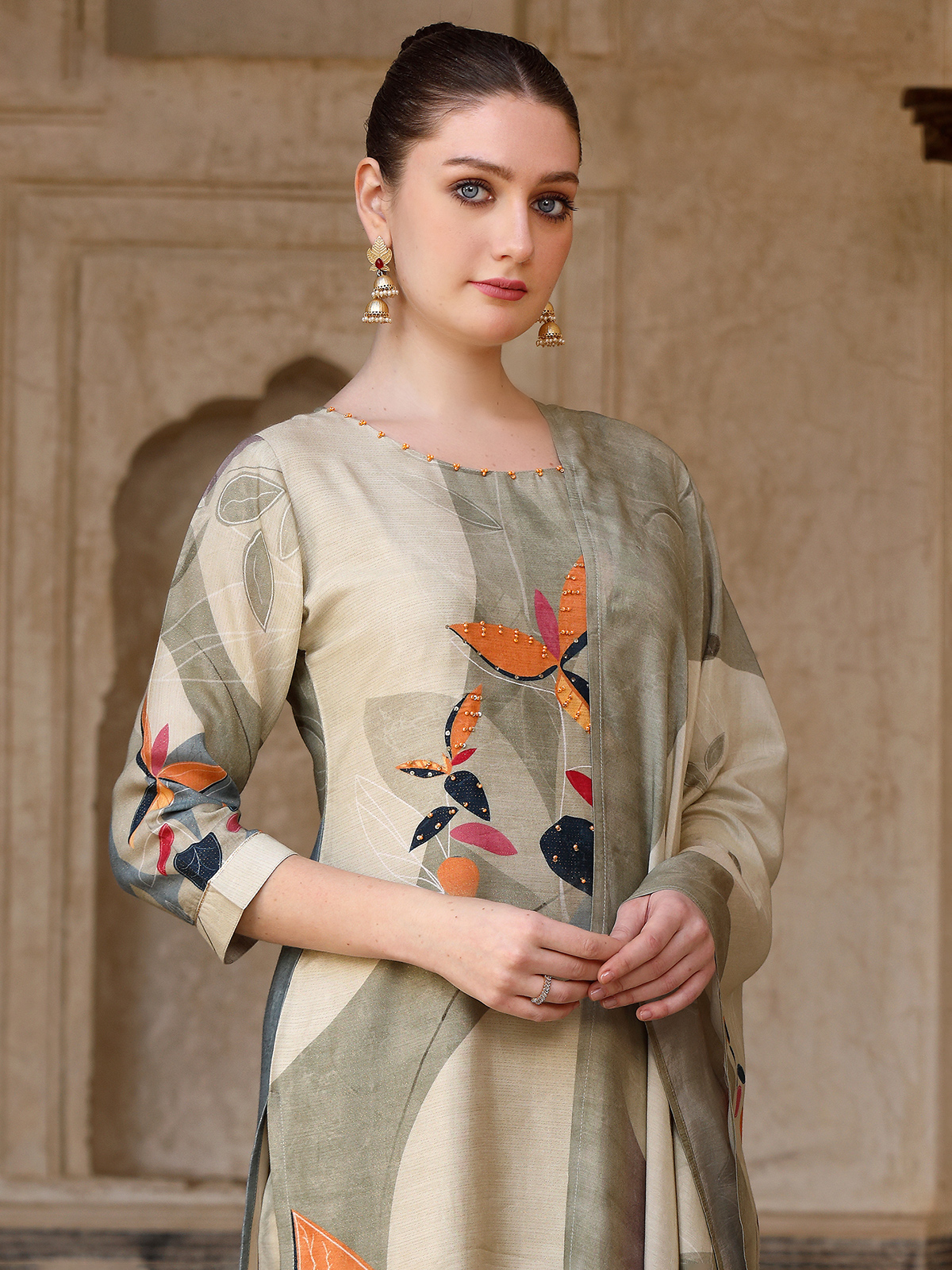 Refined in beige silk, this printed kurti set is accentuated with sequins and bead detailing. Designed with a round neckline and quarter sleeves, and paired with pant and dupatta, it creates a graceful festive look with understated sophistication.