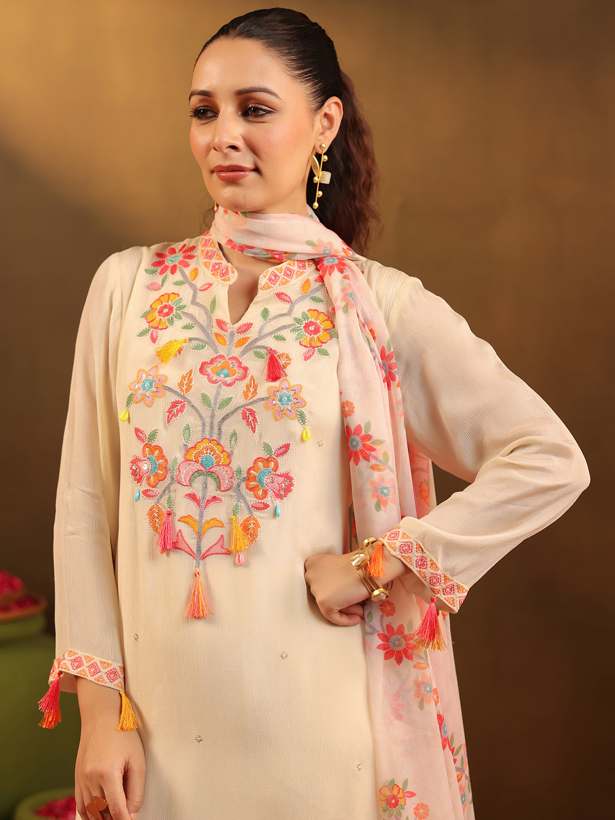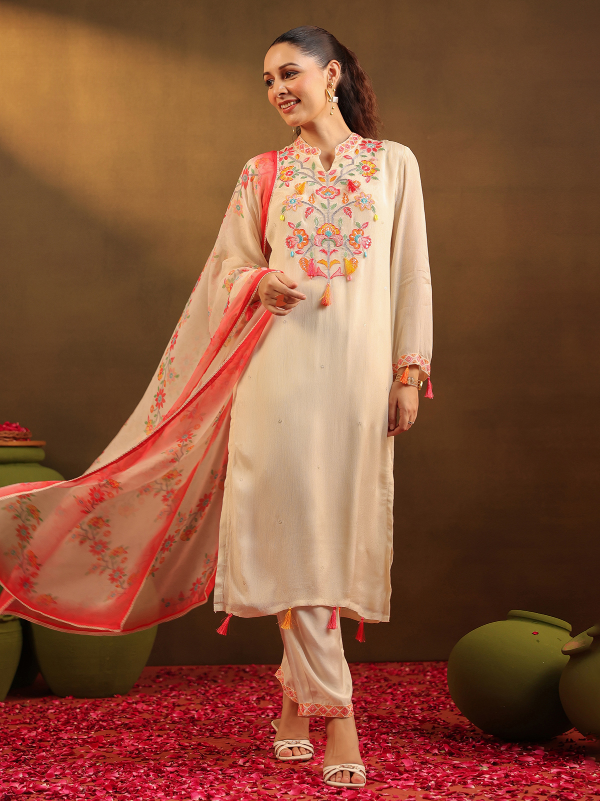 Grace your occasions with this beige georgette kurti set. Crafted in a straight-cut design, it is beautifully detailed with embroidery and sequins work. Accompanied by pant and dupatta, along with quarter sleeves, this ensemble blends sophistication and festivity with ease.
