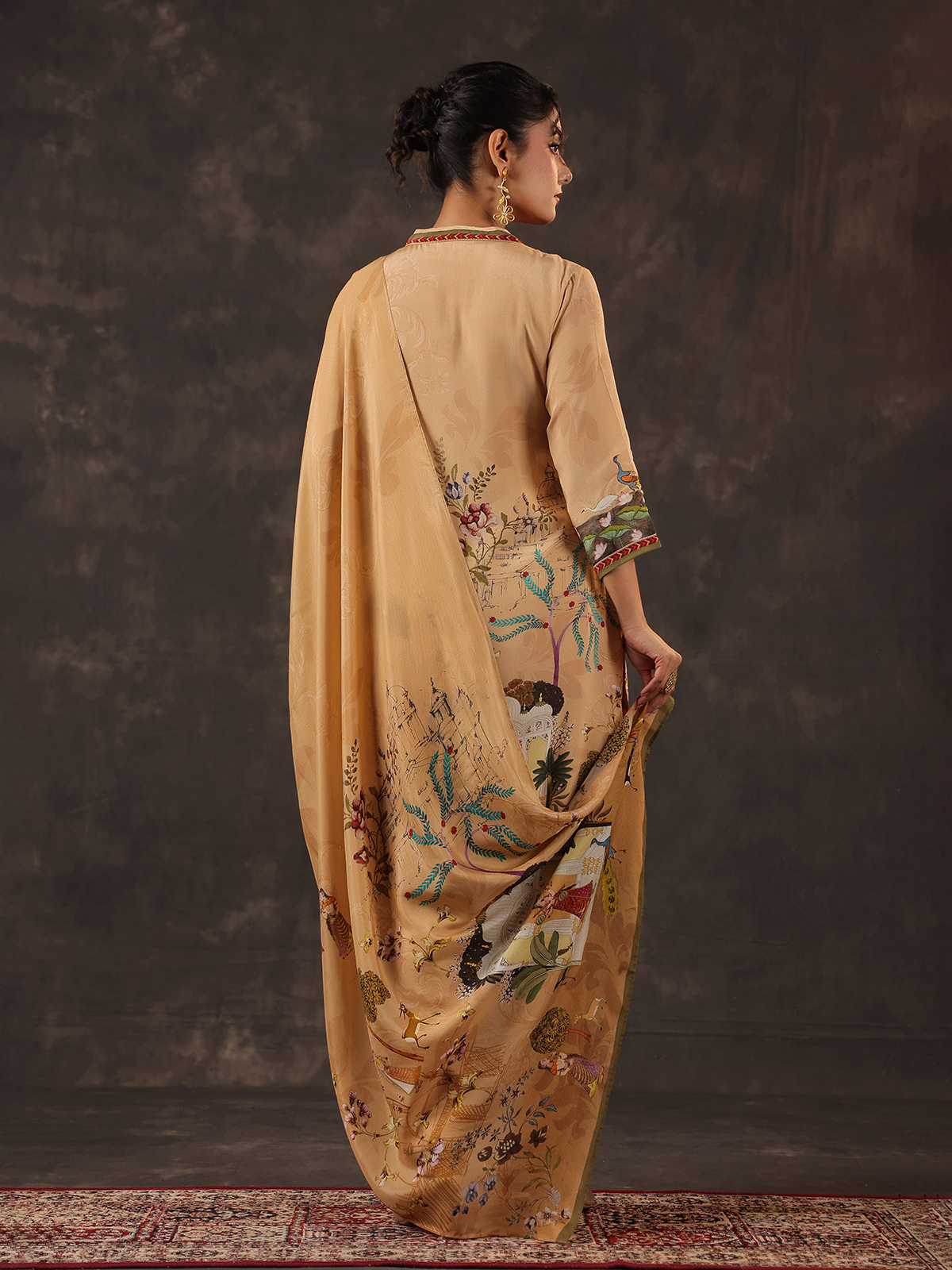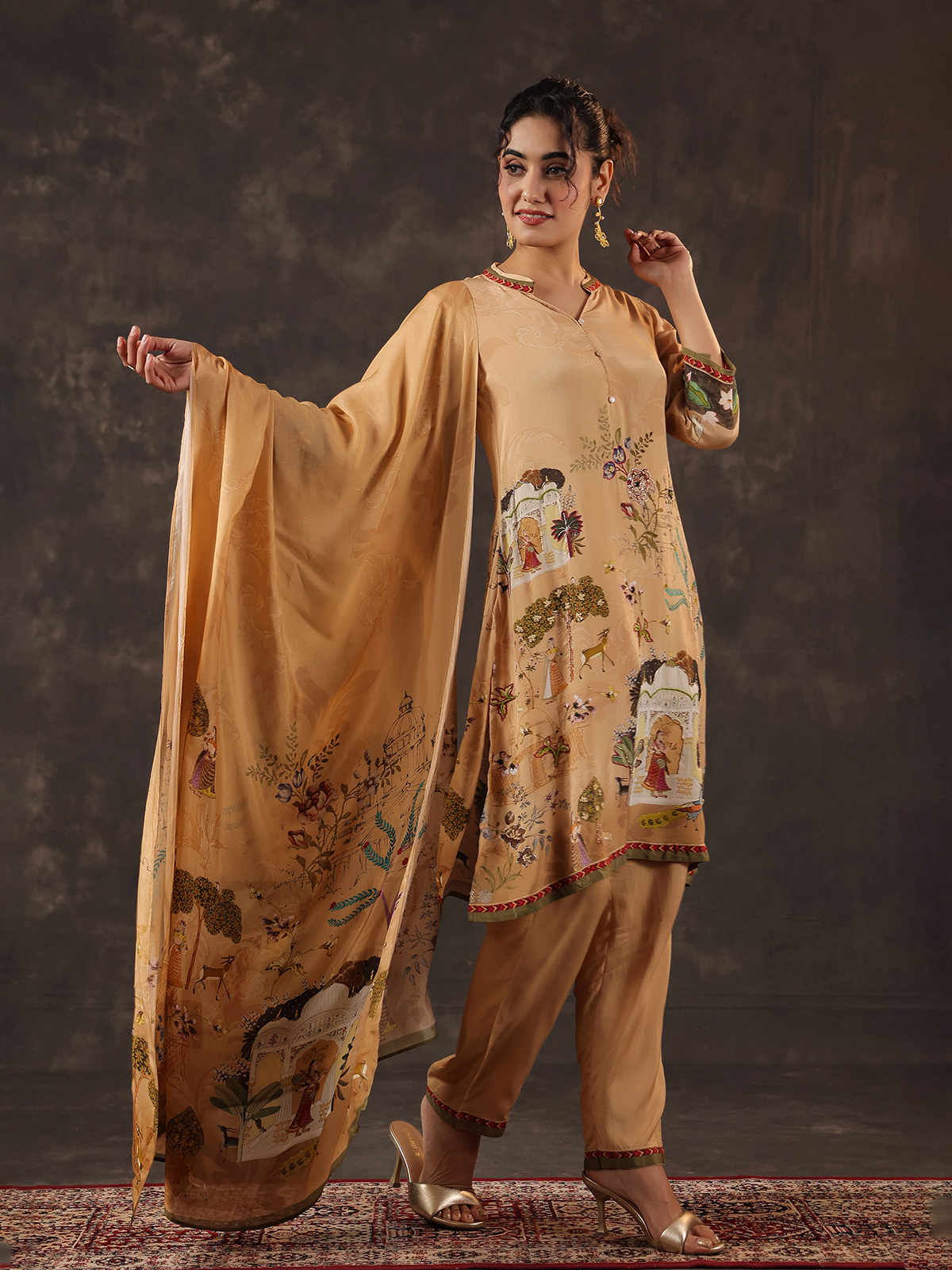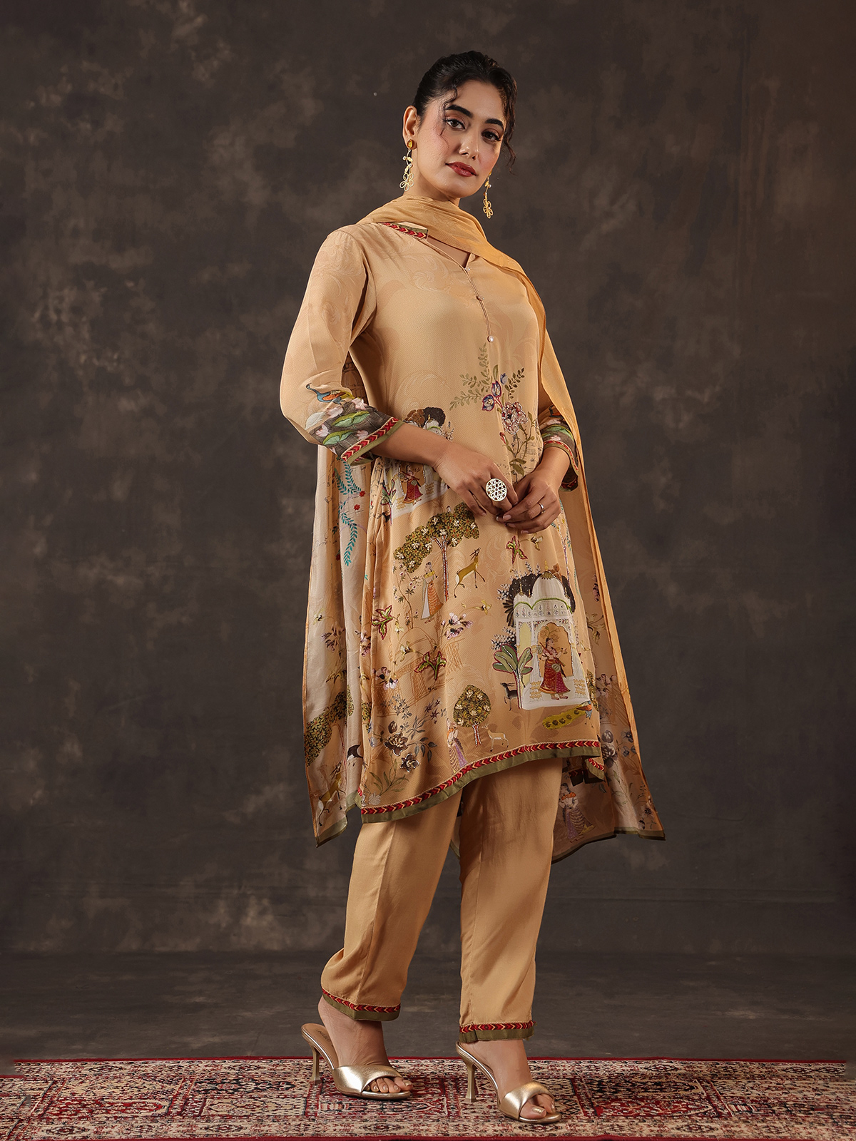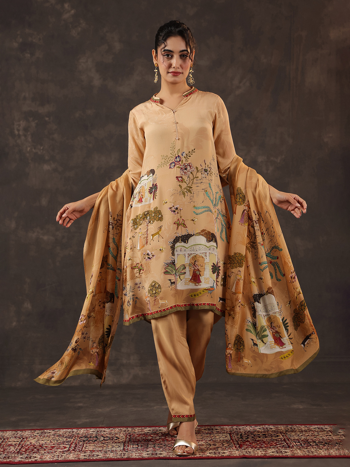 Elegant and timeless beige viscose crepe kurti set brings subtle festive charm. The printed kurti is designed with a stylish collar neckline and quarter sleeves. Adorned with sequins, beads, thread and delicate zardosi detailing. Paired with pants and a graceful dupatta, the ensemble creates a refined ethnic silhouette perfect for festive occasions.