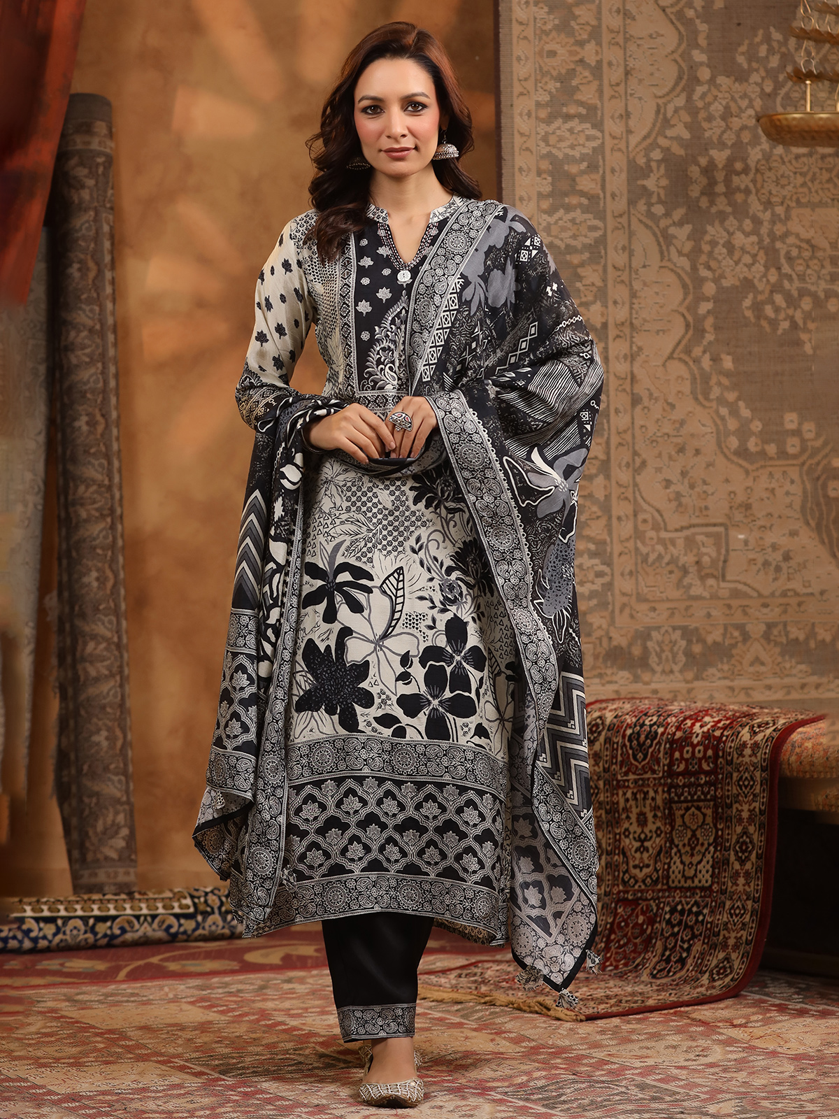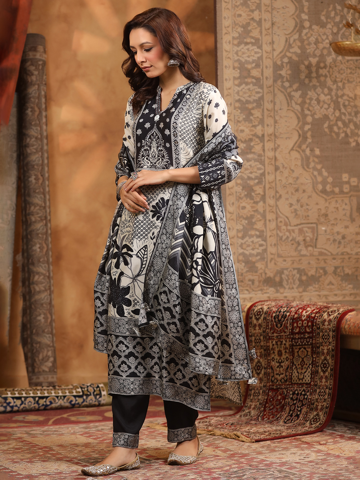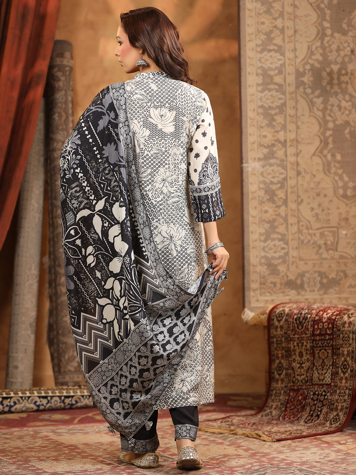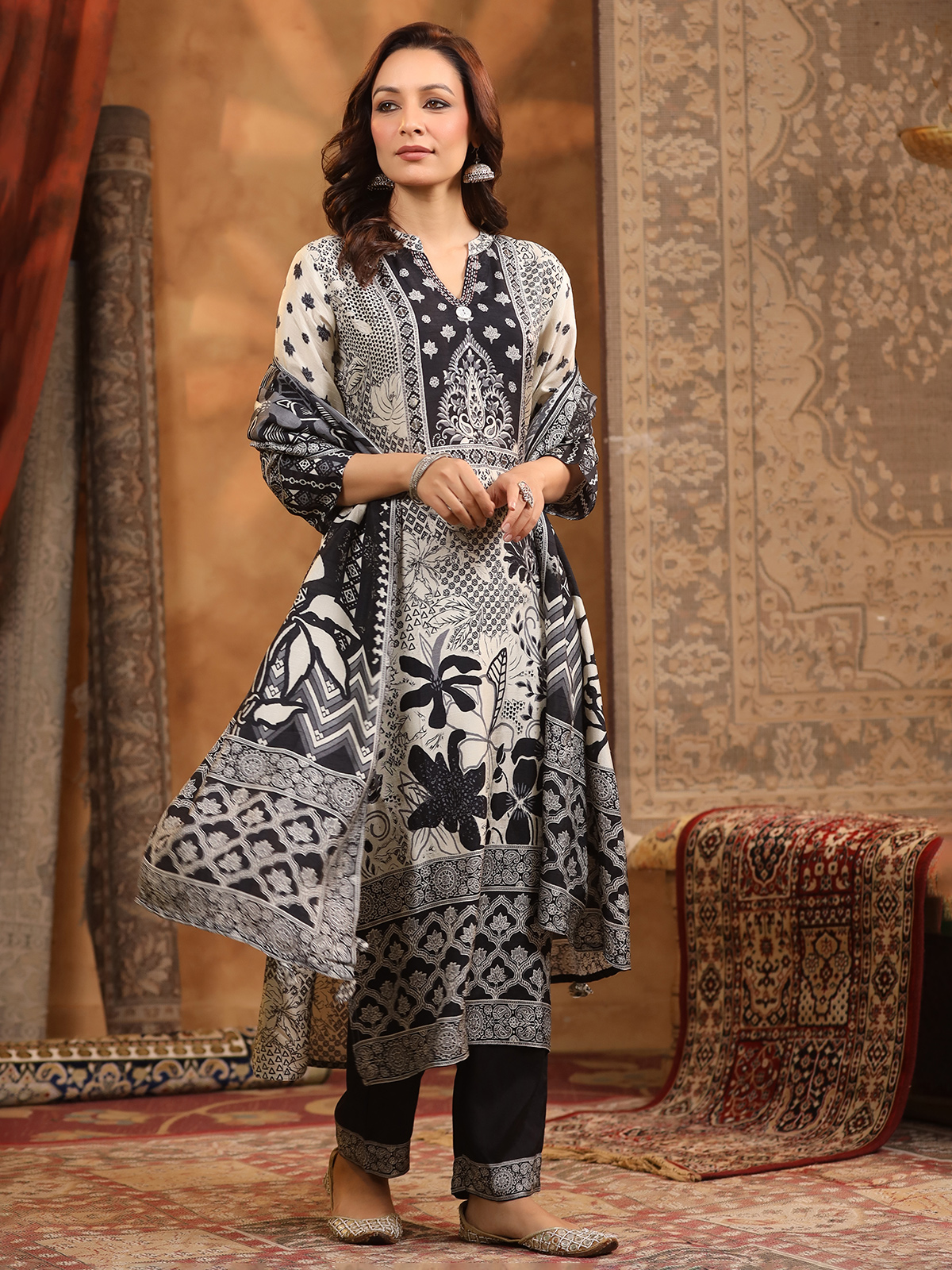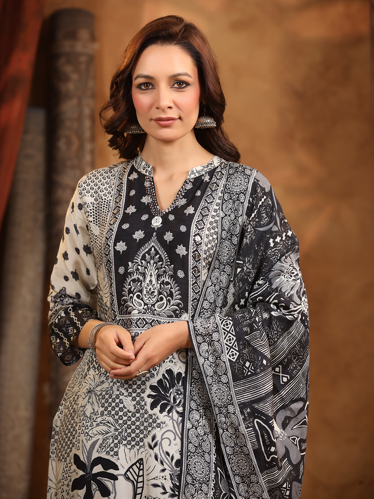 The white and black cotton silk kurti set, with its fashionable print design, mandarin collar, and quarter sleeves, is a classic outfit for any festive occasion. A unified and stylish appearance is produced by the matching pants and patterned dupatta.
