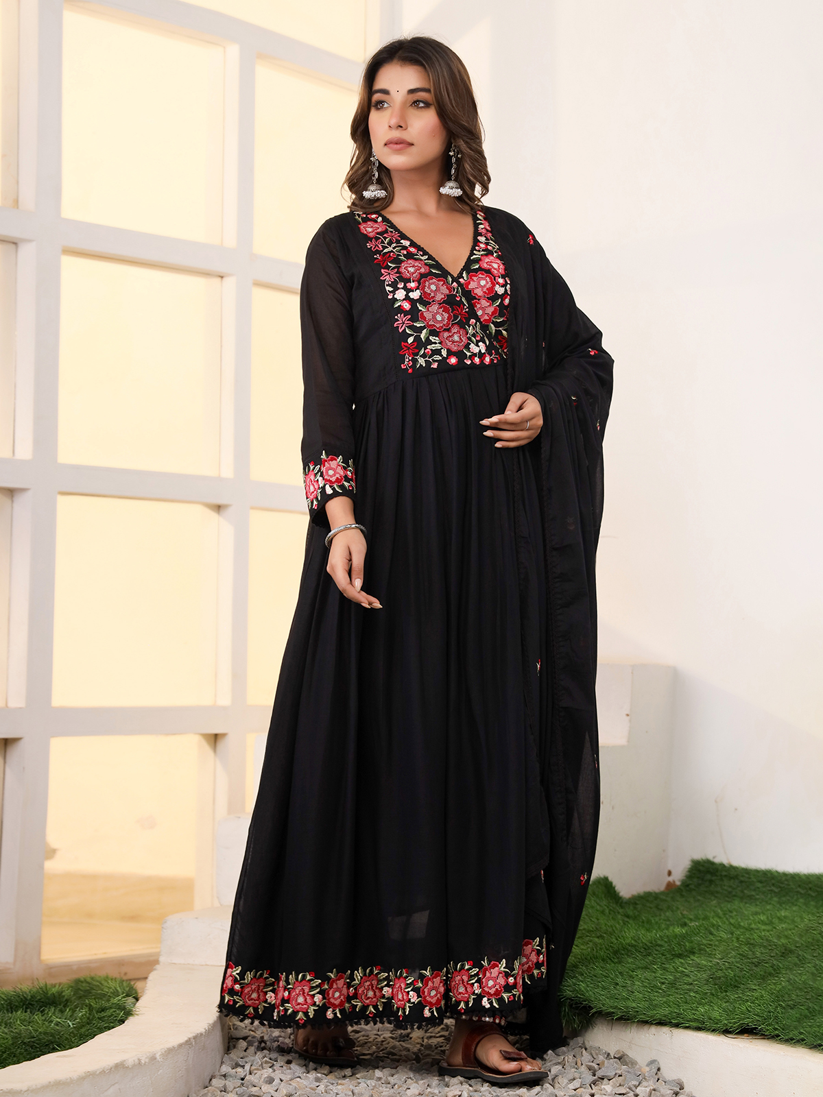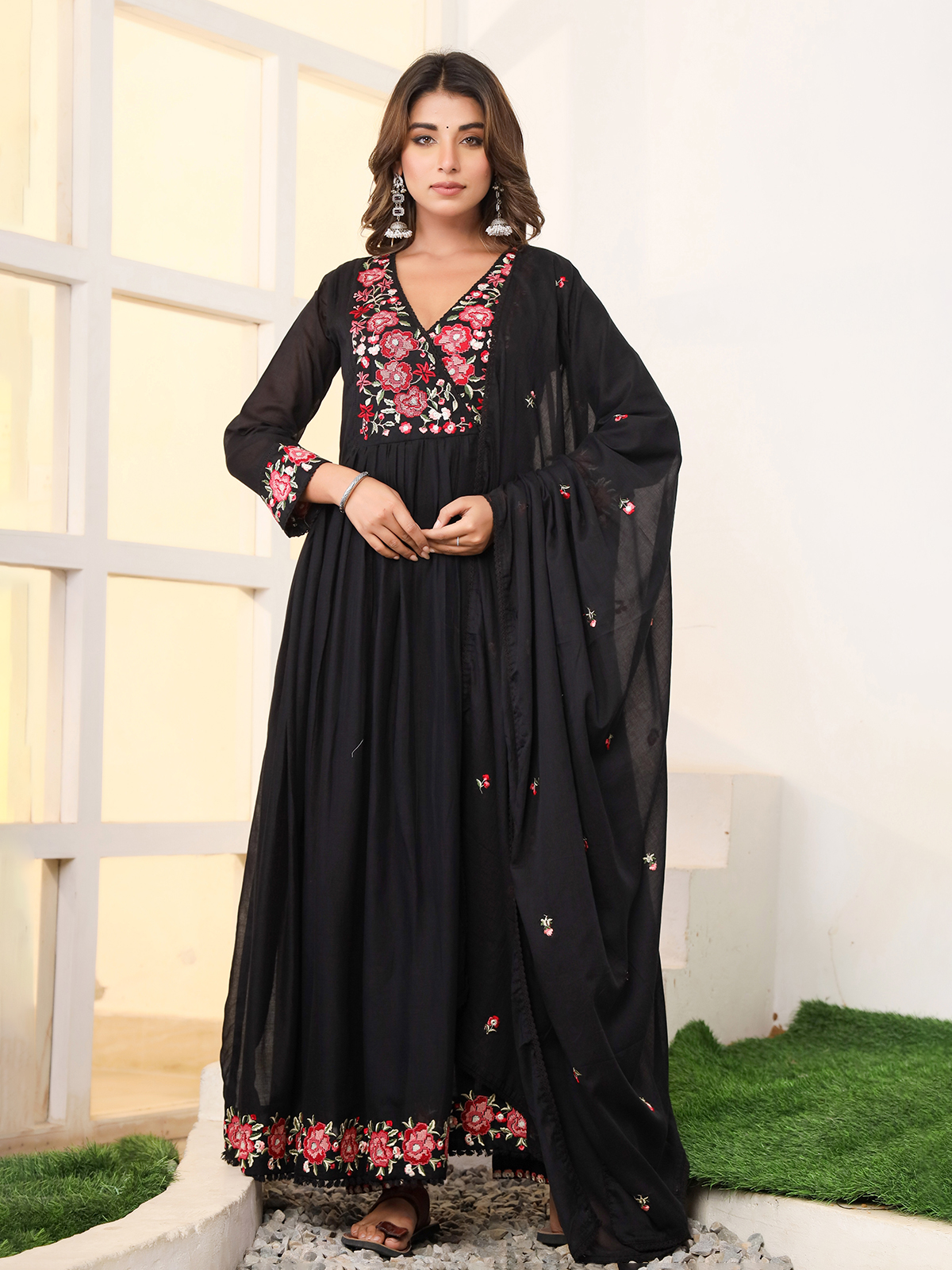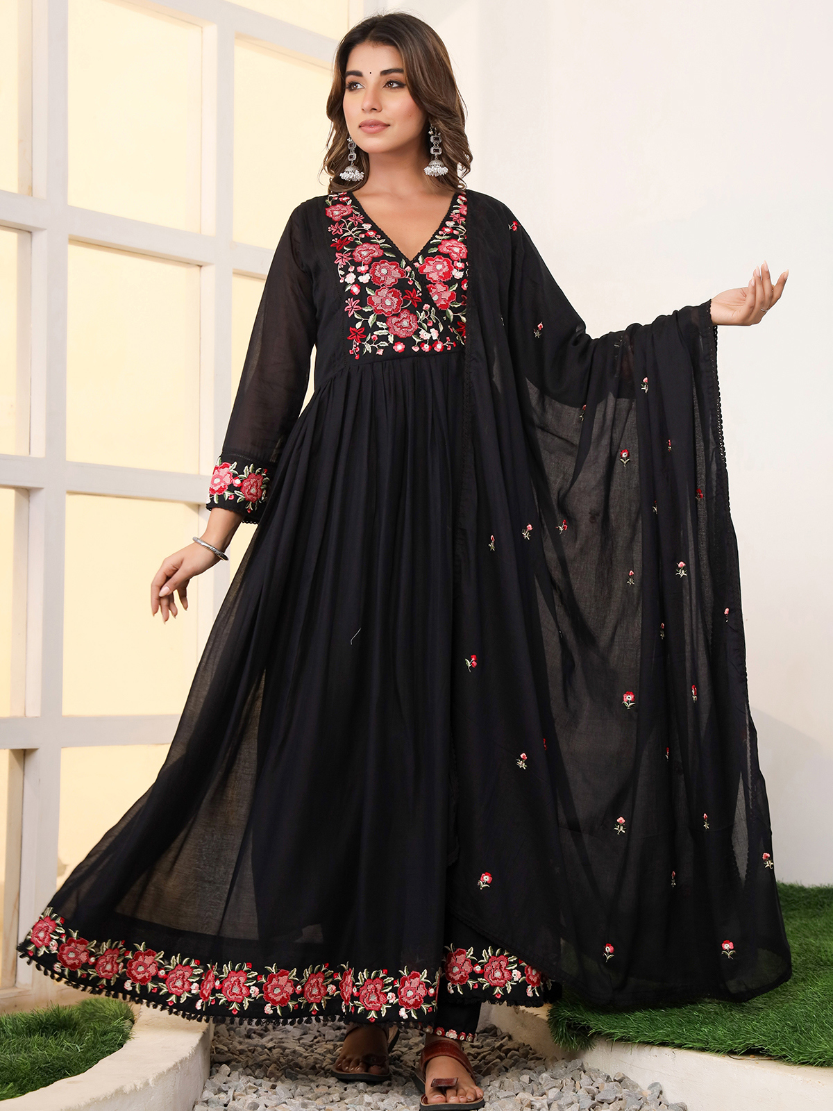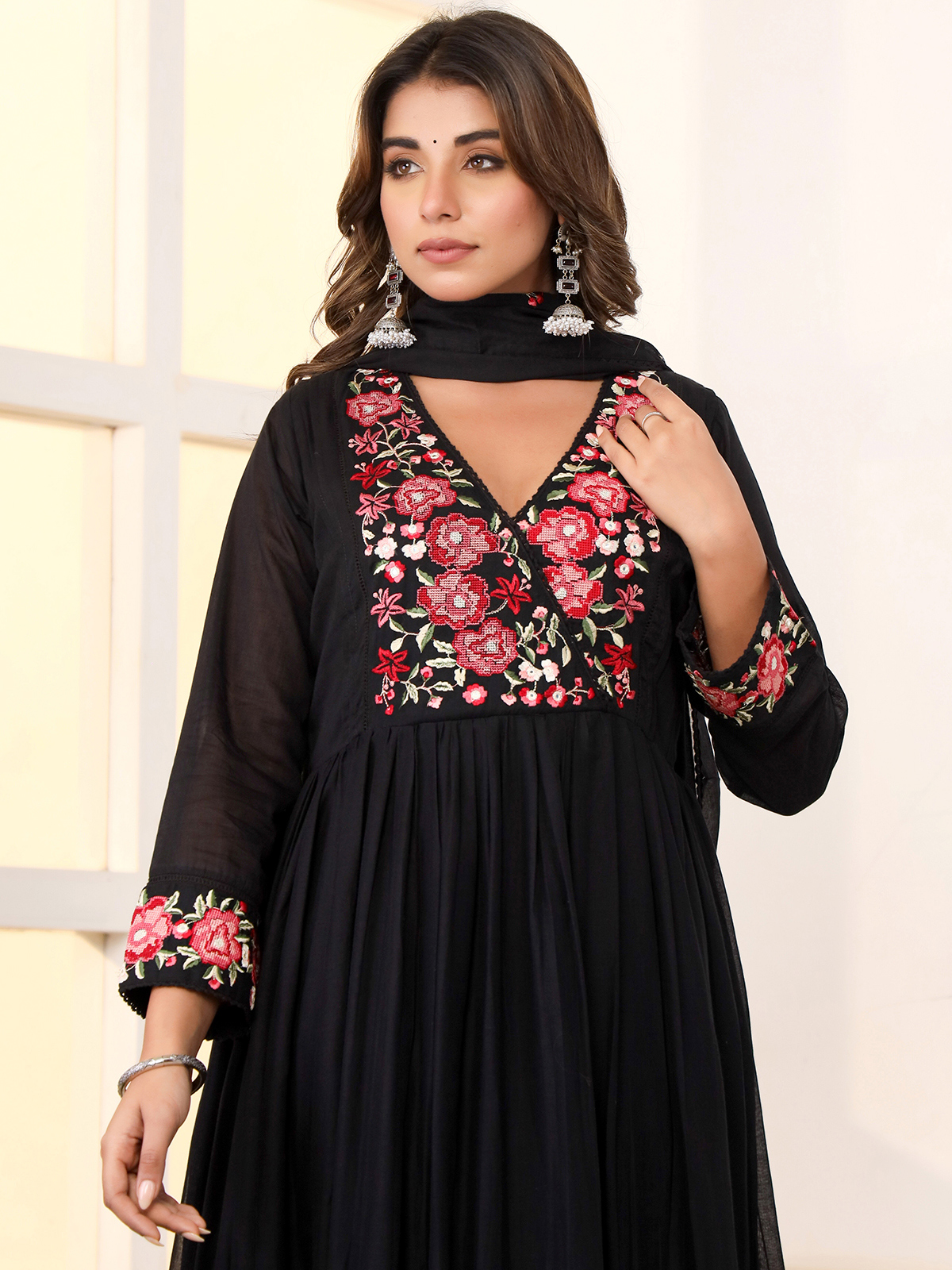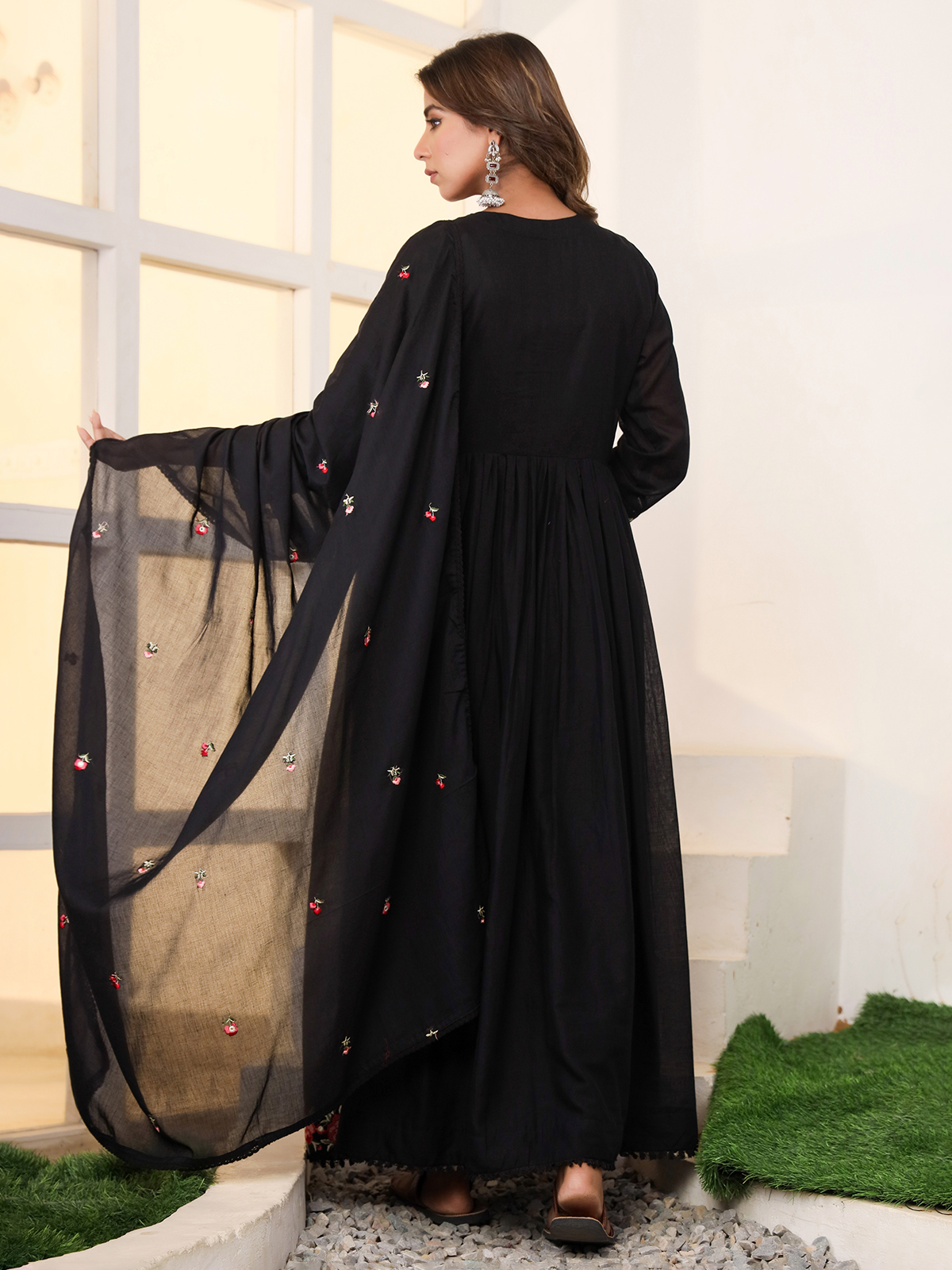 Deep black cotton kurti defines timeless allure, enriched with beads and aabla that glisten like stars across a night sky. Featuring a V neckline and quarter sleeves, it is styled with pant and dupatta, creating an elegant festive attire perfect for evening celebrations wrapped in subtle beauty and grace.