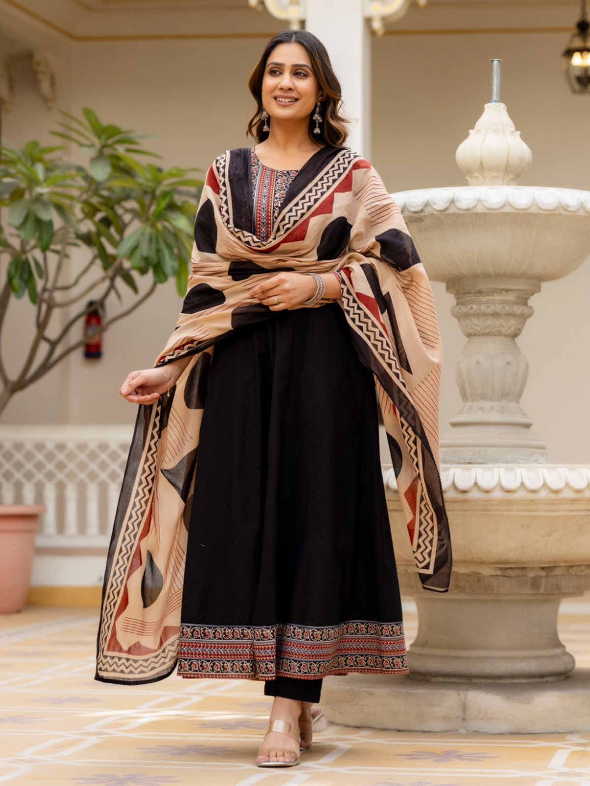 Confident and timeless, this printed black cotton kurti set brings striking festive appeal to your wardrobe. Crafted with a round neckline and quarter sleeves, it features shimmering beads and sequins work for graceful shine. Perfect for festive celebrations, it is paired with sleek pants and a coordinated printed dupatta for an elegant finish.