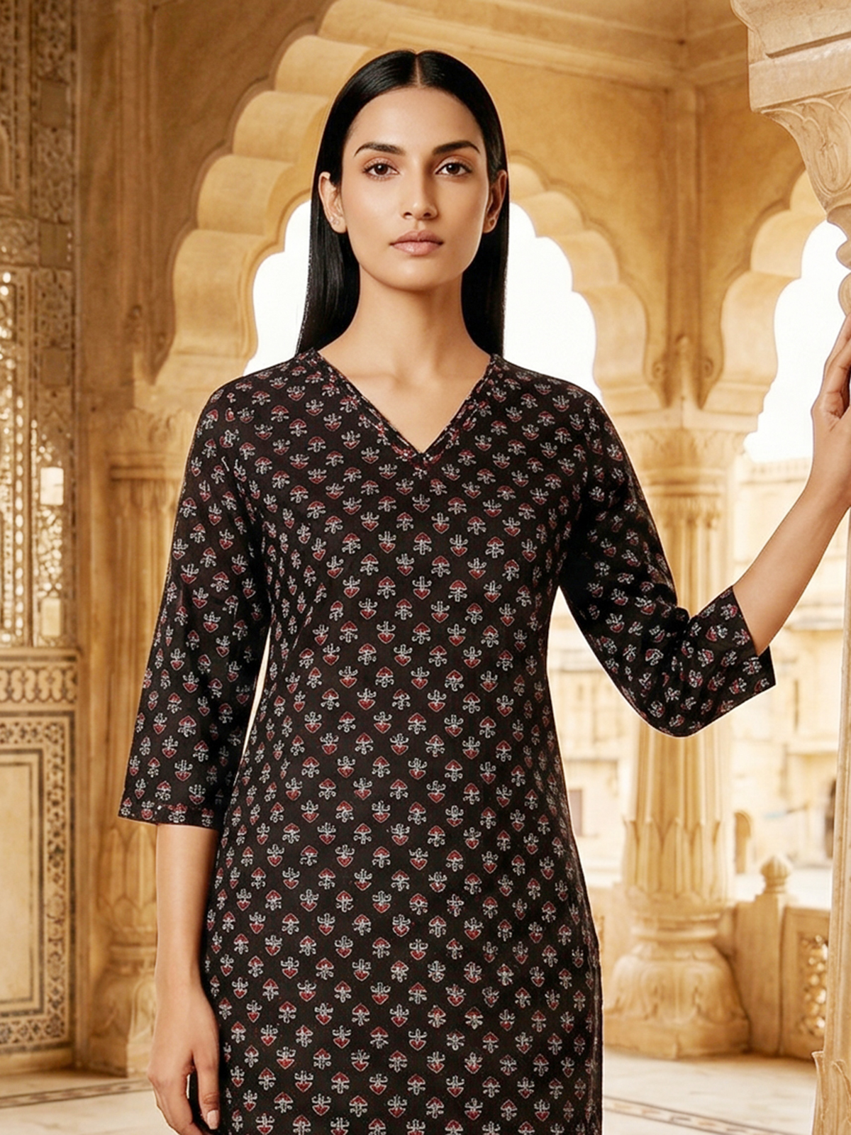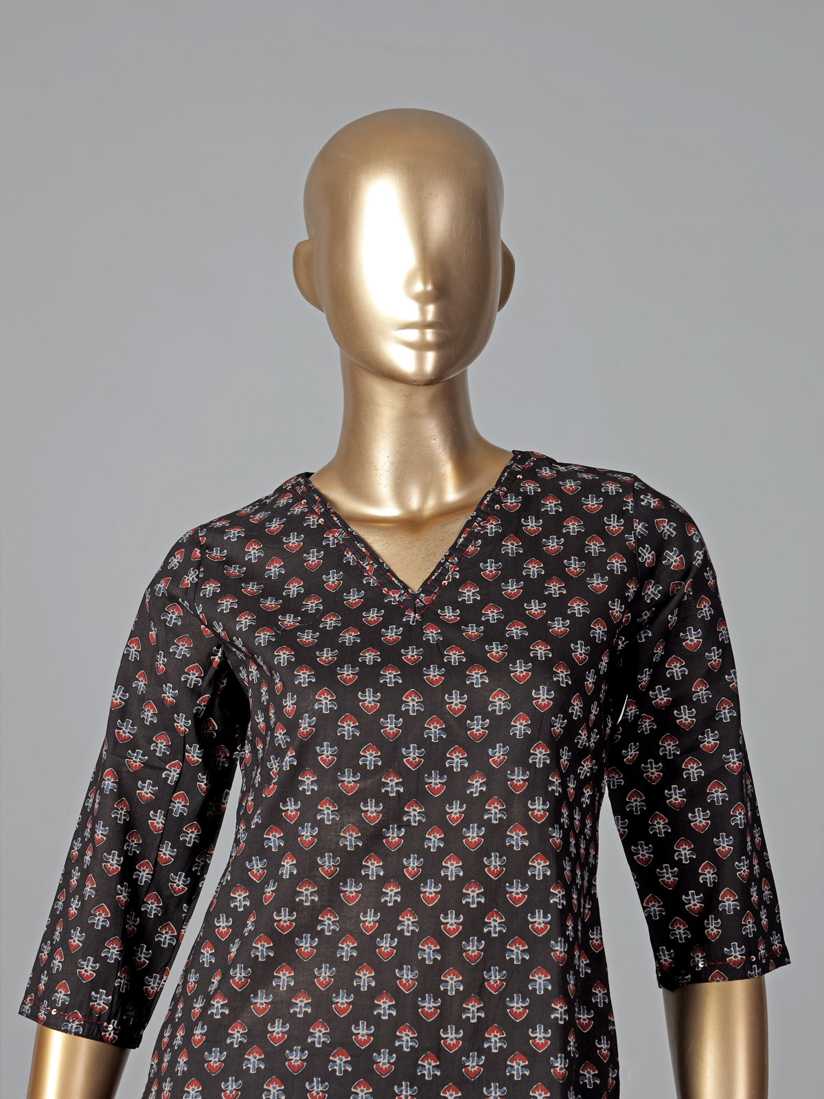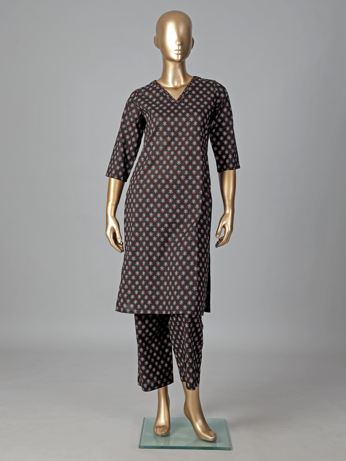 Elegant black tones define this cotton kurti set highlighted with subtle prints. Crafted in a straight cut silhouette with a V neckline and quarter sleeves, it offers relaxed comfort. Paired with pants, it is perfect for daily wear and casual outings.