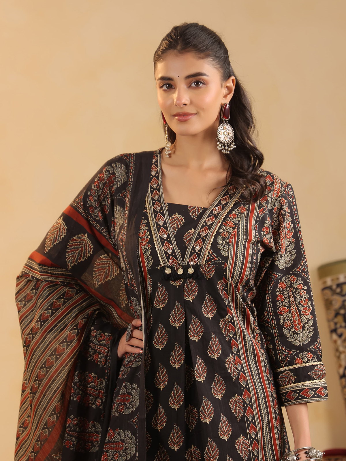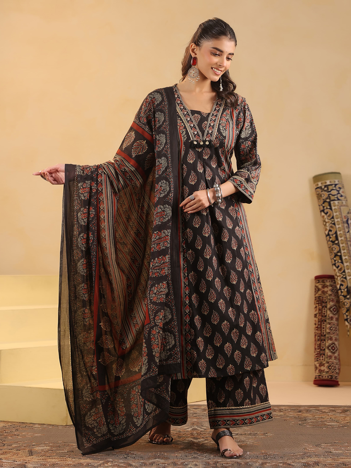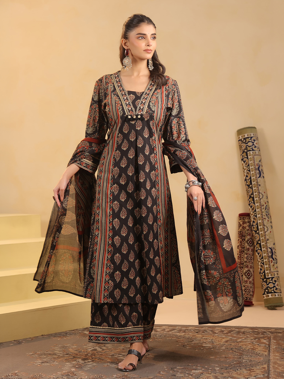 Rooted in traditional craftsmanship, this black cotton silk kurti set features hand block printed Ajrakh motifs enriched with sequins, thread, beads, coin, and zari work. Designed with quarter sleeves, it is paired with a flared palazzo and a matching dupatta, making it ideal for festive celebrations and Eid occasions.